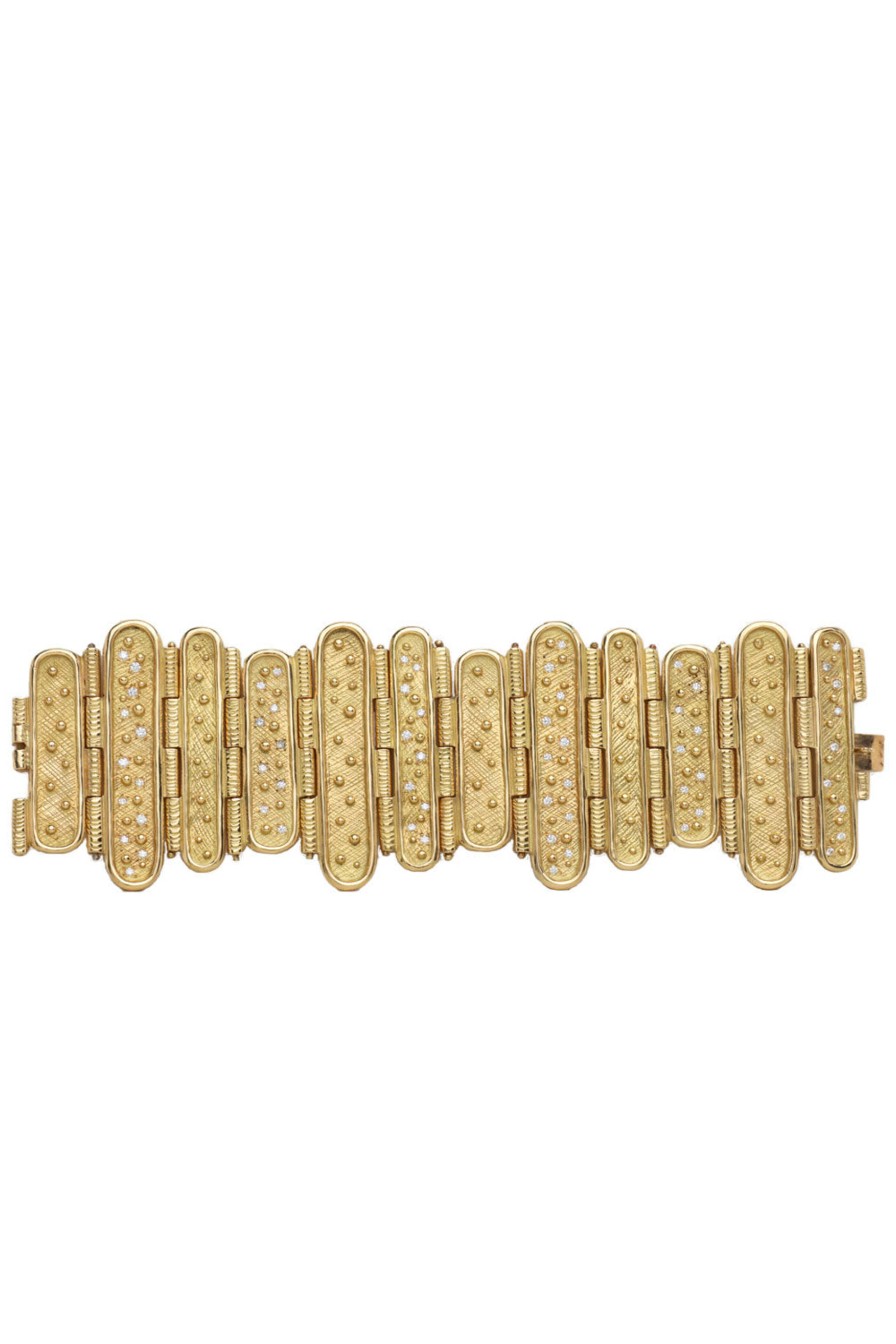 Garnazelle Majesty Diamond Cuff Bracelet. 18k yellow gold. Diamond. Multi width link design. 6 L. Longest link 2. Medium link 1.75. Shortest link 1.5. Open box clasp.