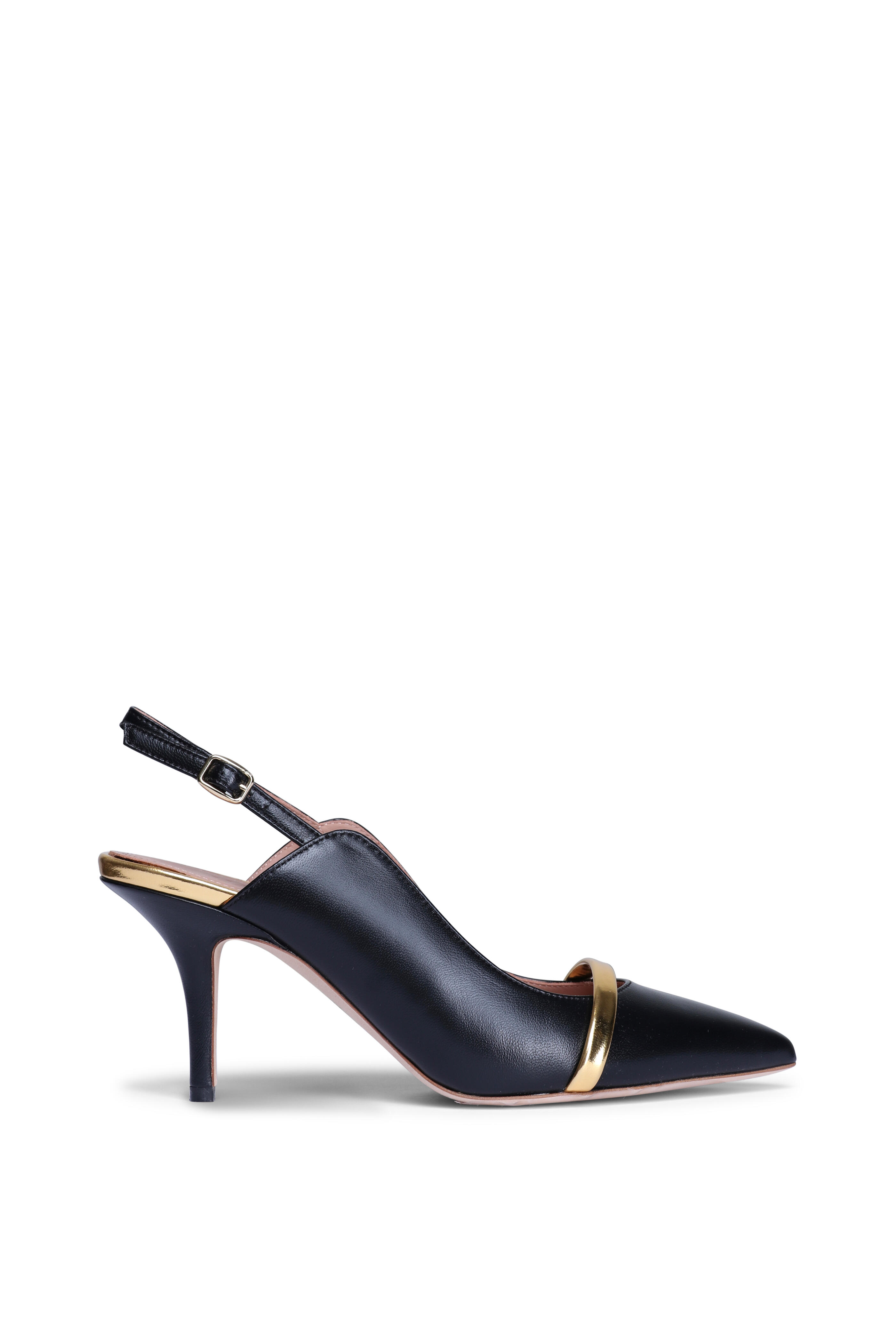 Leather upper, lining, and sole. Pointed toe. Adjustable slingback buckle. Slip-on style. Gold glossy, mirror strap. Padded footbed. Stiletto heel. Made in Italy. Heel measurement: 70mm.