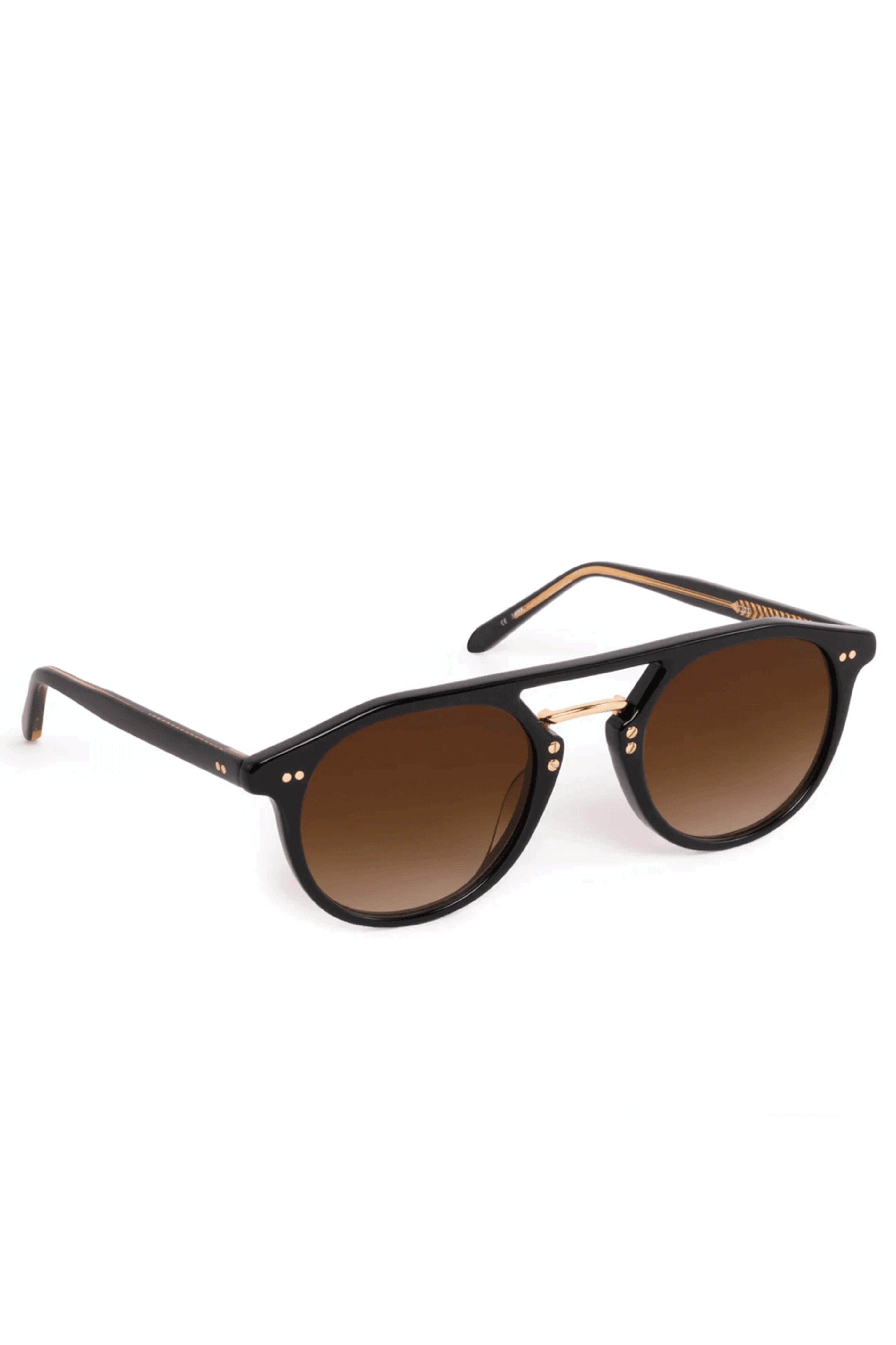 Krewe Markle Sunglasses in Black Tea. Custom, amber gradient lenses. Handcrafted, acetate frame features a glossy finish. 18k gold-plated stainless steel hardware. Riveted 5 barrel hinges. Adjustable temple wire allows for a customized fit. Anti-reflective and scratch-resistant coatings. Fit: 134mm. Eye: 51mm. Temple: 147mm. Bridge: 23mm. 100% UVA and UVB protection.