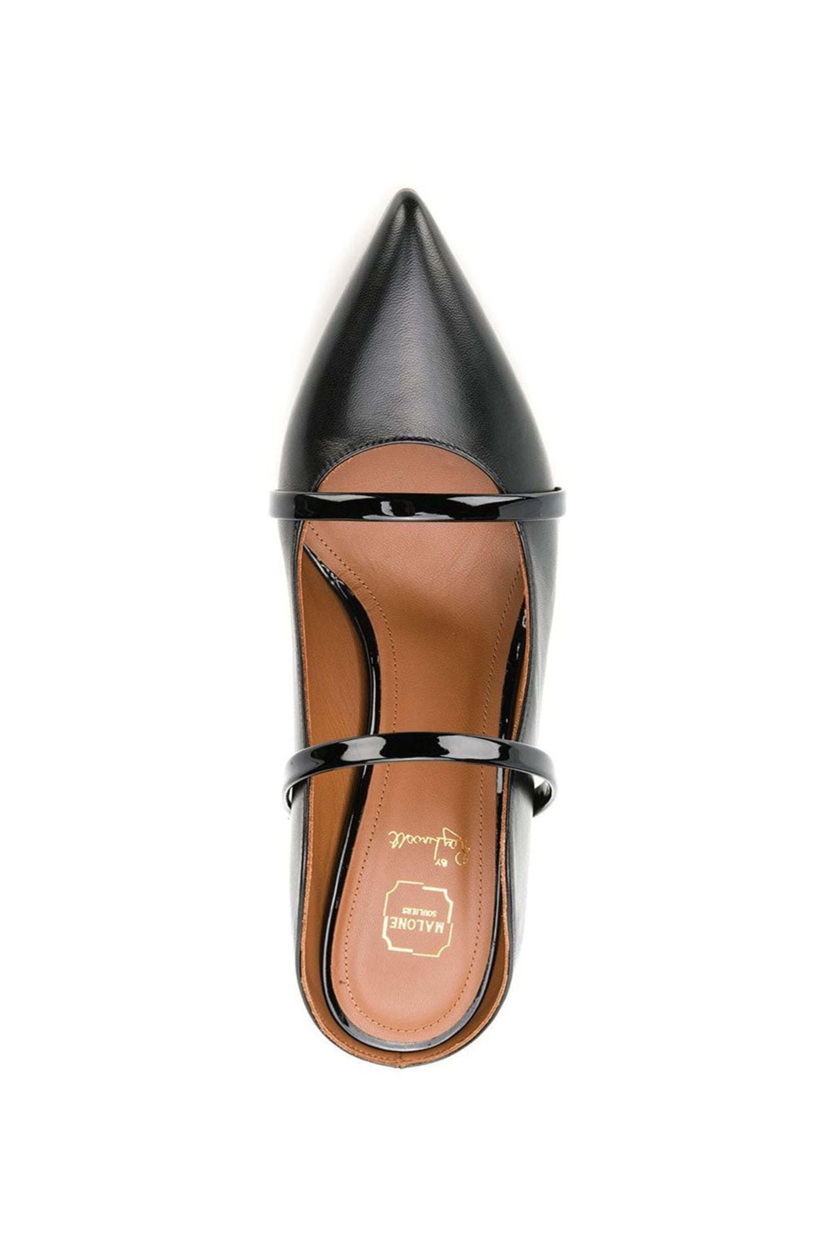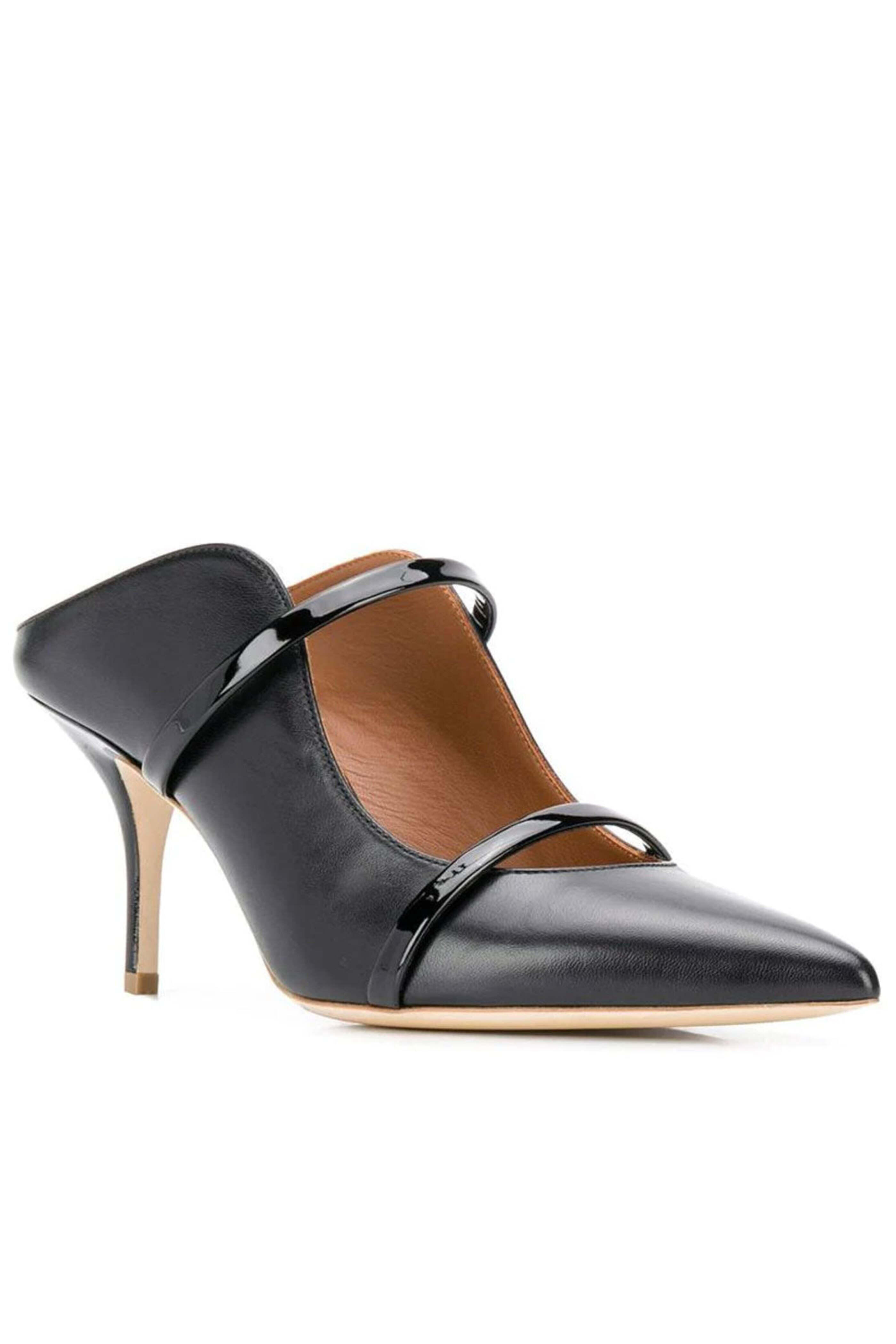 Malone Souliers Maureen 70 Pump in Black and Nude. Pointed toe. Slip on mule. Contrasting patent straps. 2.8 (70 mm) stiletto heel. Leather upper, lining, and sole. Padded footbed. Made in Italy.