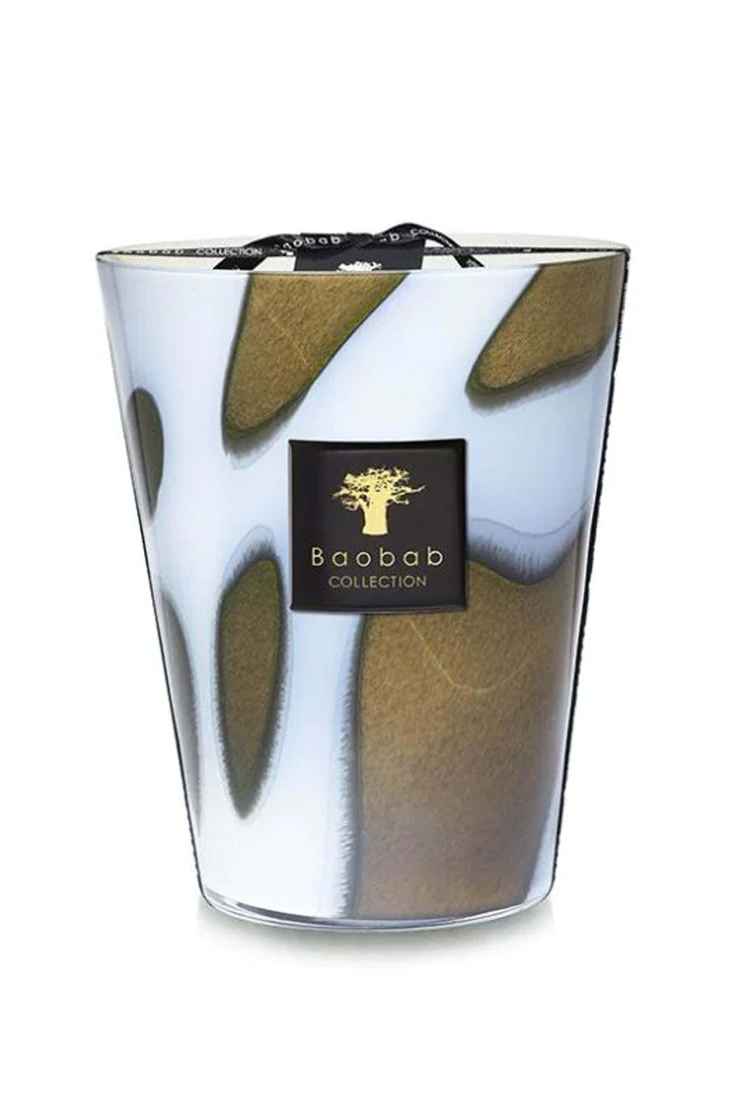 Baobab Stone Agate Max 24 Candle. Notes of Rhubarb, Acai Berry, Peony. Notes of mint and verbena. Burn time: 400 hours. One five-wick candle. Glass/paraffin wax. 9.4".