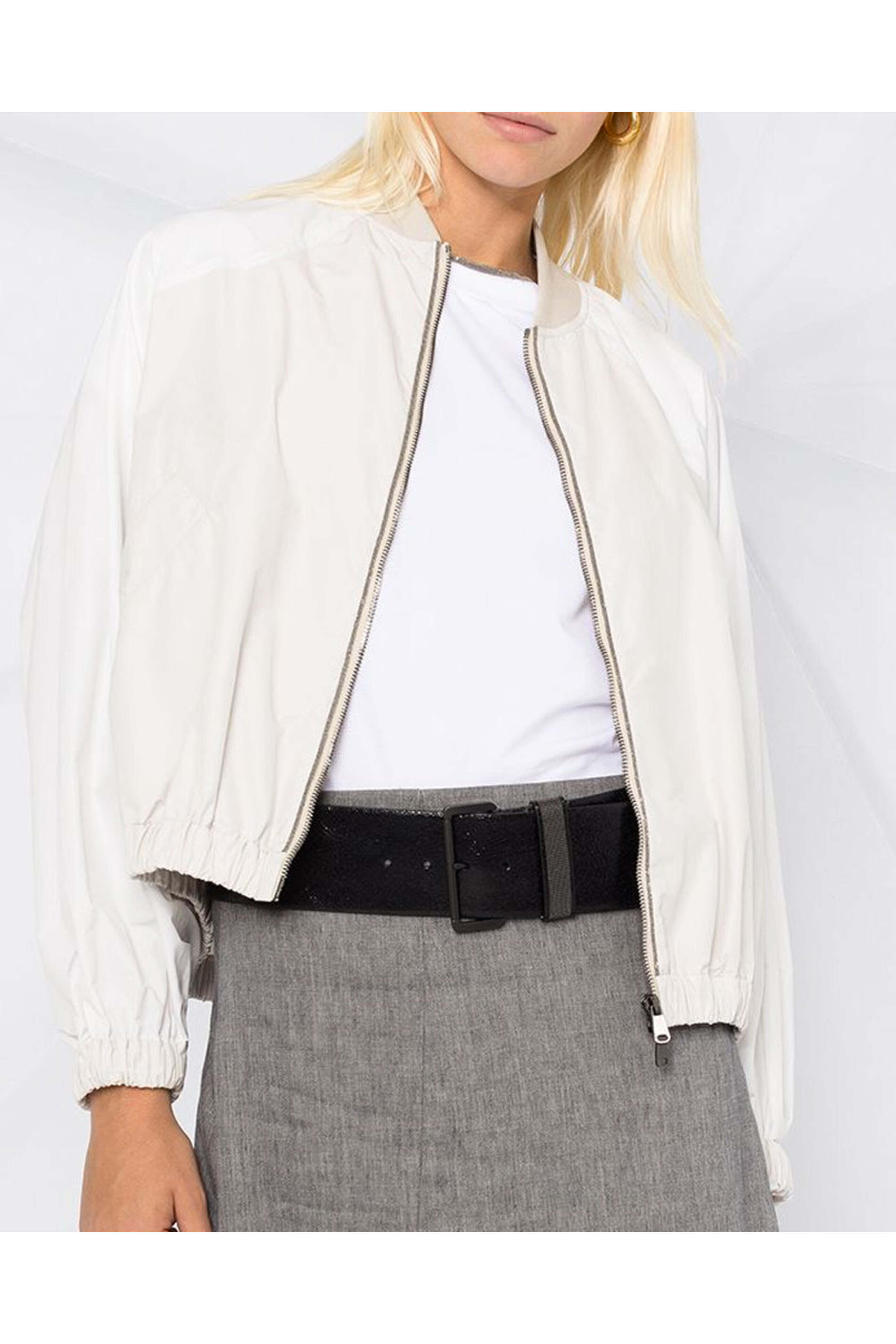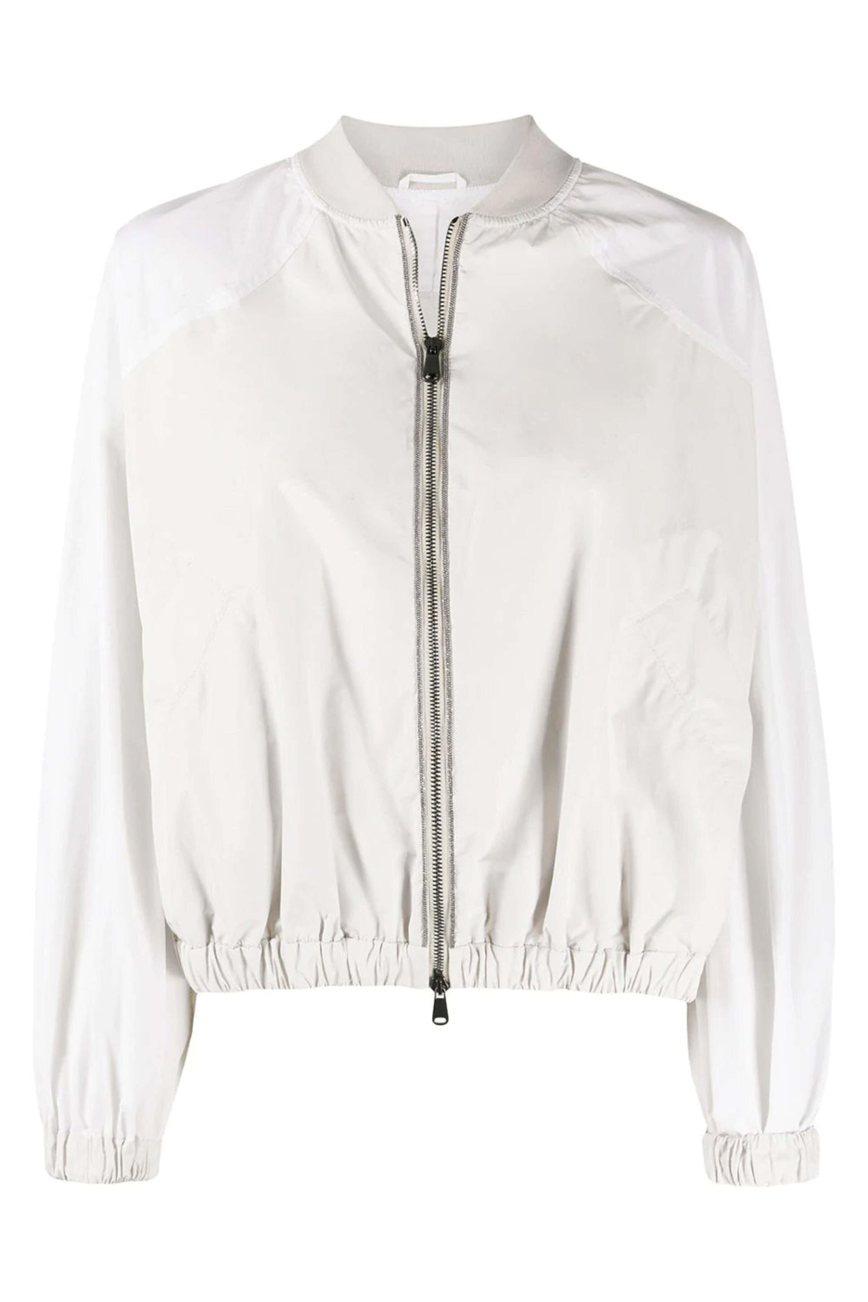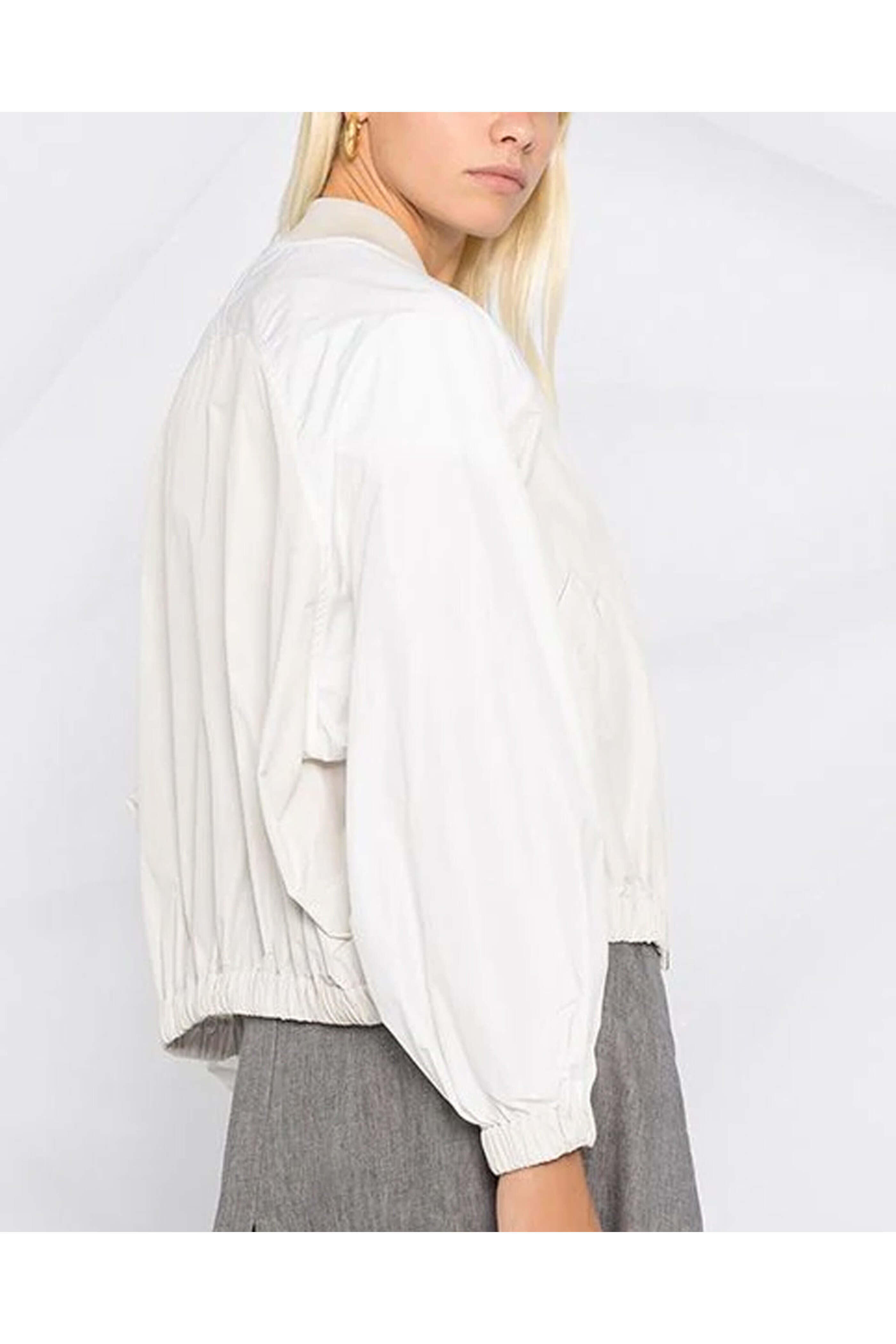 - Brunello Cucinelli White and Pebble Paneled Taffeta Bomber Jacket
