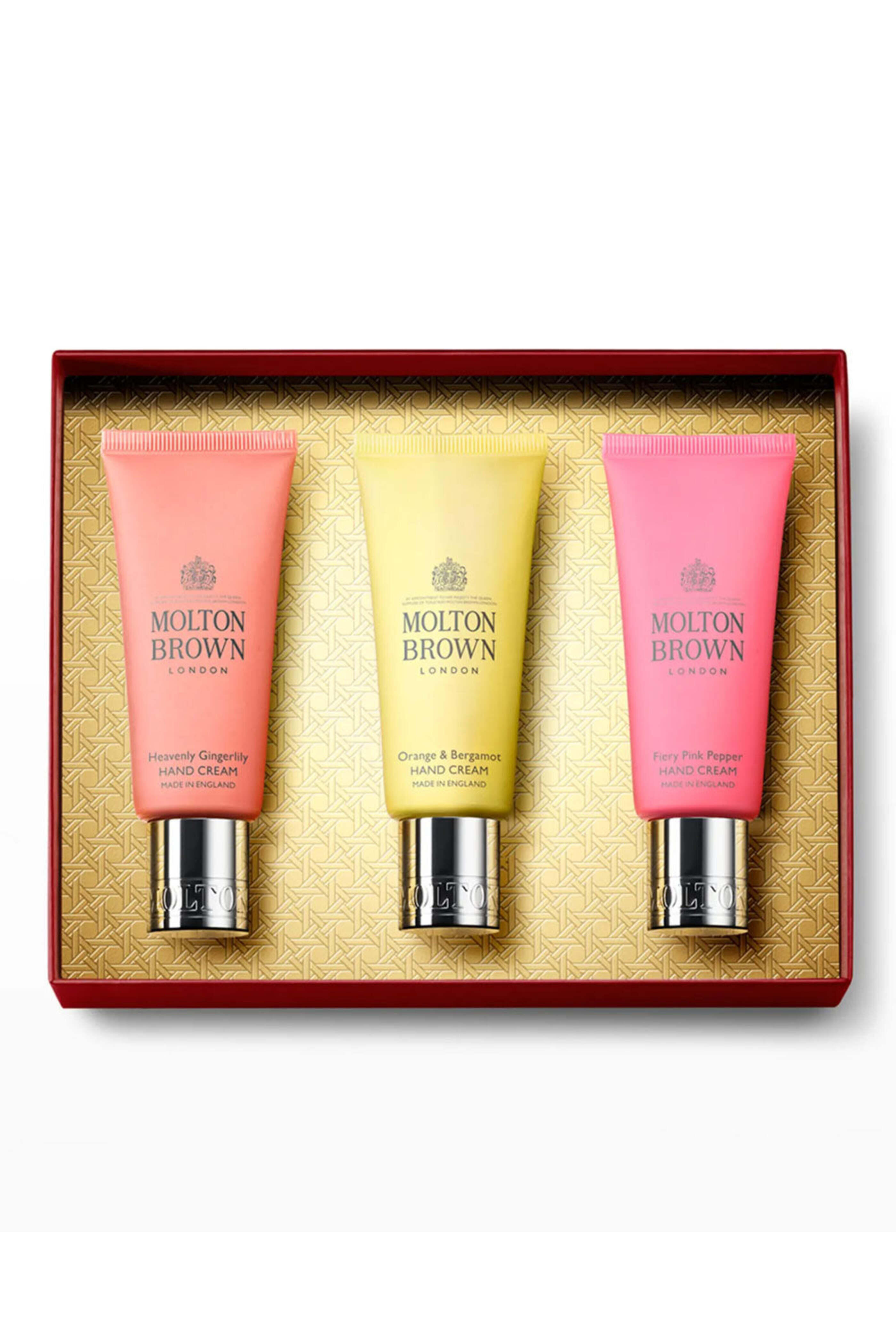 Molten Brown Hand Cream Set. Heavenly Gingerlily Hand Cream, 1.4 oz.. Orange & Bergamot Hand Cream, 1.4 oz.. Fiery Pink Pepper Hand Cream, 1.4 oz.
