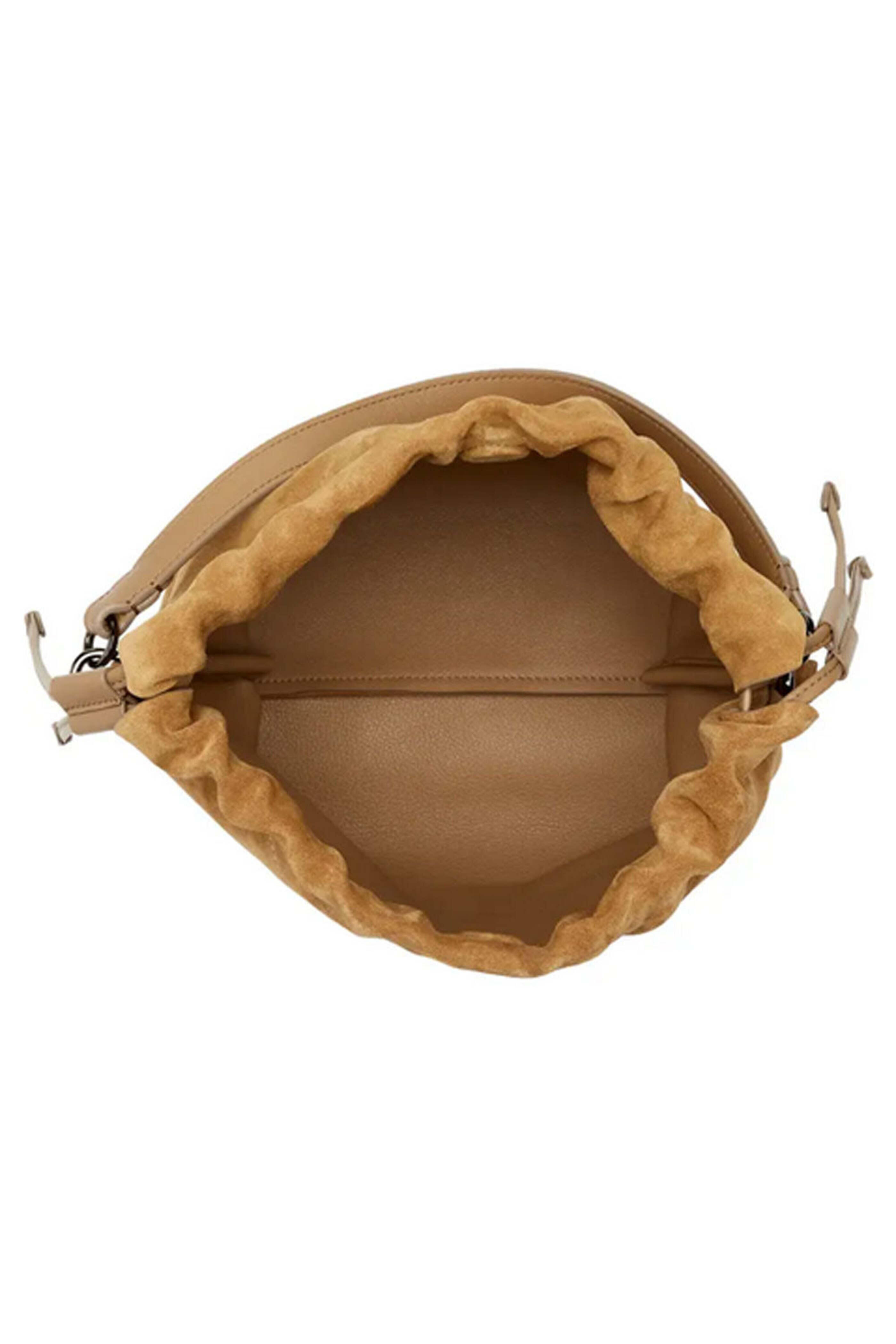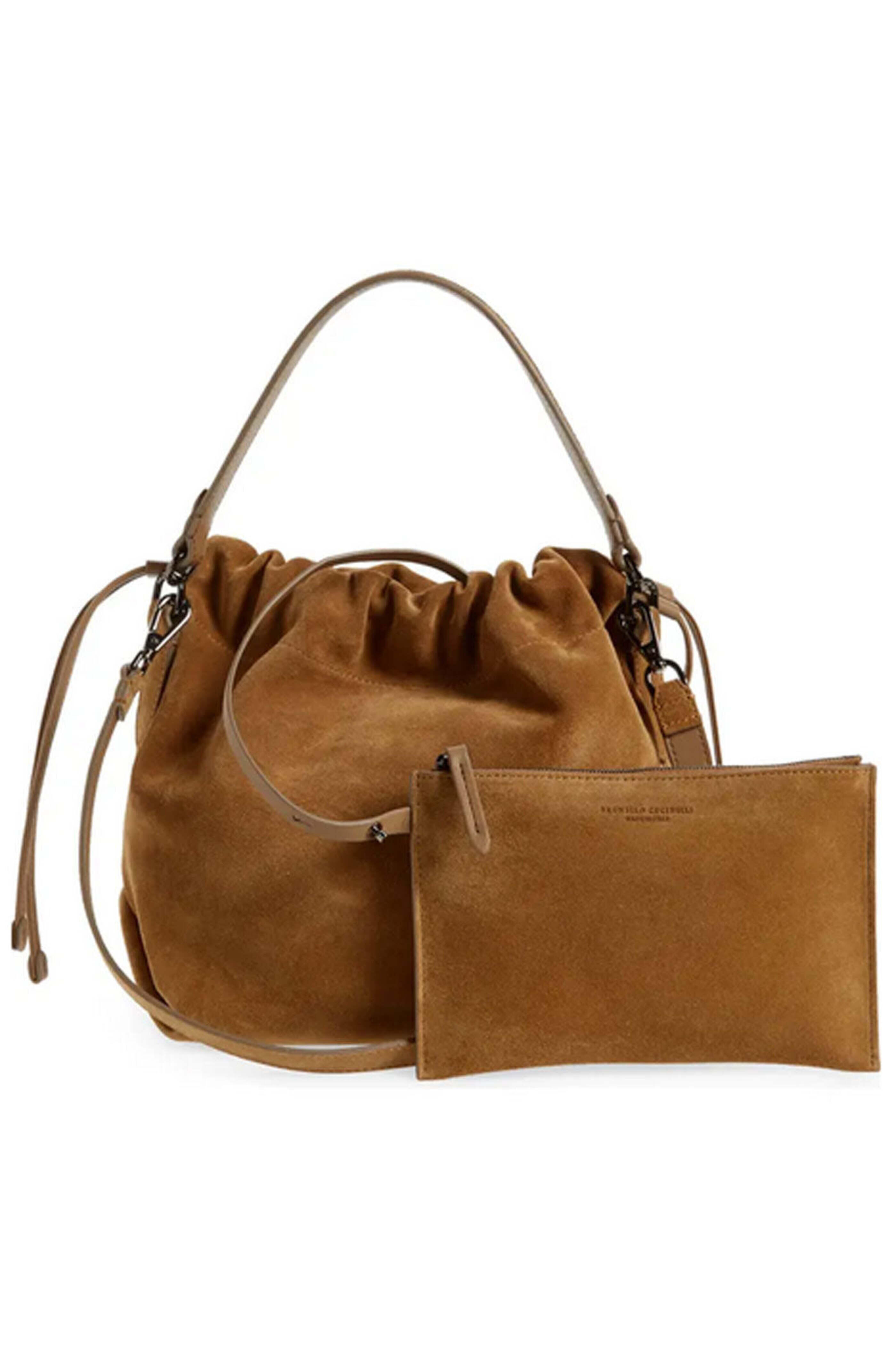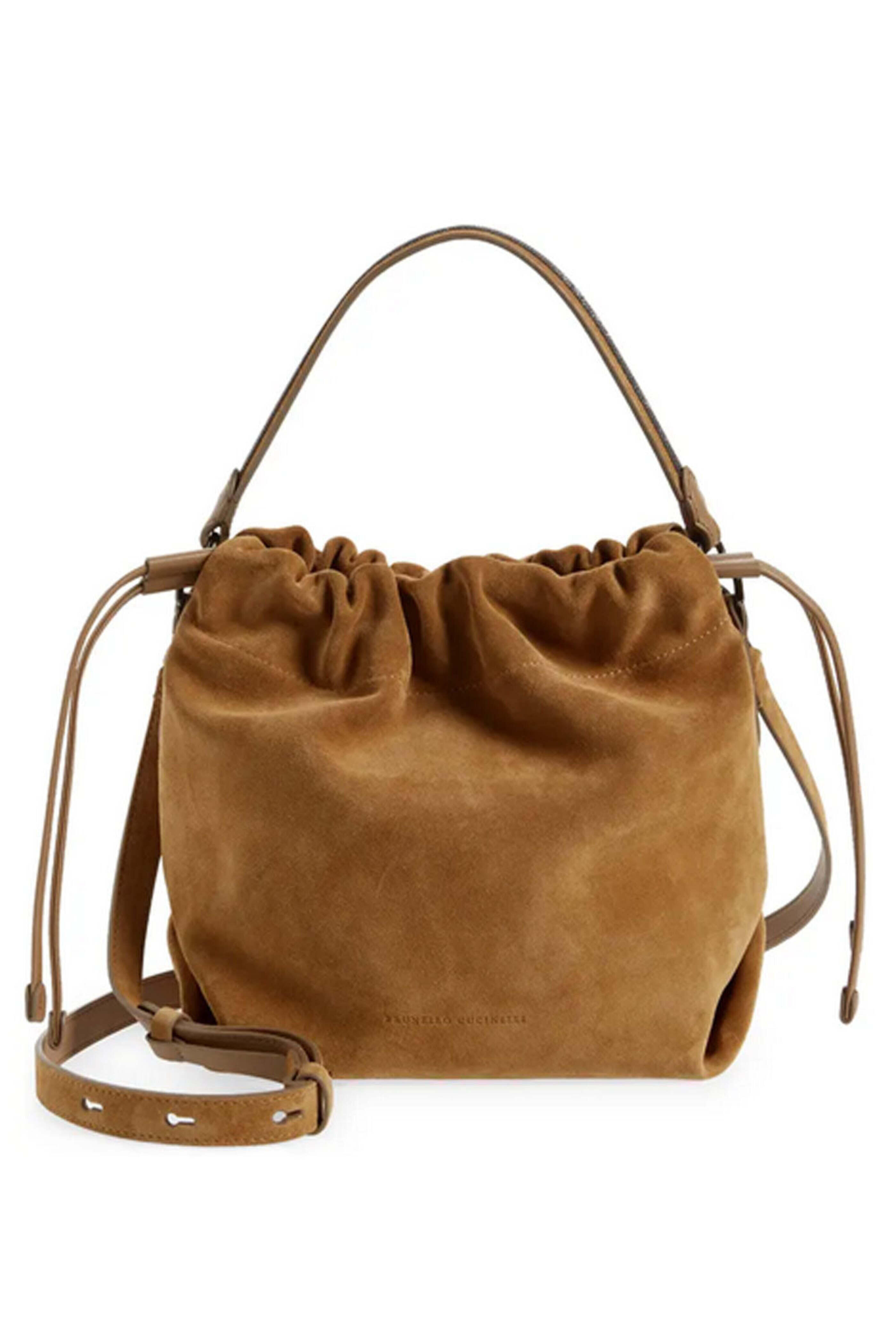 - Brunello Cucinelli Caramel Suede Drawstring Bucket Bag