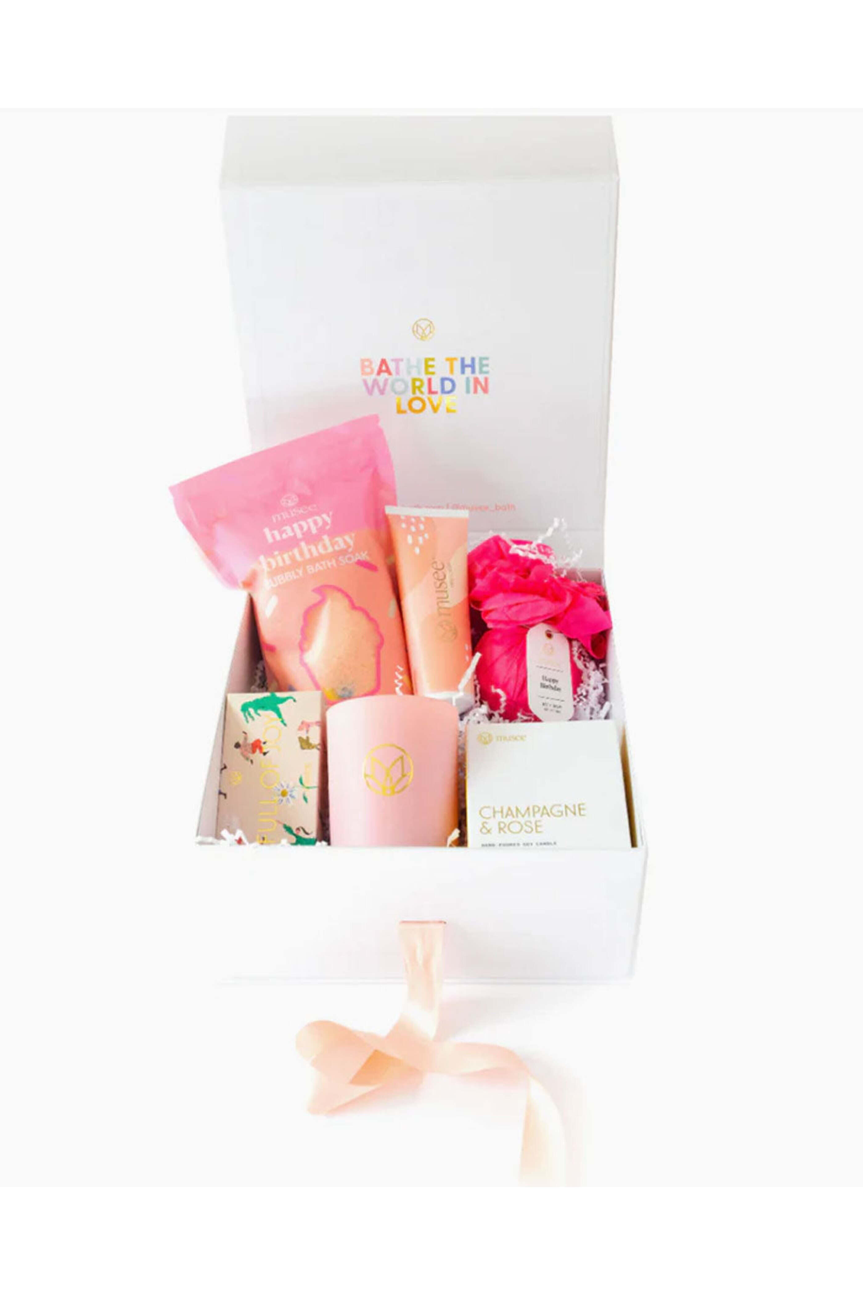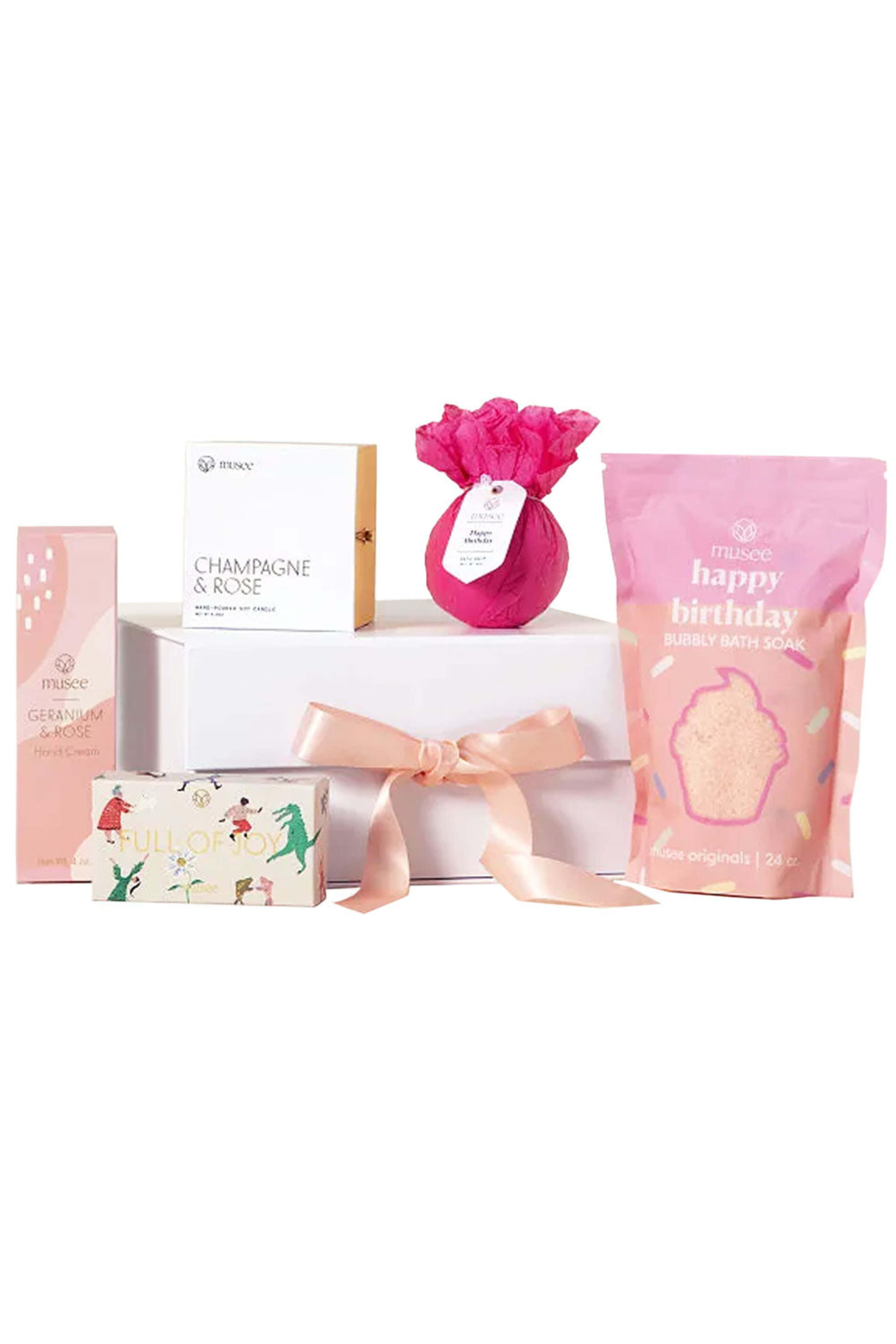 Musee Ultimate Birthday Gift Set. Happy Birthday Bath Soak. Happy Birthday Bath Balm. Geranium & Rose Hand Cream. Champagne + Rose Candle. Full of Joy Bar Soap. Made in USA. Store in cool and dry environment.