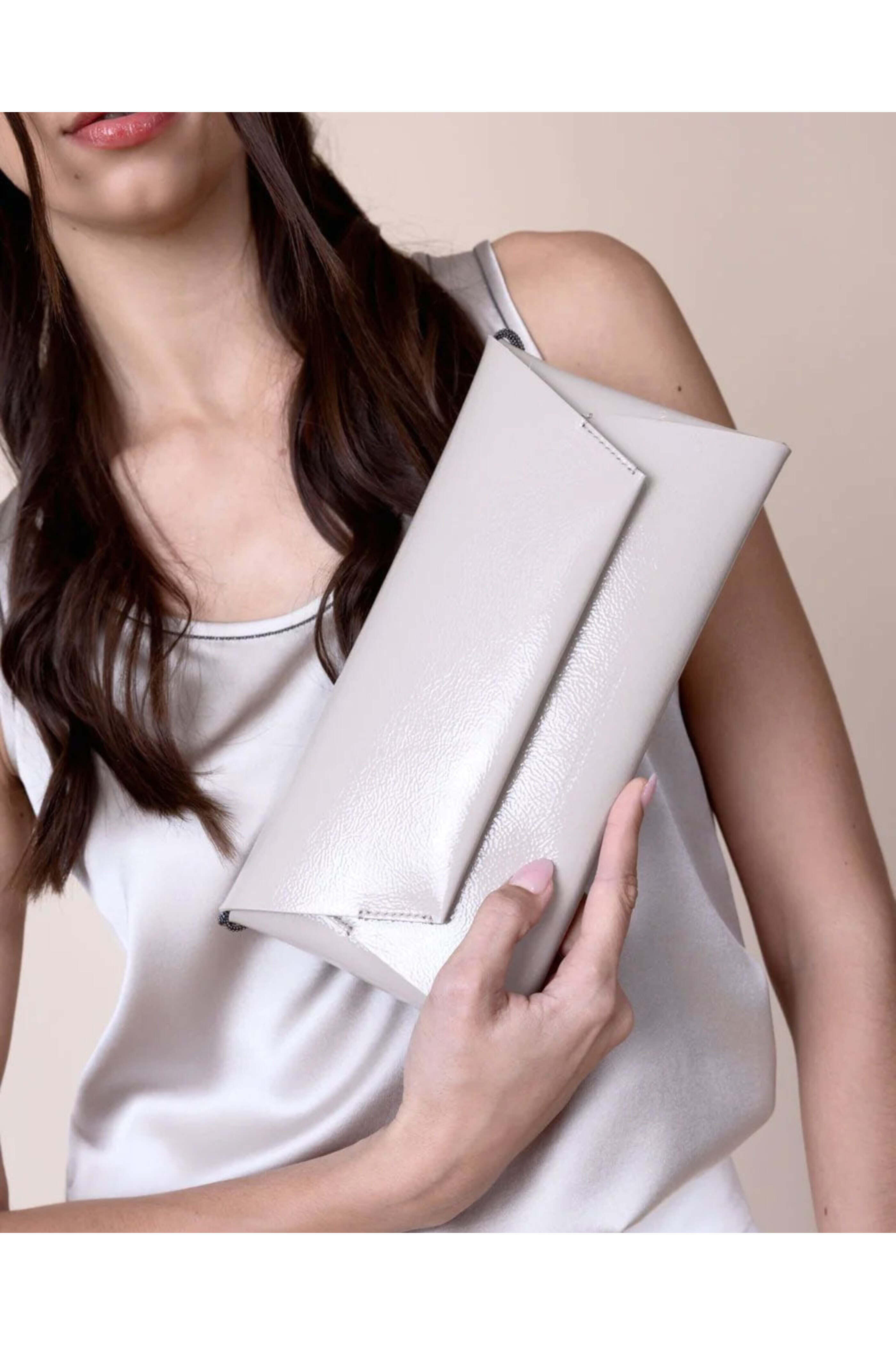 - Brunello Cucinelli Patent Leather Foldover Clutch in Piuma