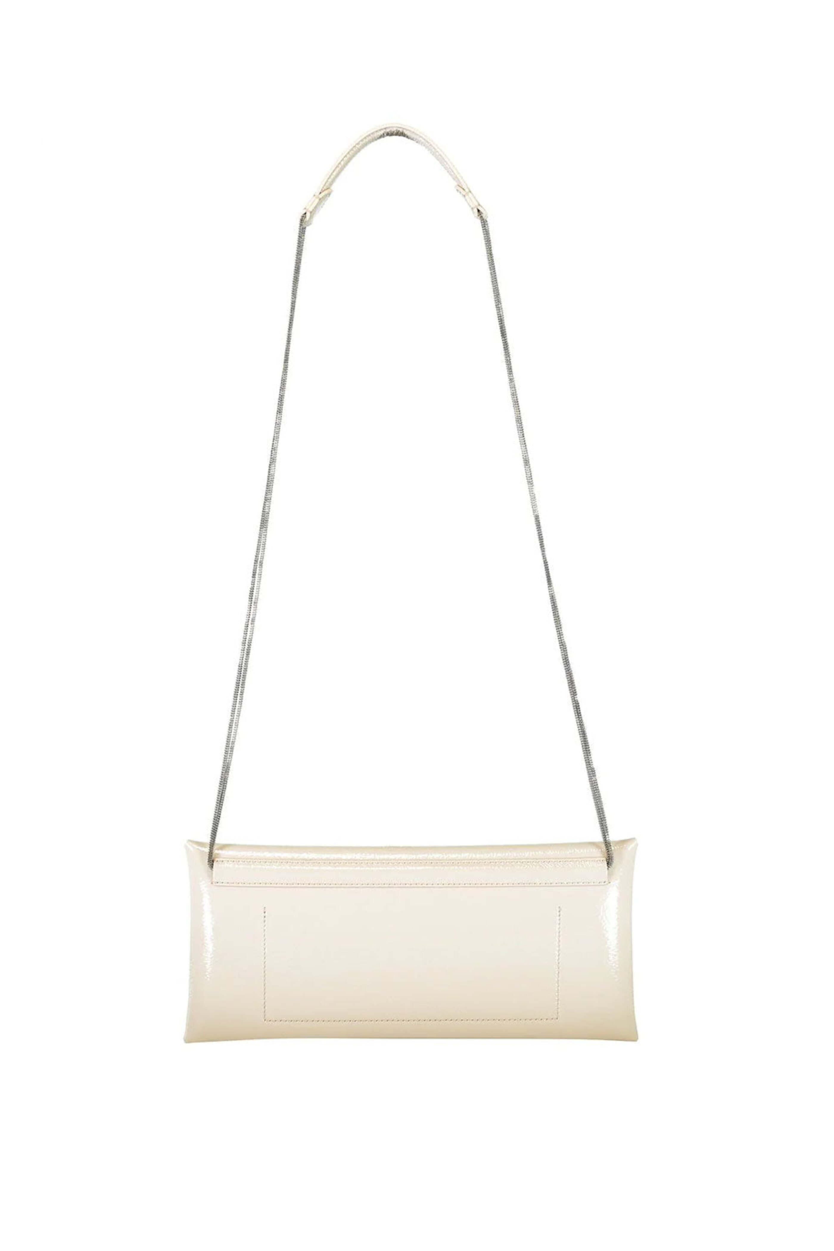 Brunello Cucinelli Patent Leather Foldover Clutch in Piuma. Flap top with magnetic closure. Monili chain with leather shoulder strap. 6 card slots. Bill slot. Crackle finish patent leather outer. Suede lining. 11W x 5H x 1D. 20 strap drop. Made in Italy.