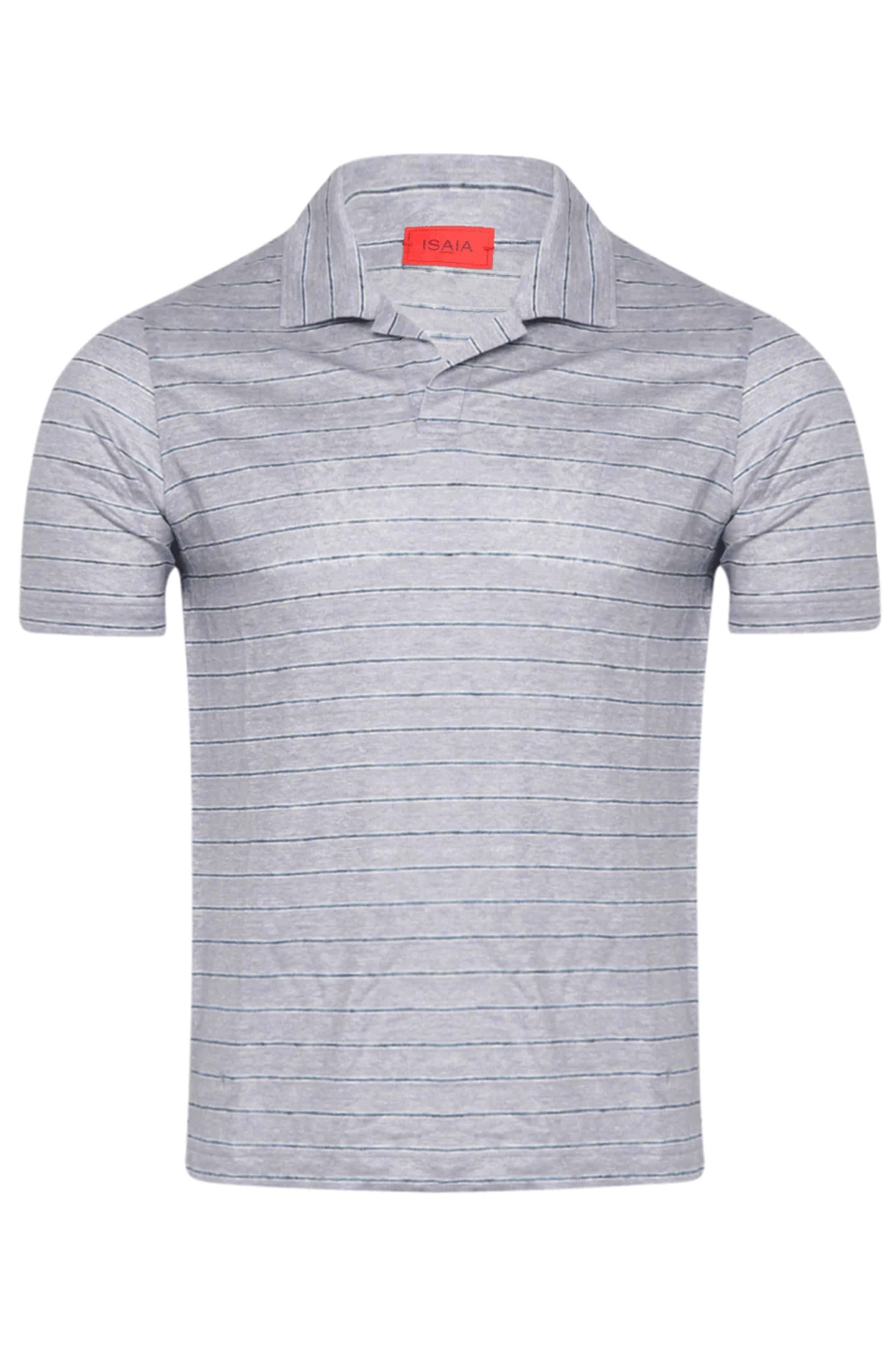 Isaia Open Blue Jersey Stripe Polo. Johnny collar. Buttonless placket. Short sleeves. Pullover style. Made in Italy . 100% linen.