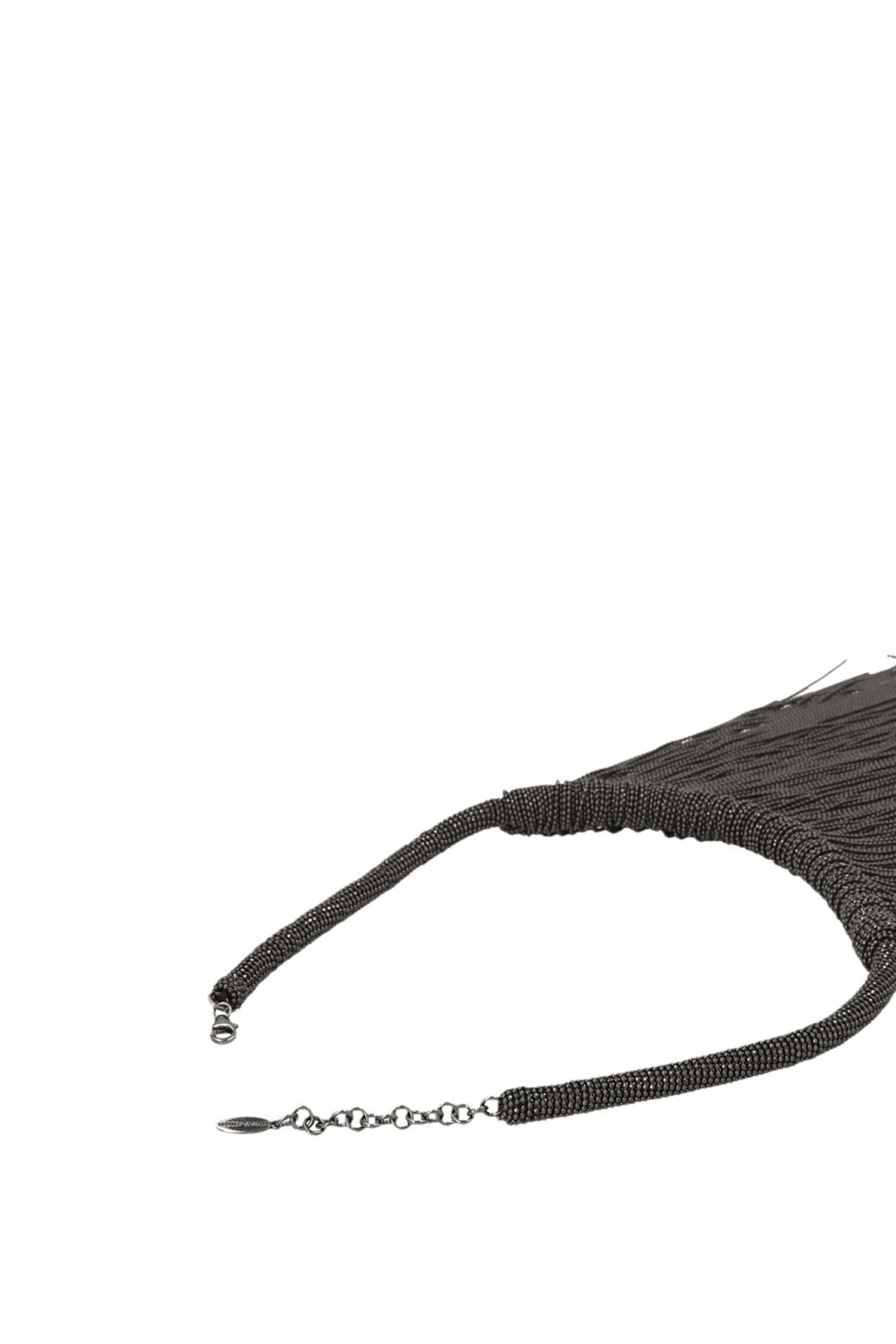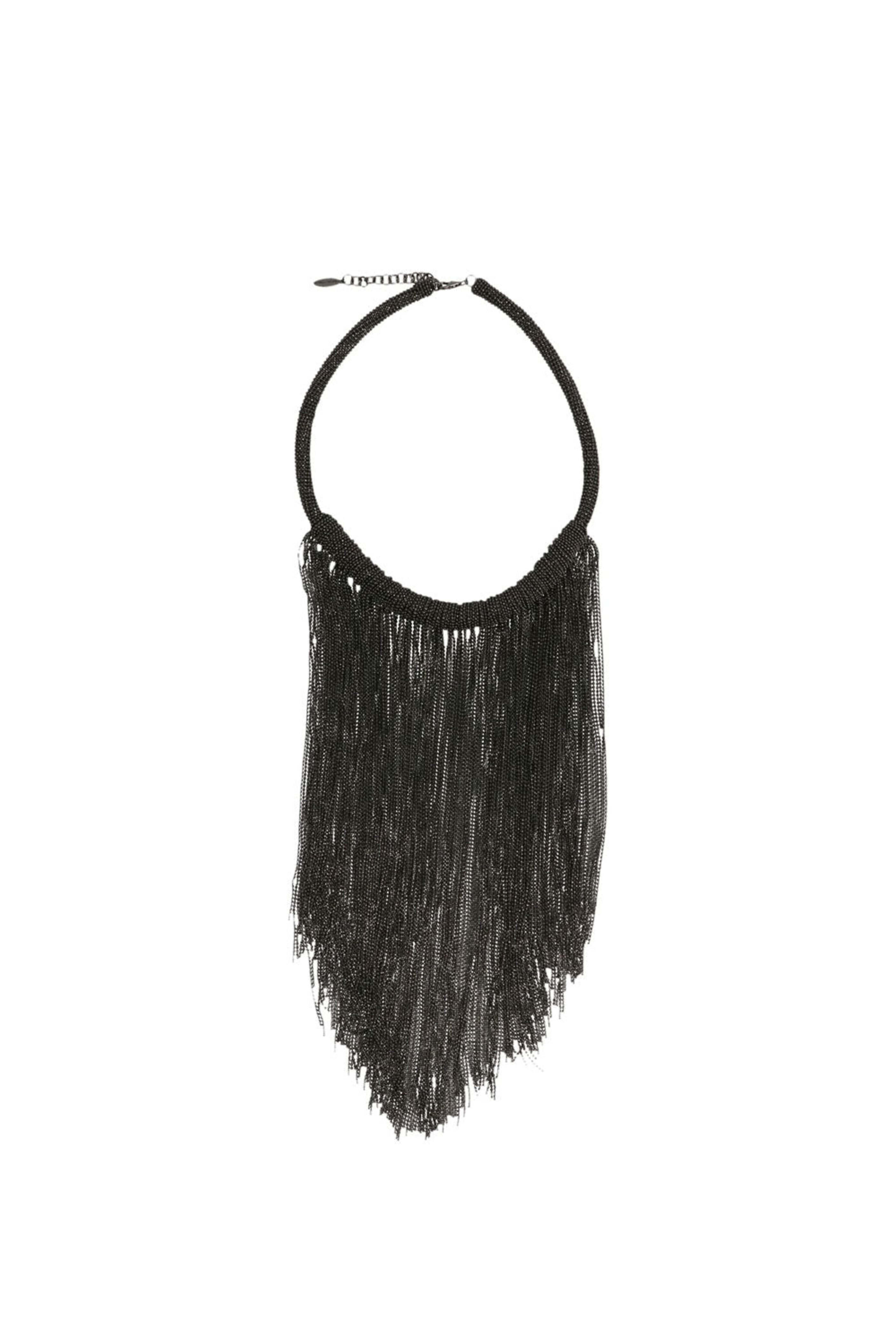 Brunello Cucinelli Monili-Chain Embellished Necklace in Black. Plated brass. Monili beading. Fringe design. 0.31 W x 15.7- 17.5 L. Pedant measures 8.7 L x 5.5 W. Hook closure. Made in Italy.