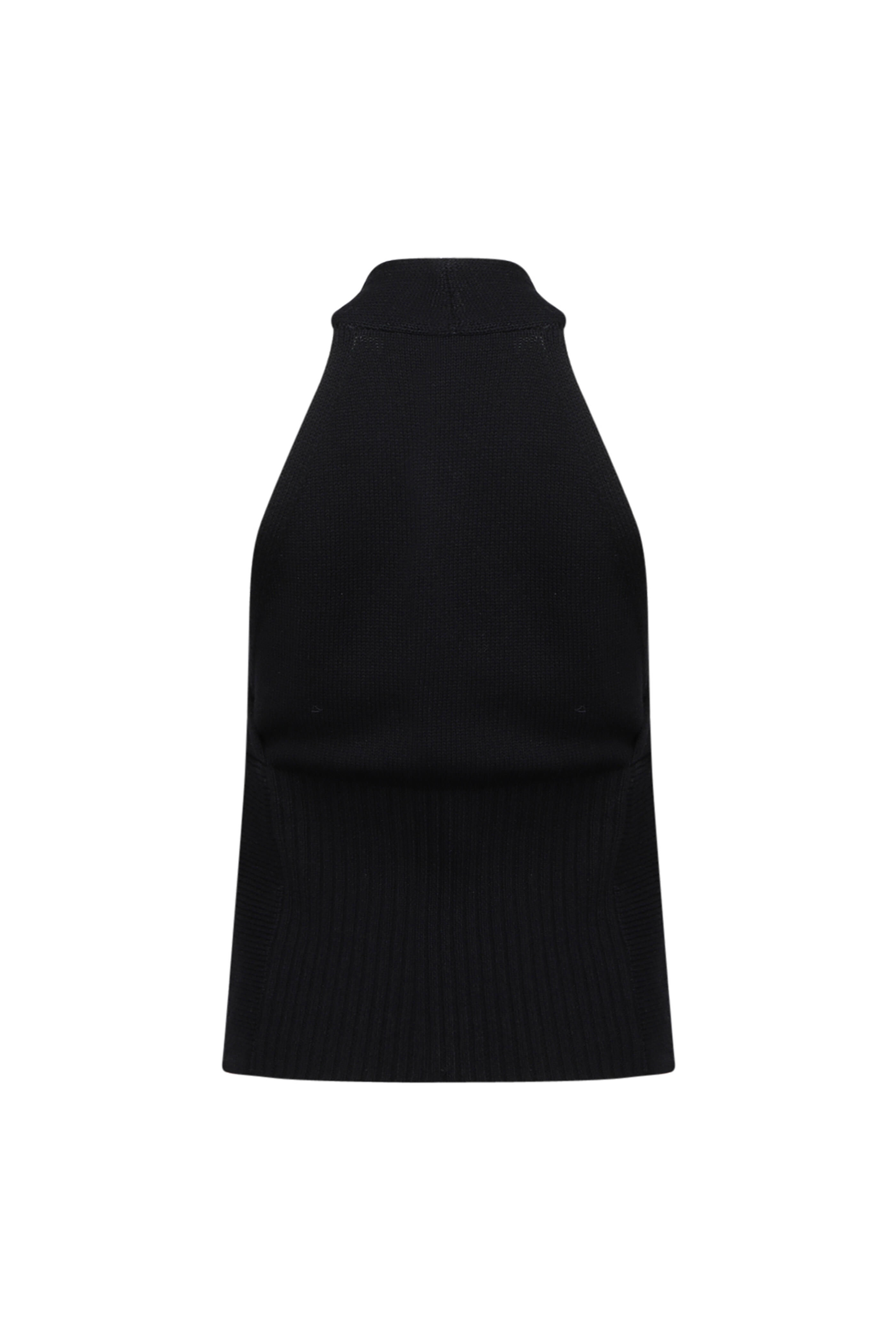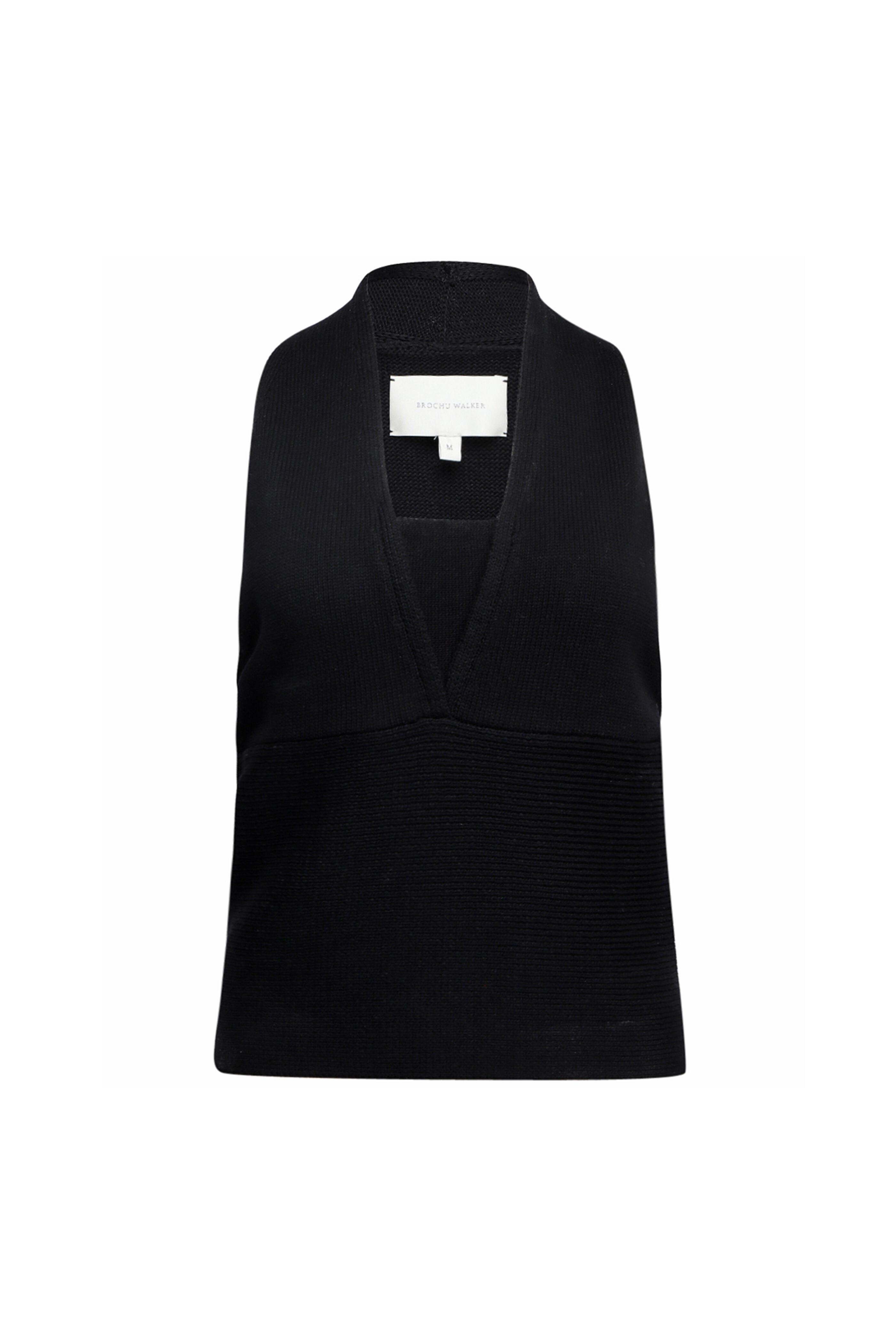 V neck. Racer back. Sleeveless. Wide banded waist. Slim silhouette. 100% cotton.