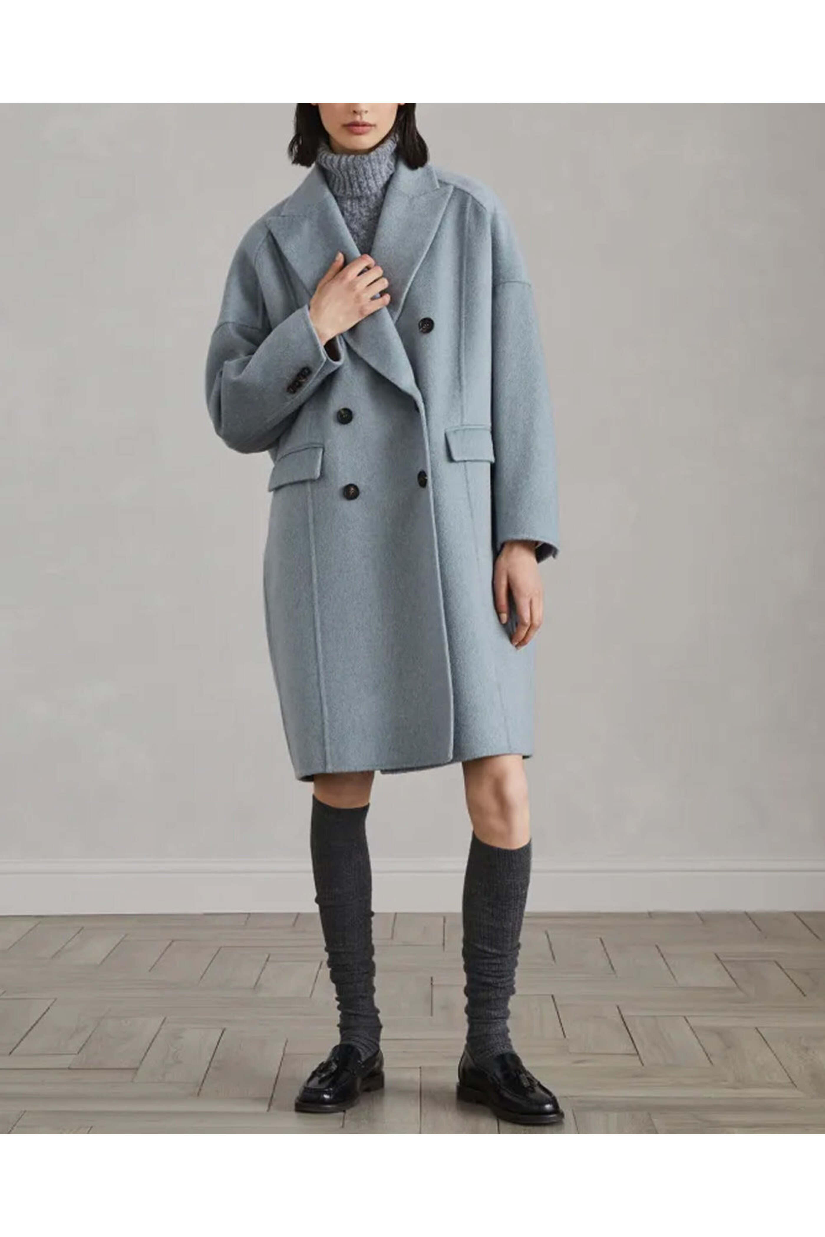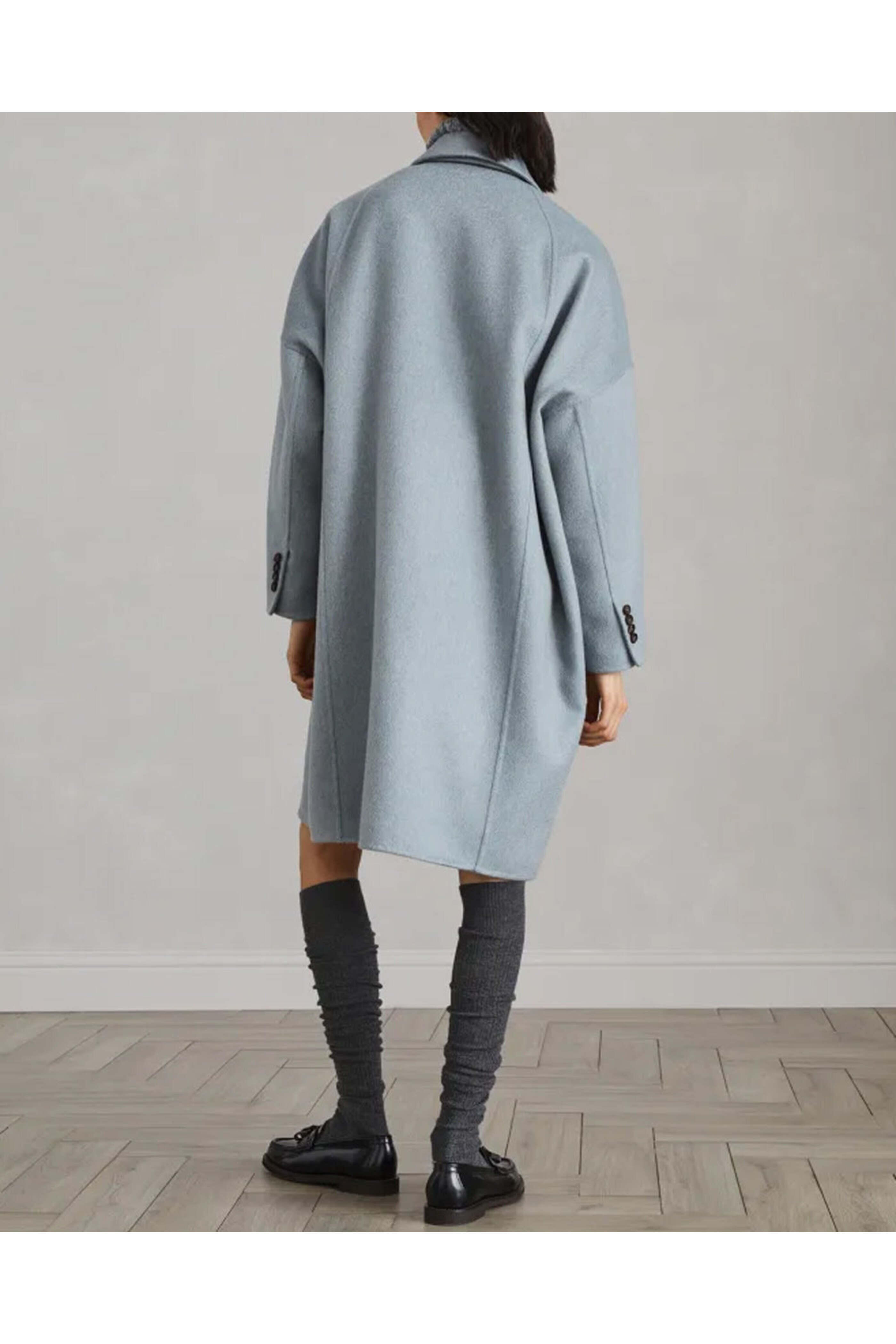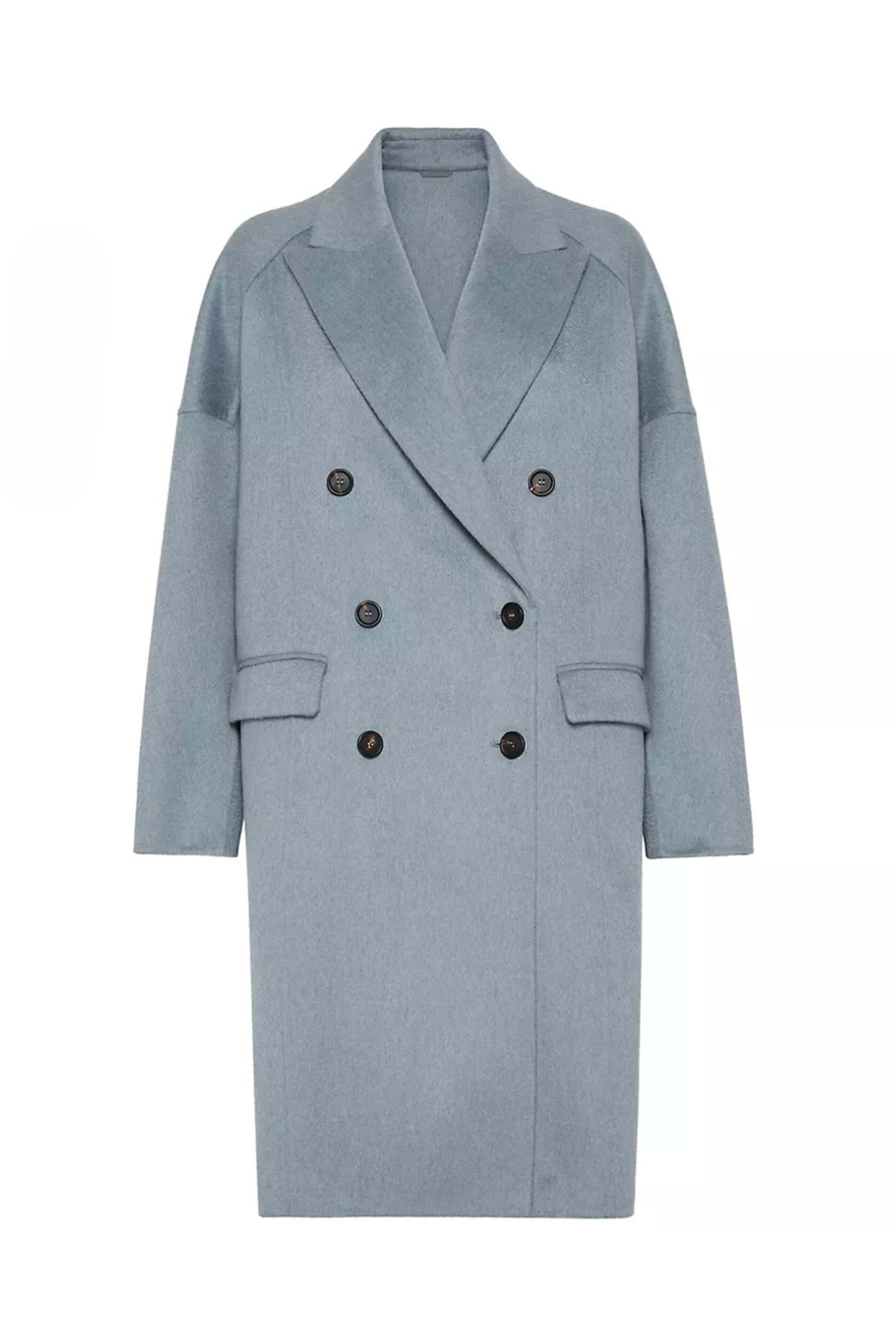 - Brunello Cucinelli Powder Blue Cashmere Double Breasted Overcoat