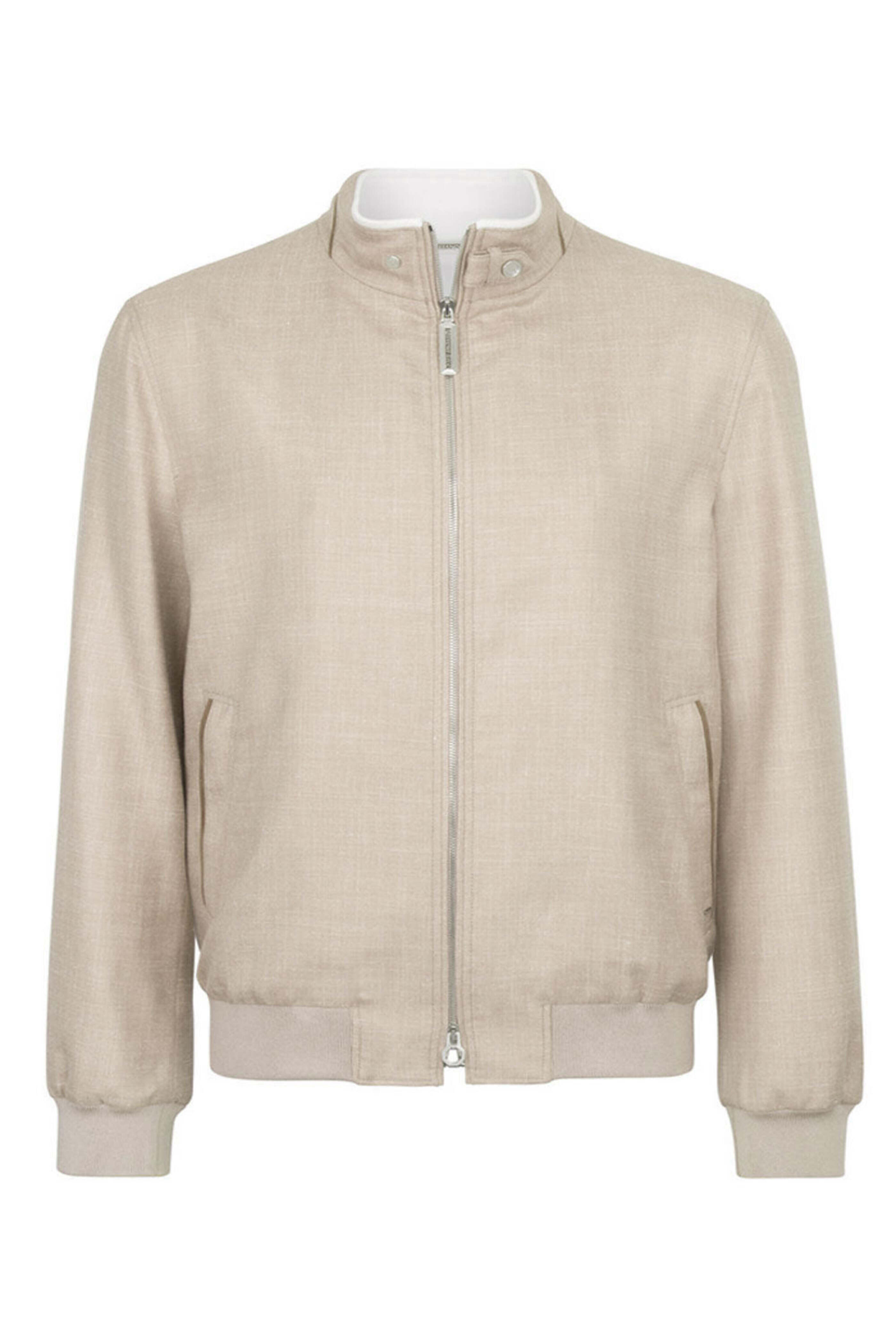 Stefano Ricci White Sport Jacket. Mock neck collar with snap button-down tab. Zip front closure. Slant zip welt pockets. Two internal vertical zip pockets. Ribbed cuffs and hem. Embroidered SR logo with primary fabric Inserts on lining. Precious metal galvanized decorative hardware. Calfskin suede leather. Made in Italy. 46% wool 31% silk 23% linen. 100% silk lining.