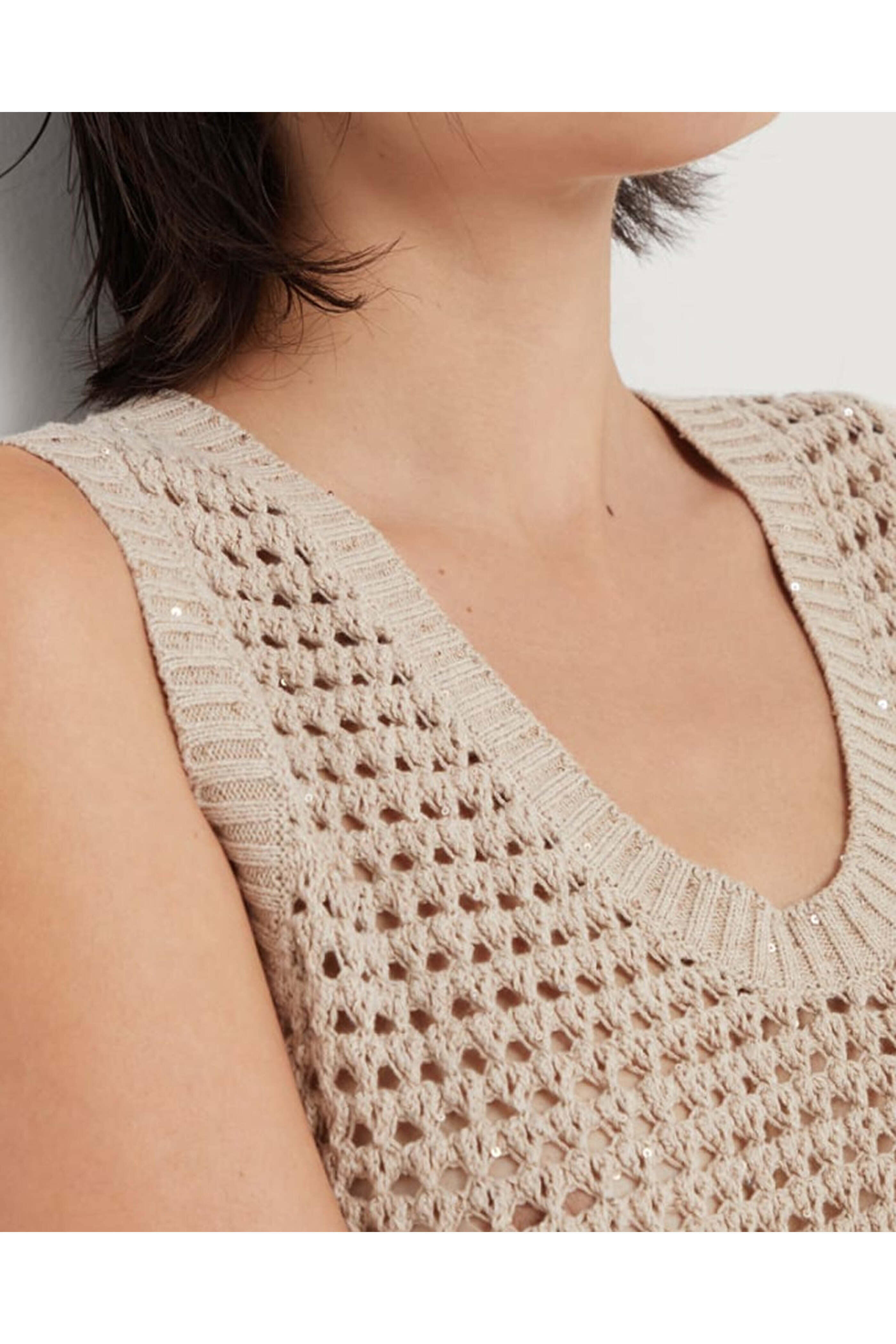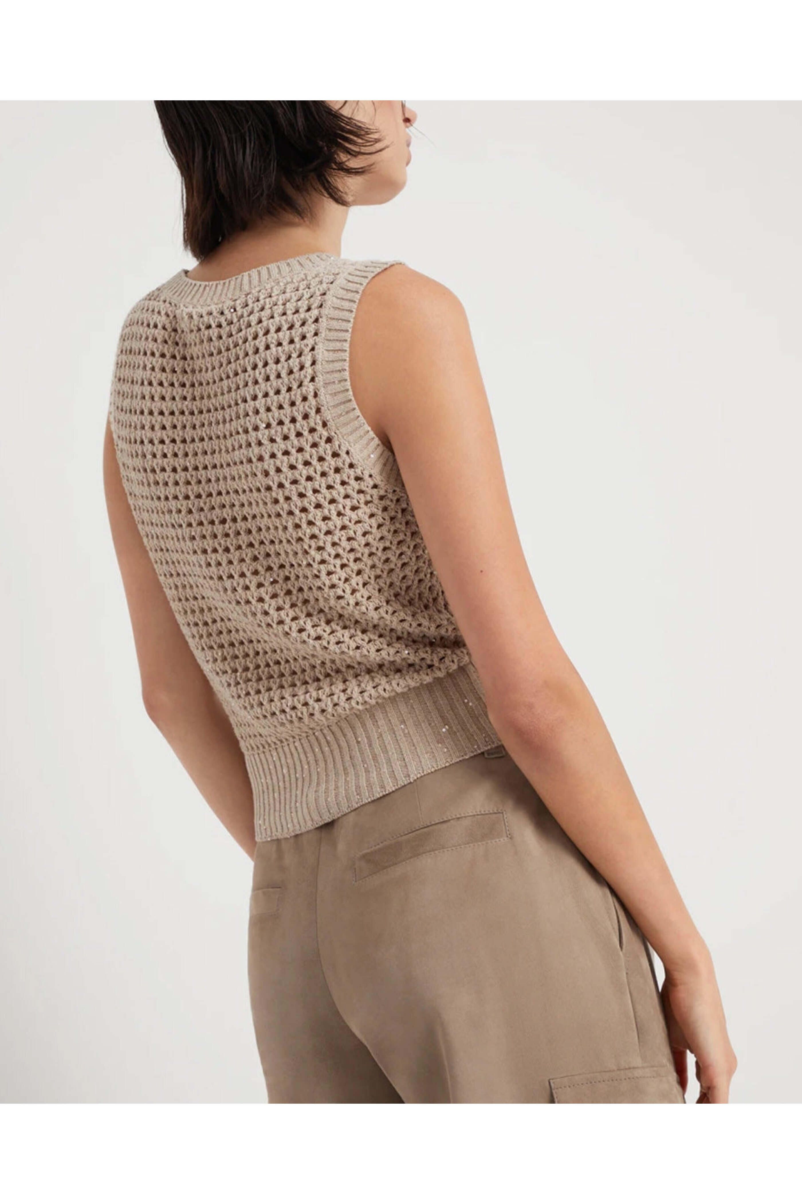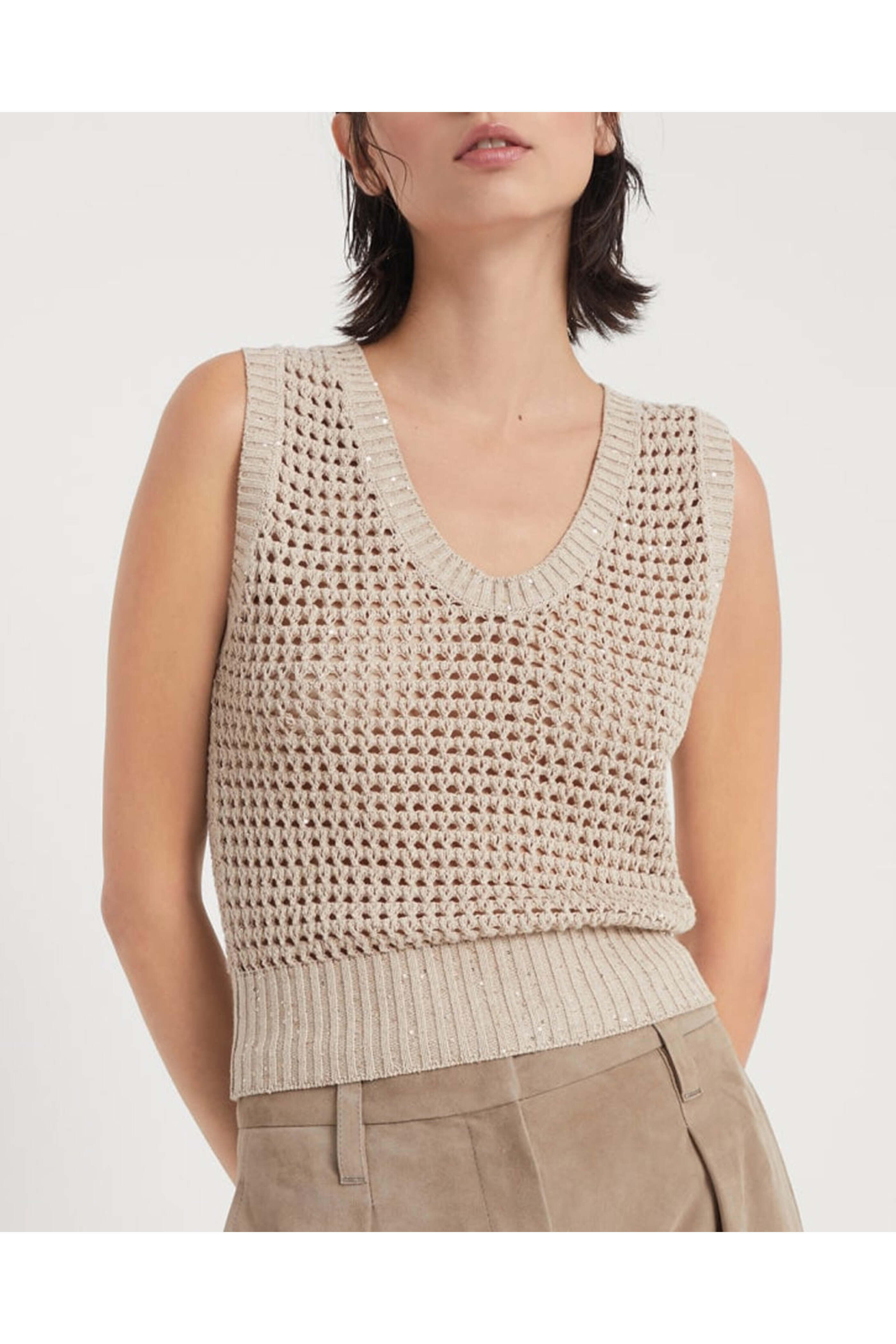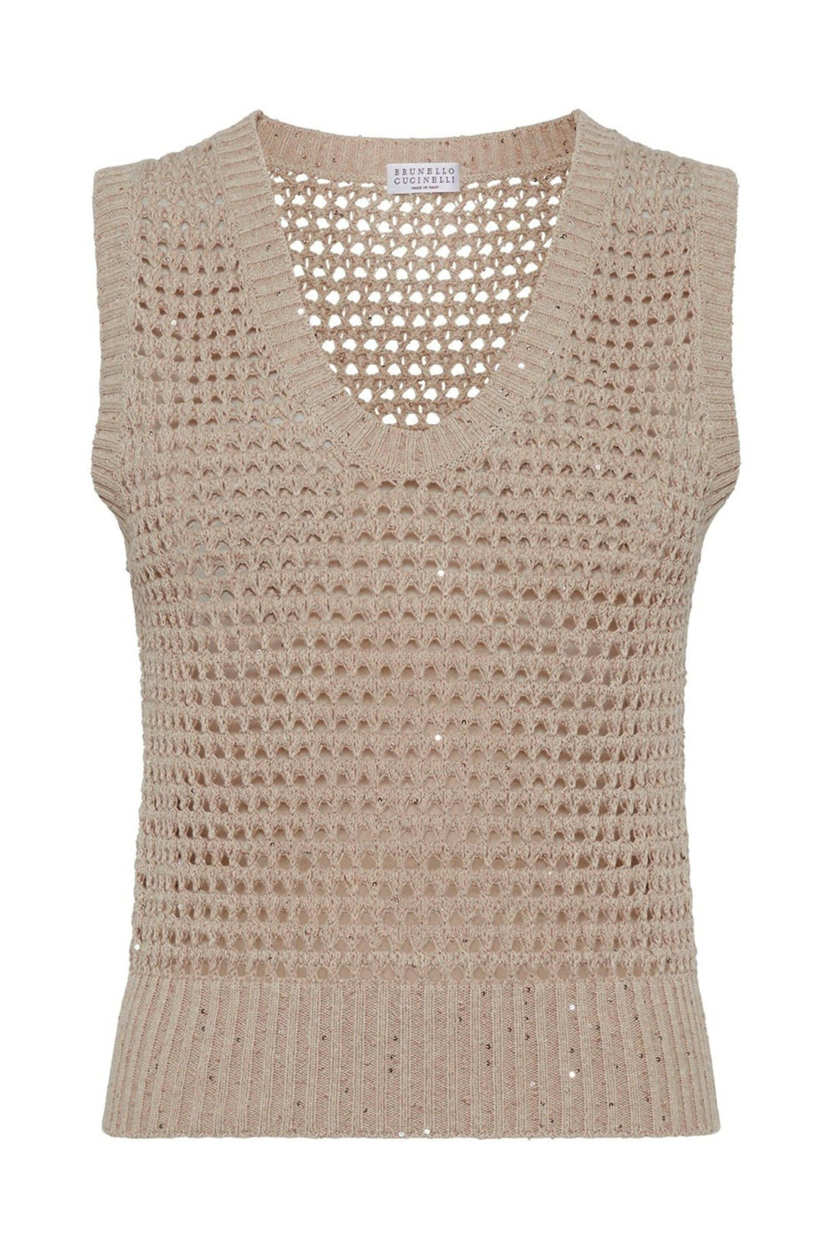 Brunello Cucinelli Light Brown Diamante Knit Scoop Neck Tank. Scoop neck. Sleeveless. Relaxed fit. Ribbed trim. Open knit fabrication. Made in Italy. 96% cotton, 4% polyester.