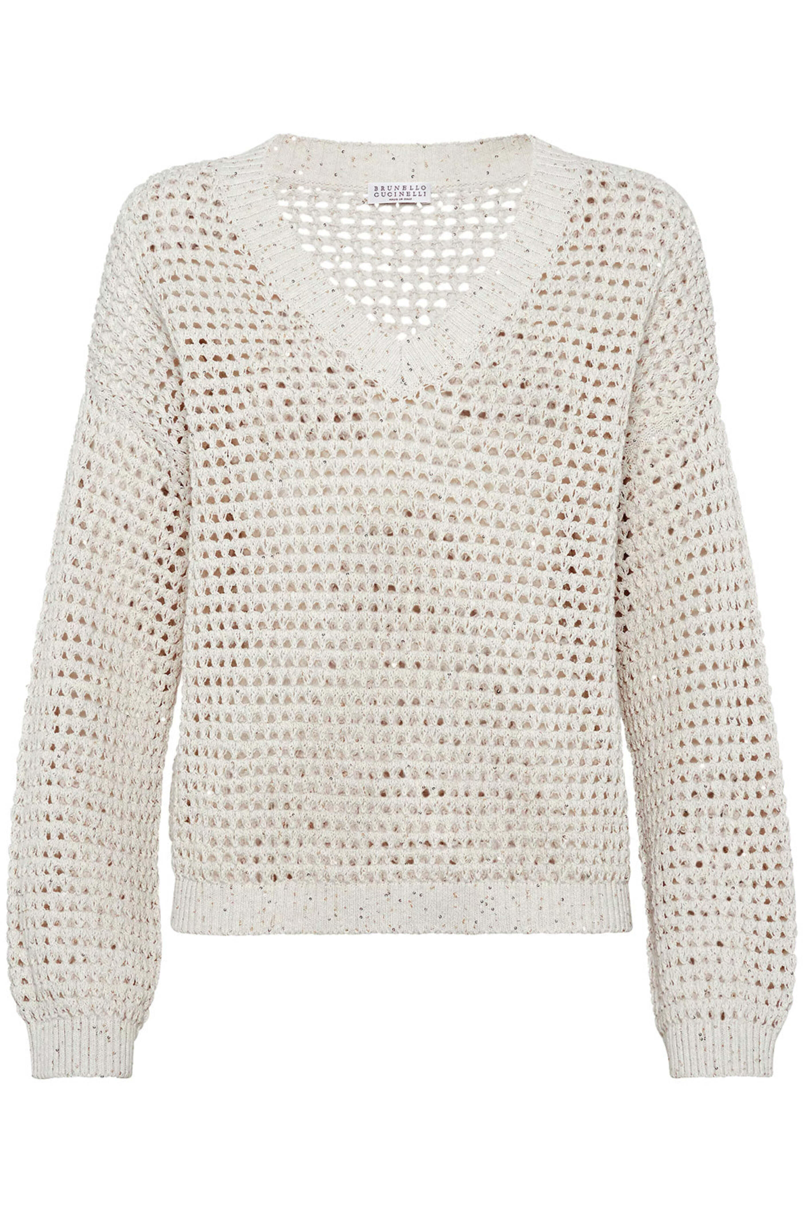 Brunello Cucinelli Oat Diamante Knit V Neck Pullover. V neck. Drop shoulders. Long sleeves. Relaxed fit. Open knit fabrication. Made in Italy. 96% cotton, 4% polyester.
