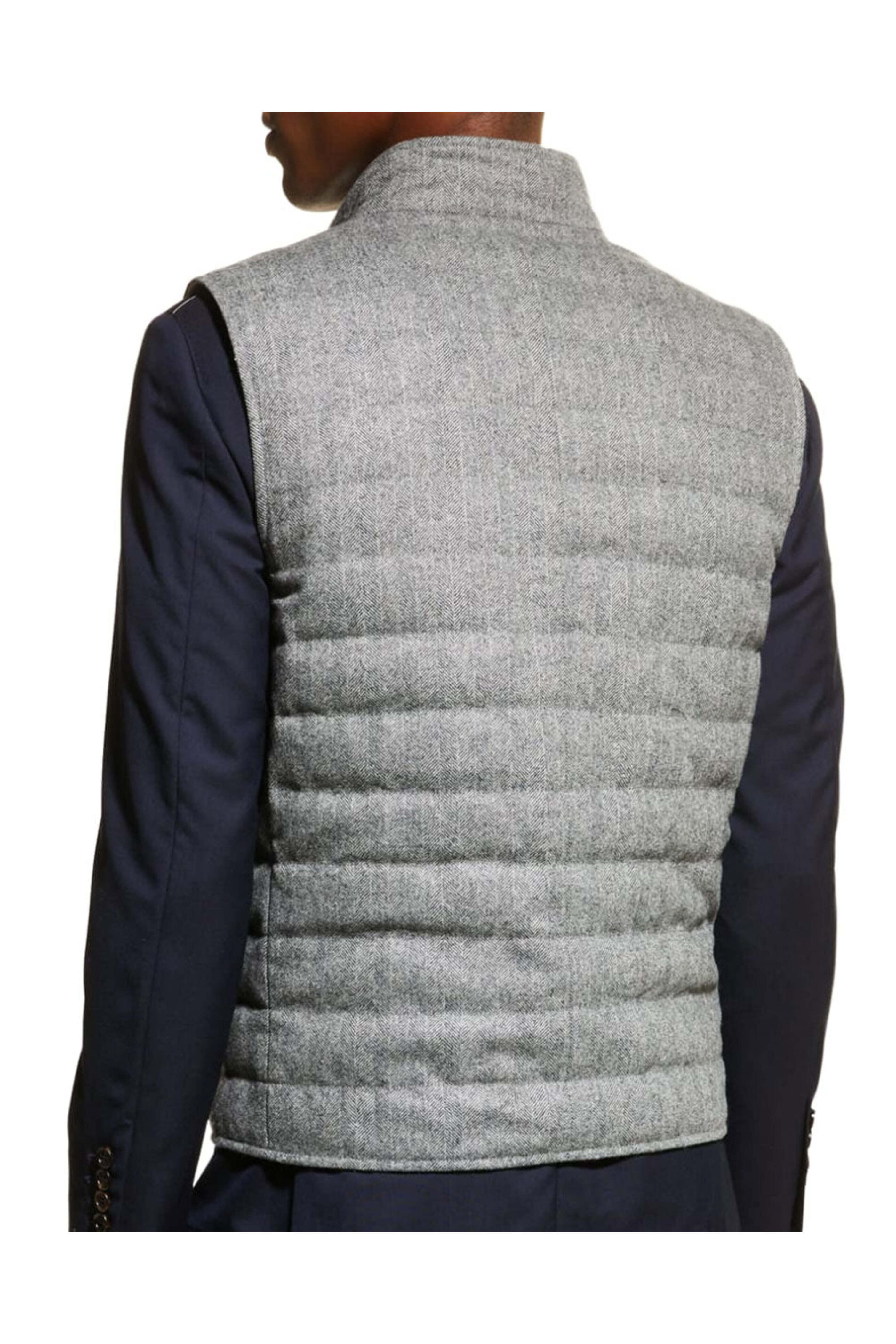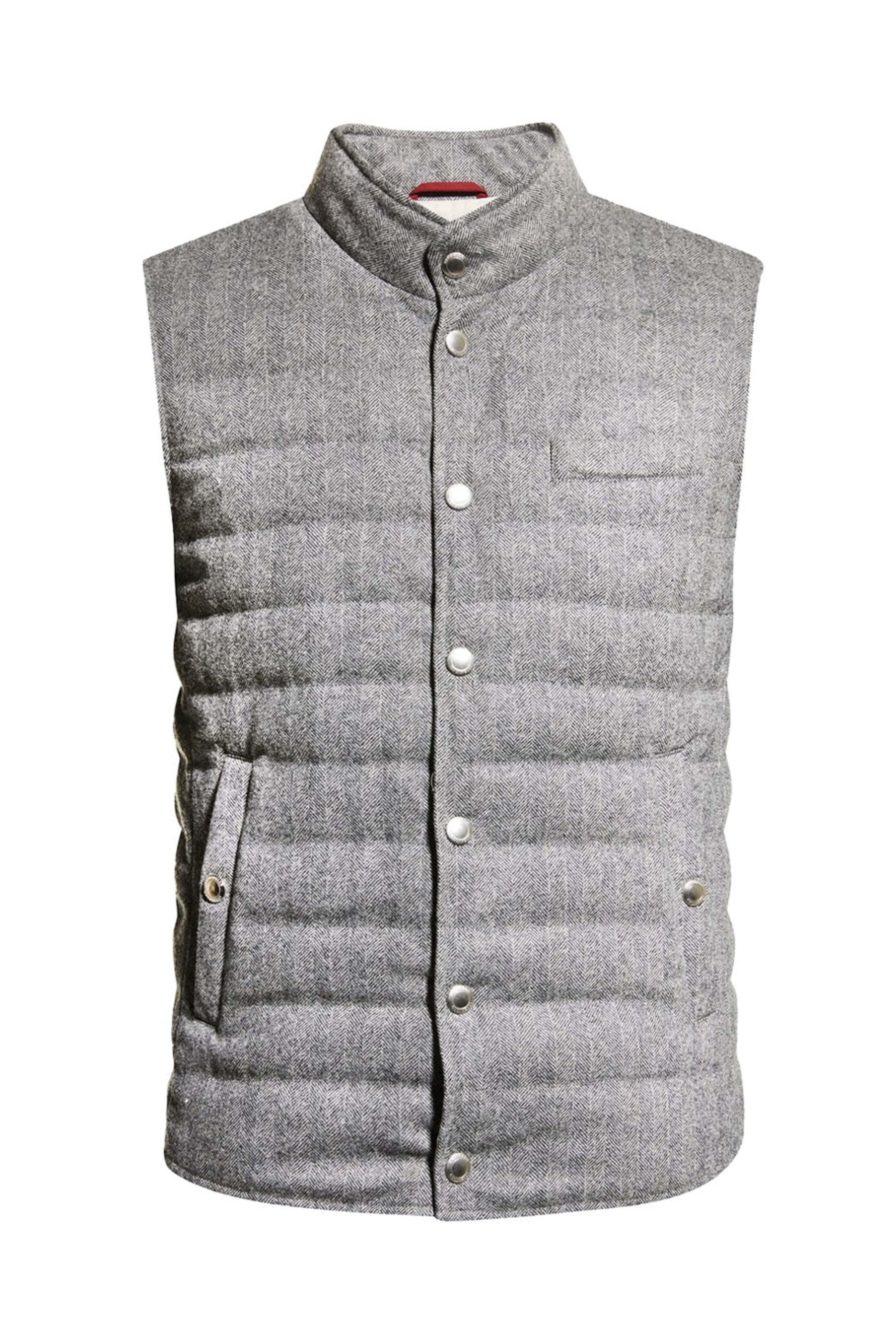Brunello Cucinelli Medium Grey Chevron Snap Vest. Stand collar. Sleeveless. Snap button front closure. Chest welt pocket. Waist snap pockets. Classic fit. Wool. Feather fill. Made in Italy.