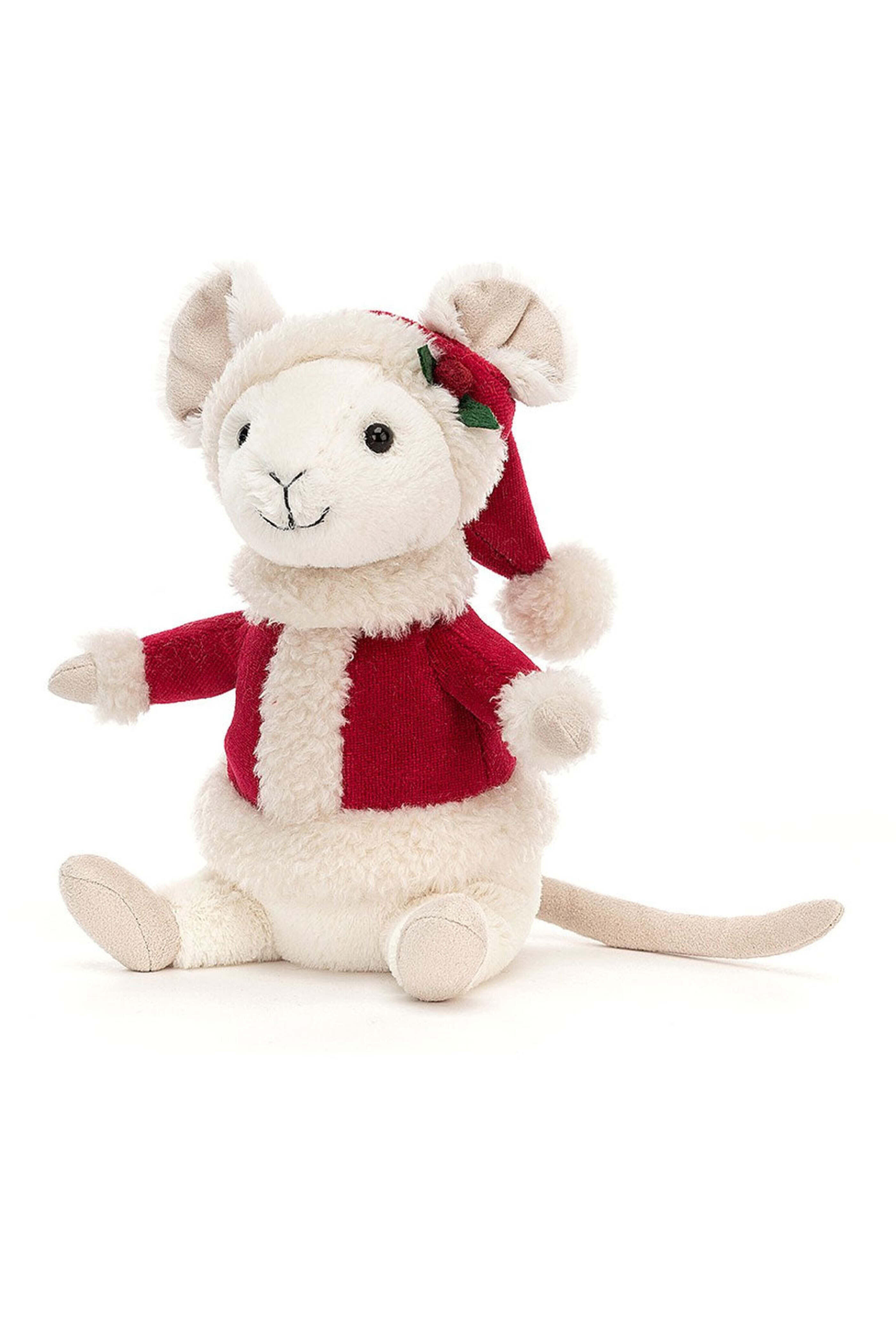 Jellycat Merry Mouse. This buttercream mouse wears a scarlet Santa hat jauntily over one ear. Polyester with plastic pellet fill. Suitable from birth. Hand was only. One size only. 4 W x 7 L.