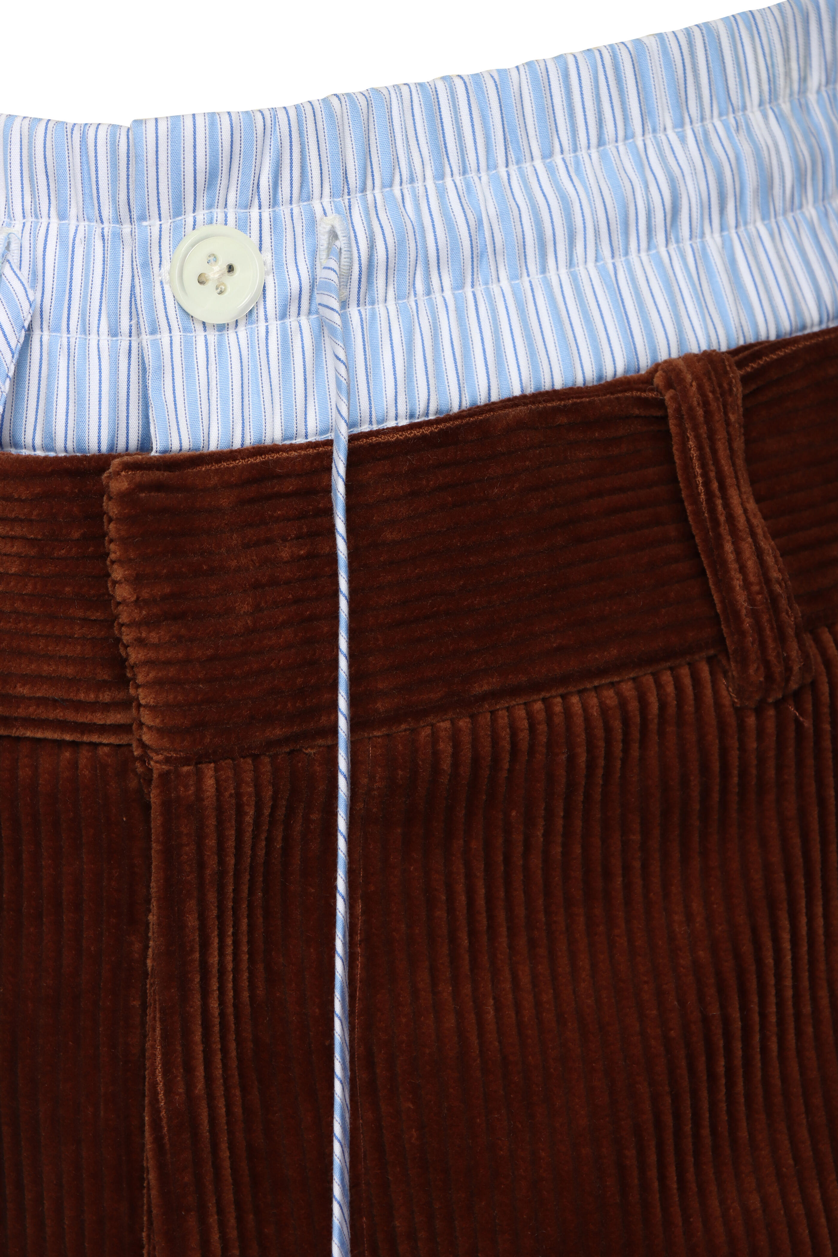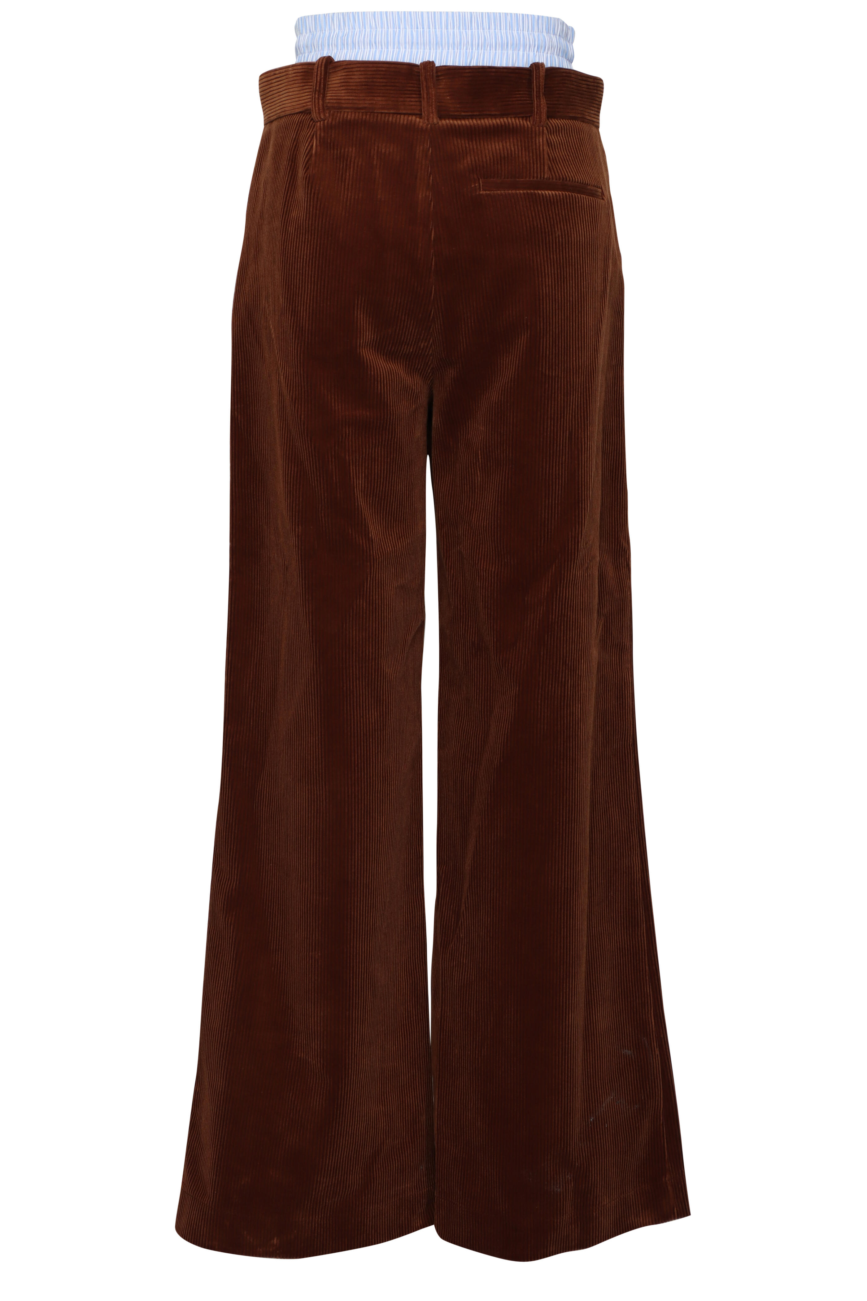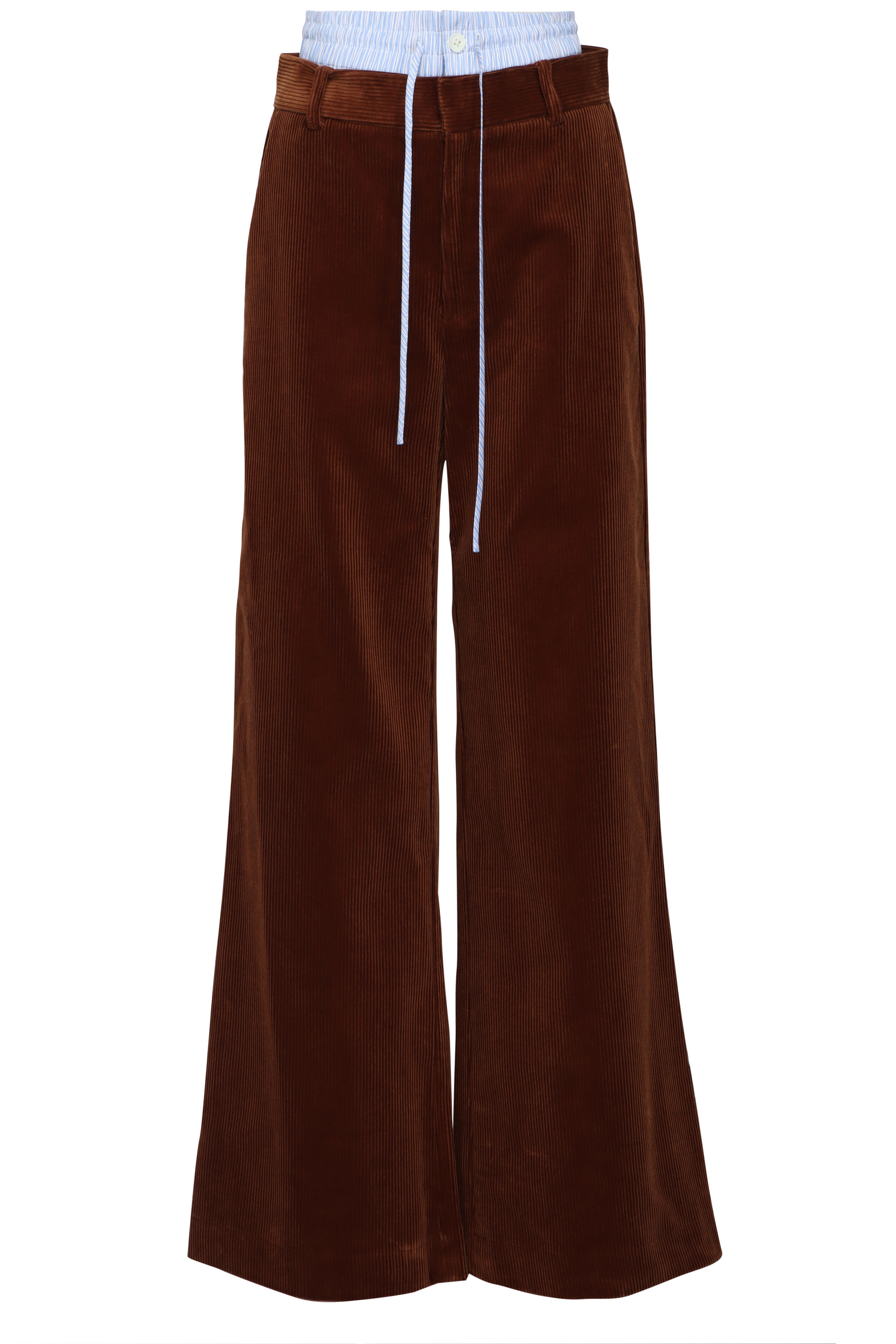High rise. Elastic drawstring waist. Hook and eye closure. Zip fly. Belt loops. Side slip pockets. Single back welt pocket. Straight silhouette. Wide through leg. Corduroy fabrication. Made in USA. Full length. 100% cotton. Dry clean.