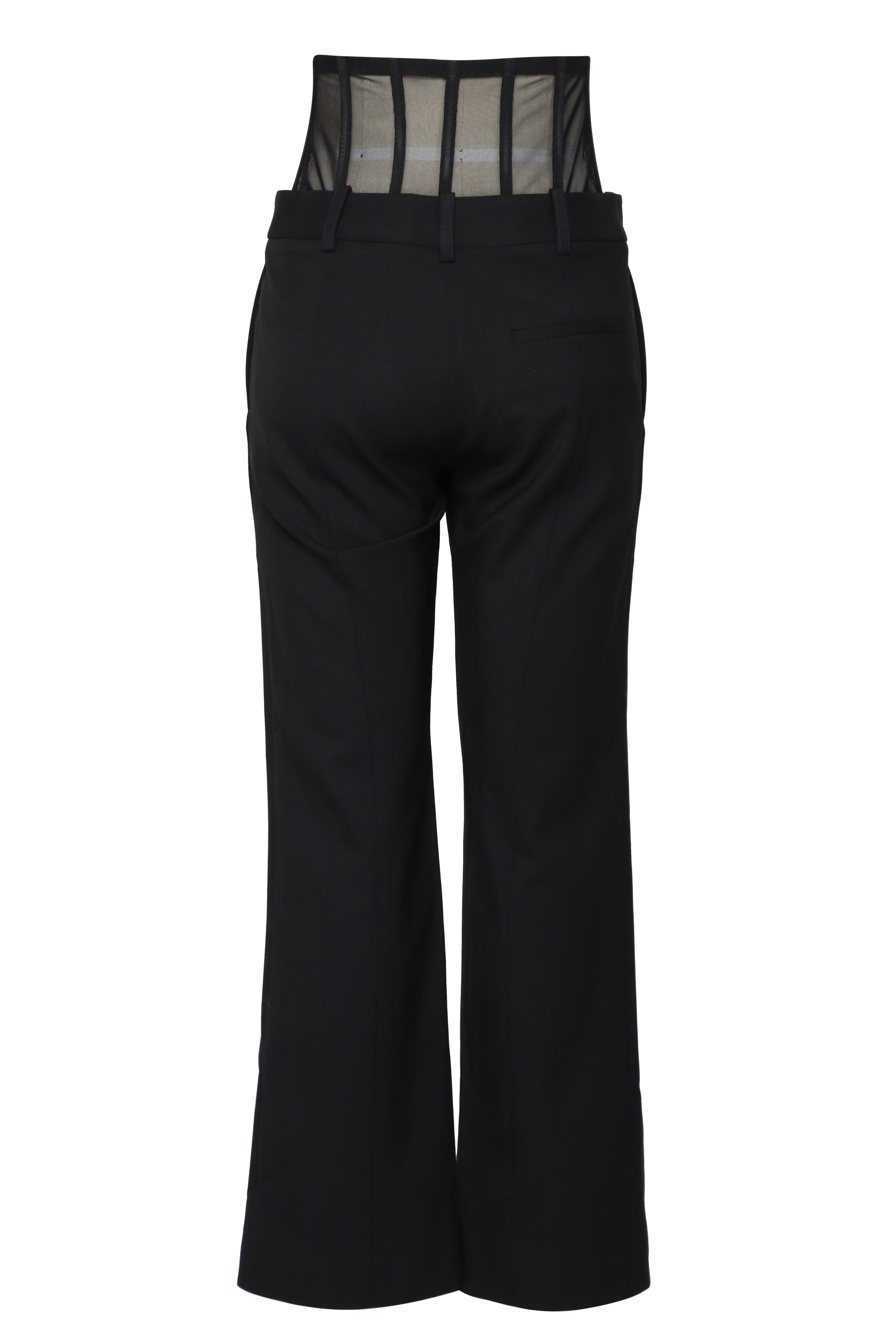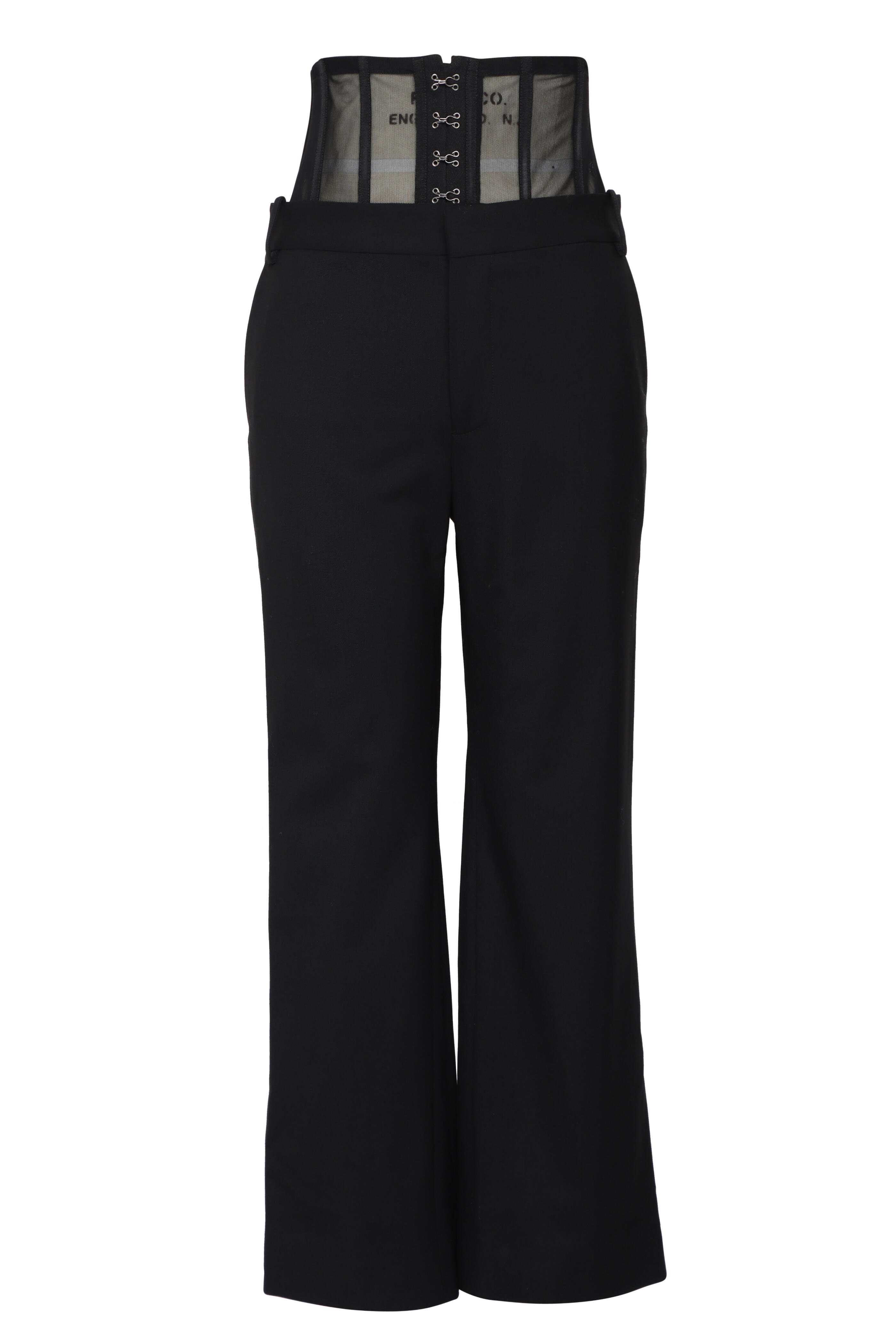 High rise. Bustier hook closure. Hook and eye closure. Zip fly. Belt loops. Side slip pockets. Single back welt pocket. Wide through leg. Made in USA. Full length. 95% virgin wool, 5% elastane. Dry clean.