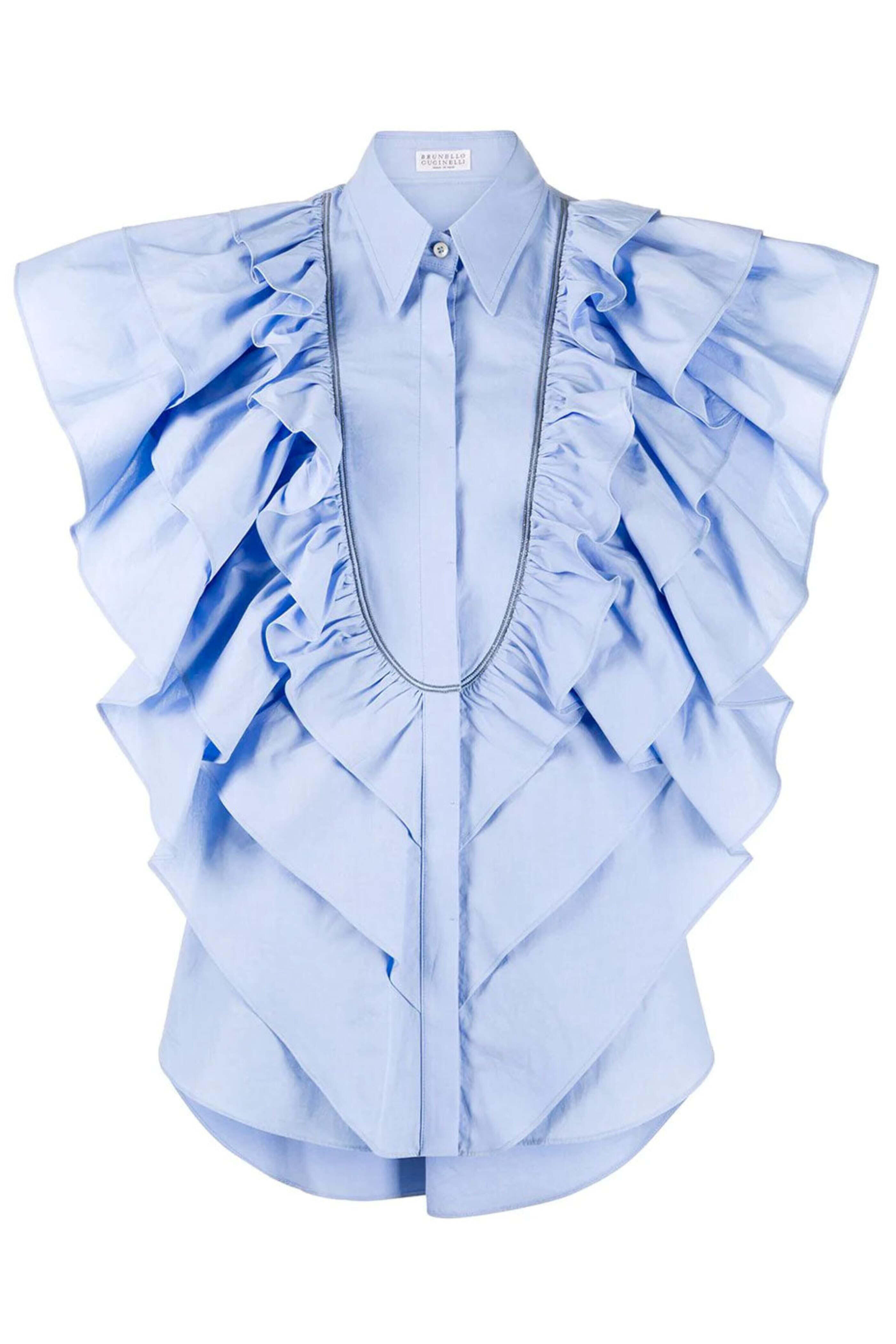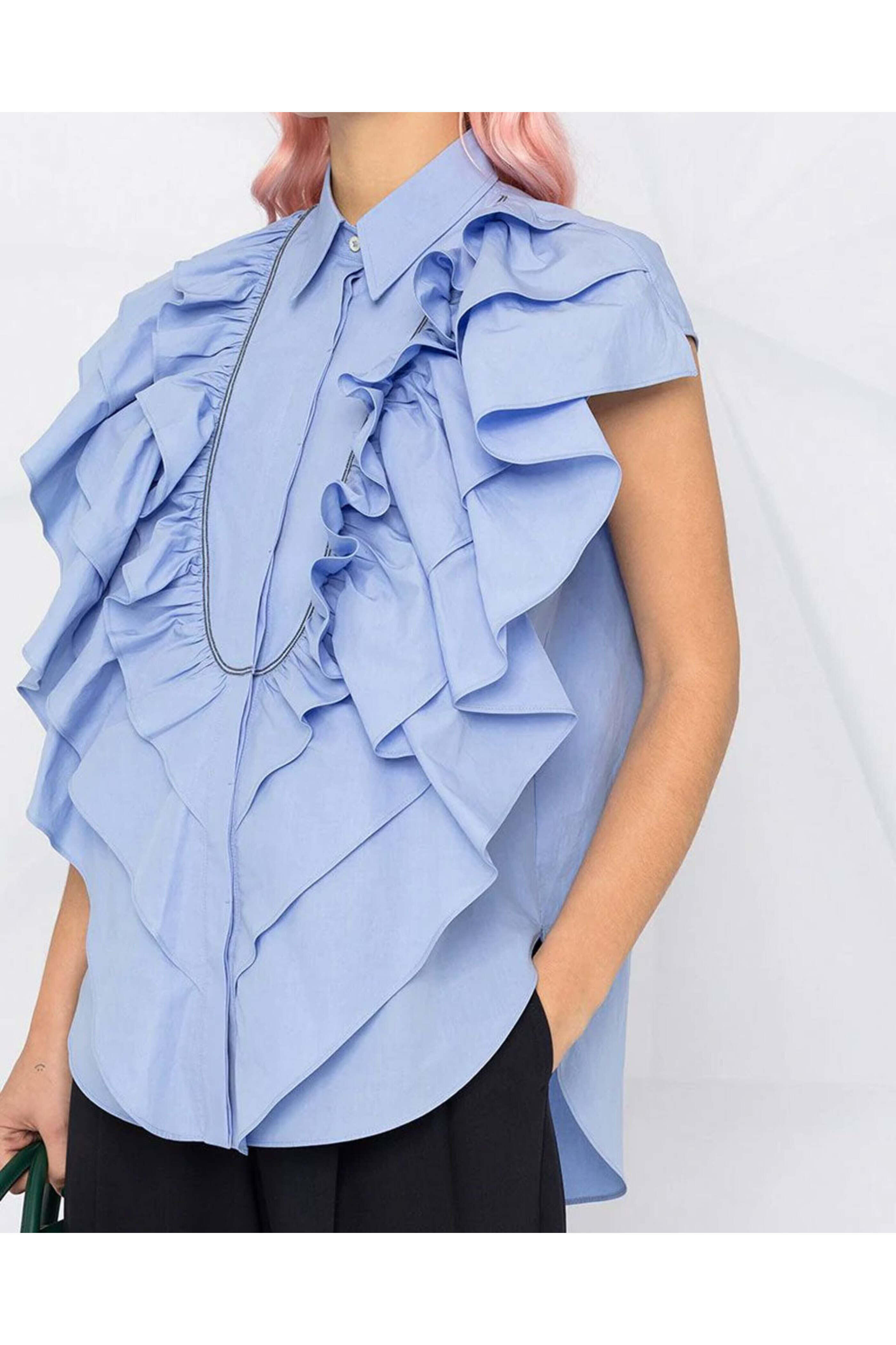 - Brunello Cucinelli Sky Blue Tiered Ruffle Sleeveless Blouse Point collar Concealed front button closure Sleeveless