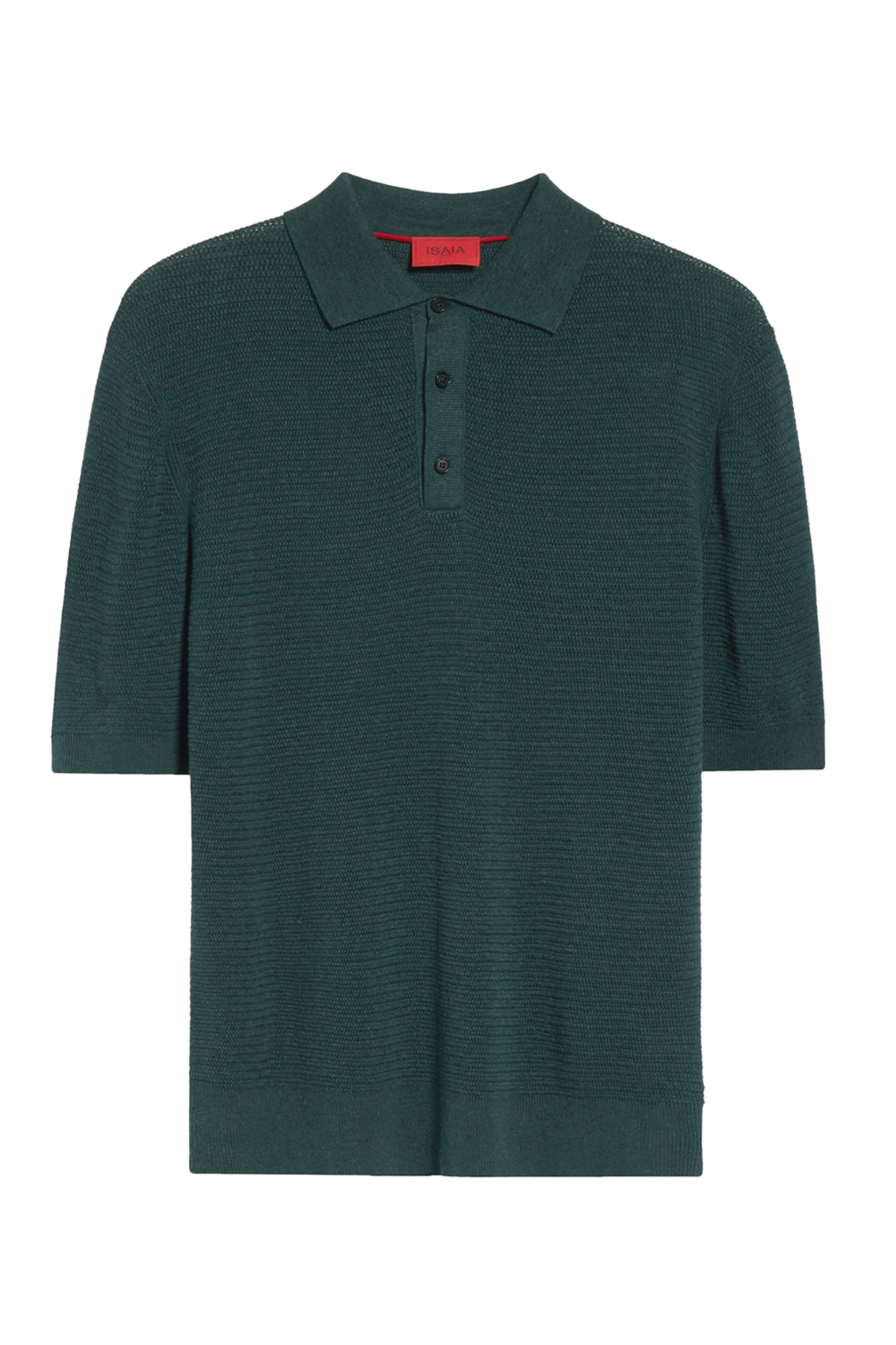 Isaia Emerald Green Knit Polo. Spread collar. Three button placket. Short sleeves. Pullover style. Made in Italy . 55% silk, 45% linen.