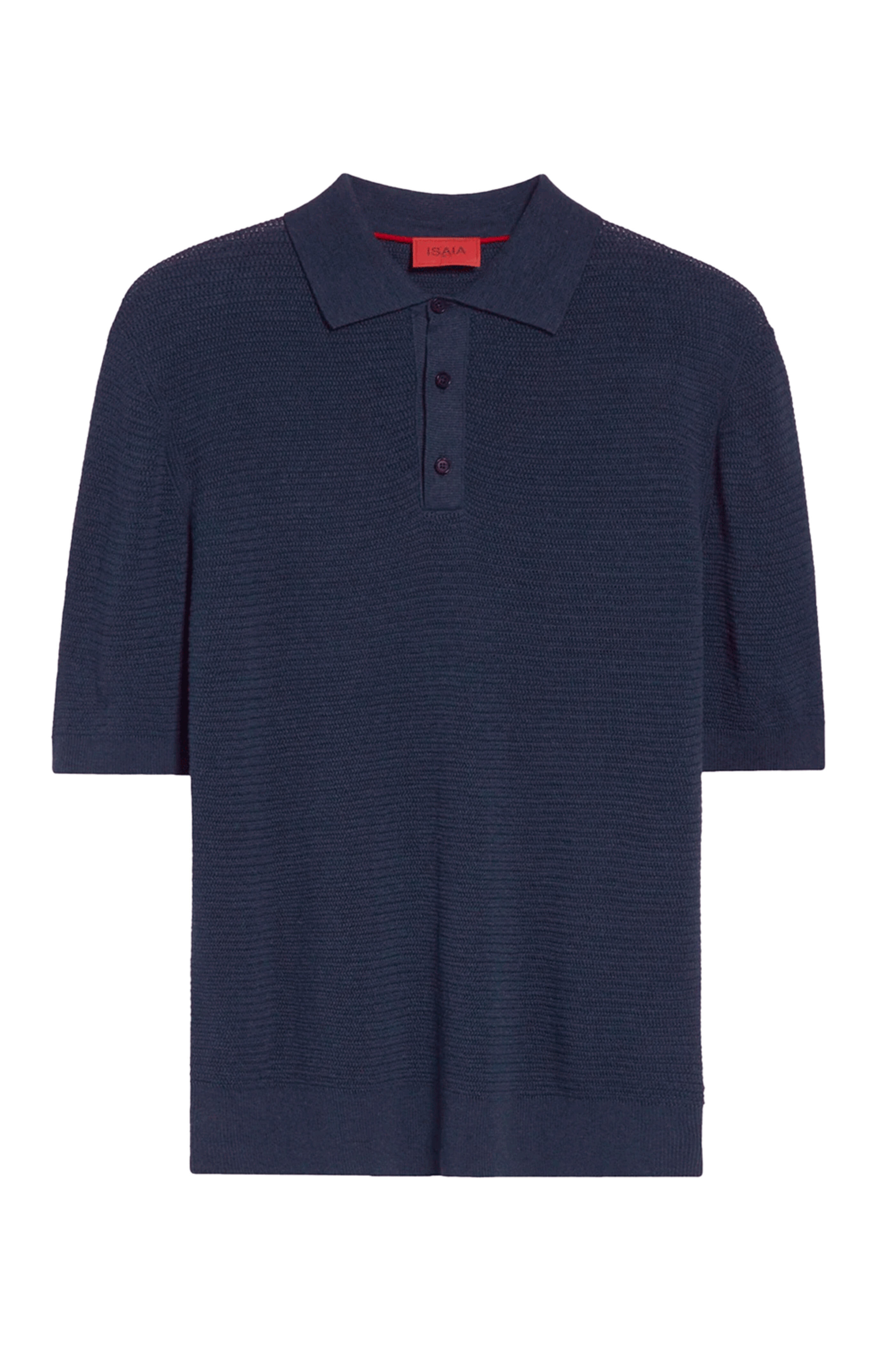 Isaia Navy Blue Knit Polo. Spread collar. Three button placket. Short sleeves. Pullover style. Made in Italy . 55% silk, 45% linen.