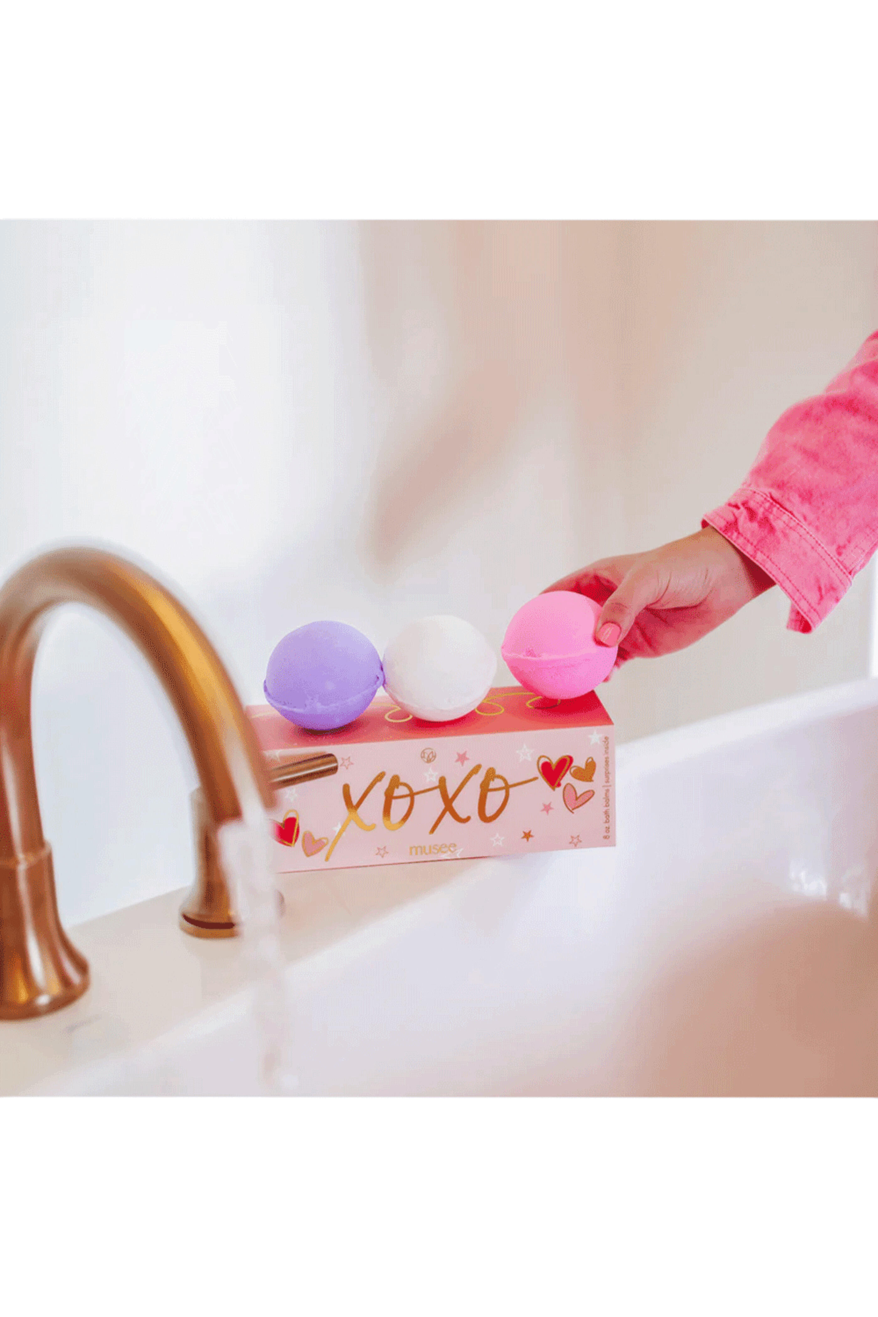 Musee XOXO Bath Balm Set. Set of 3 bath bombs. Natural and essential oils. Fragranced with fresh scents od coconut and grapefruit. Each bath bomb is 4 oz.. Includes a surprise treasure inside each bath bomb.