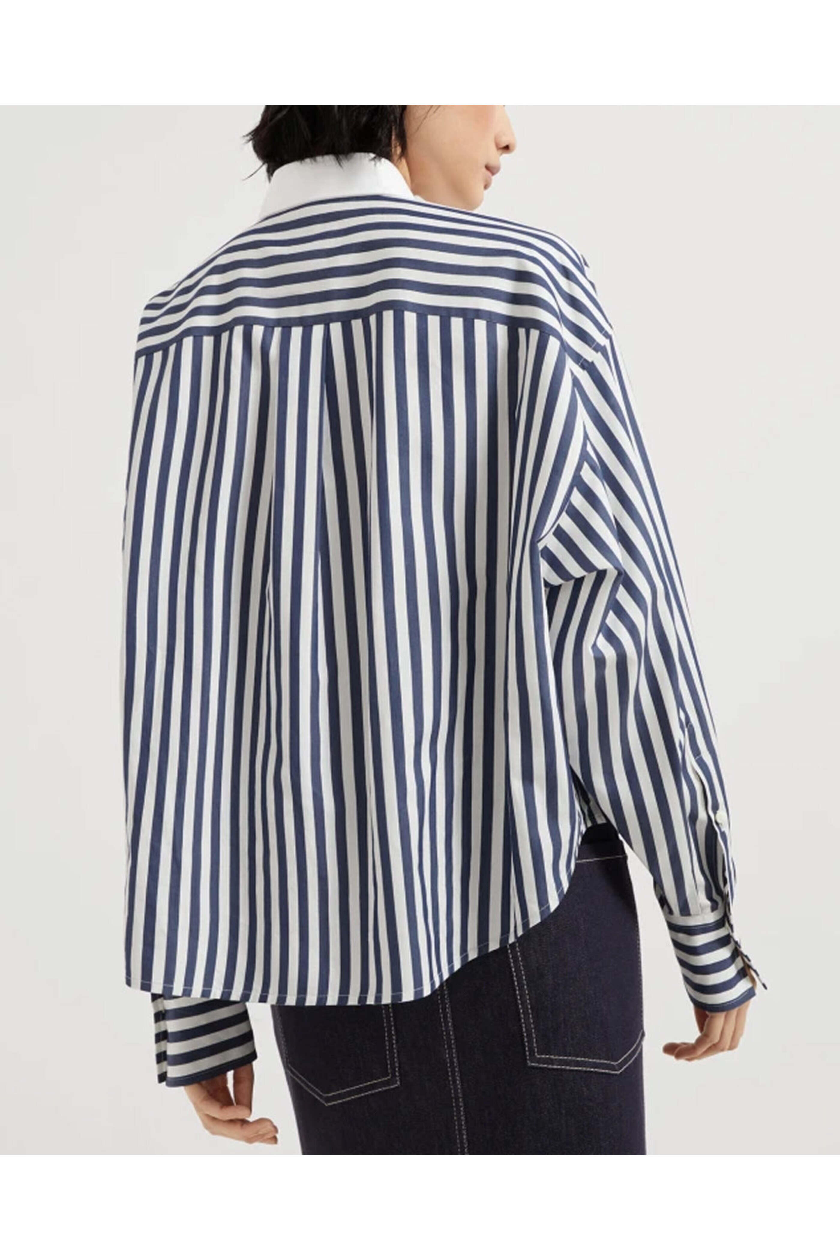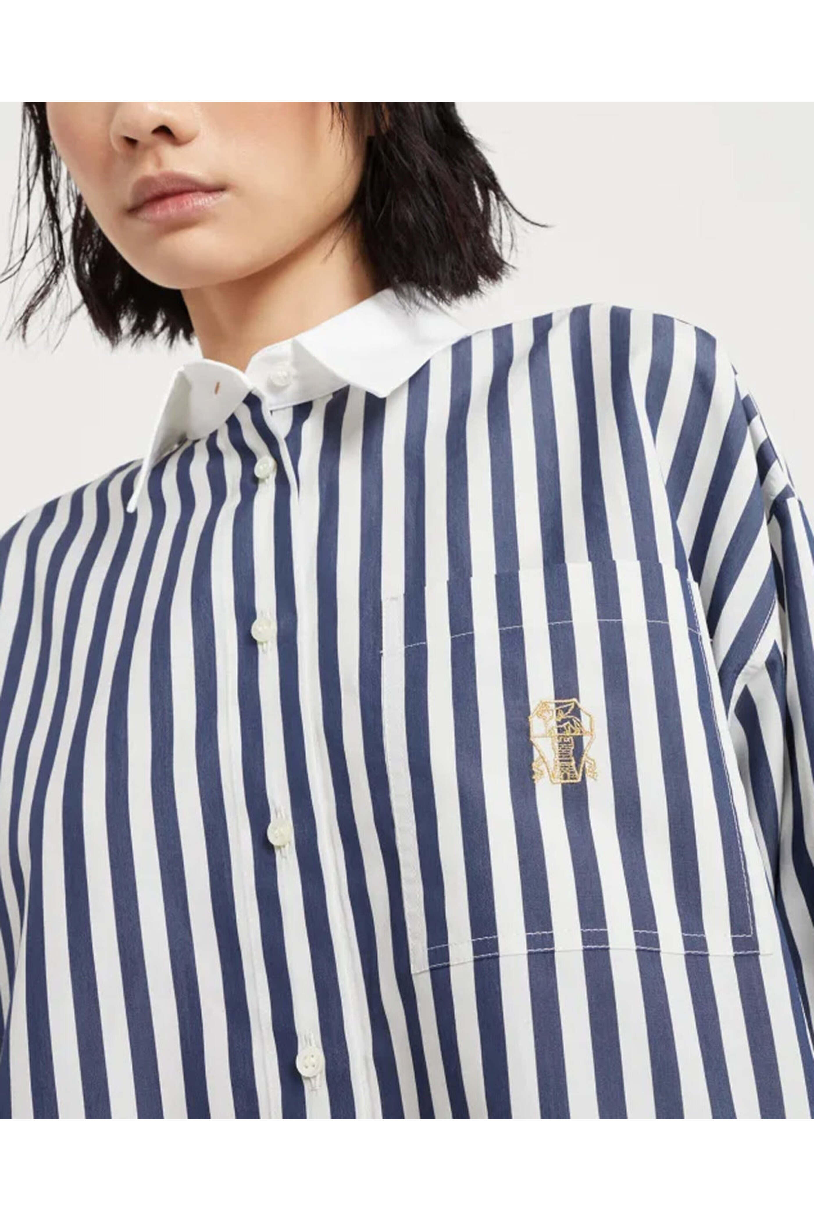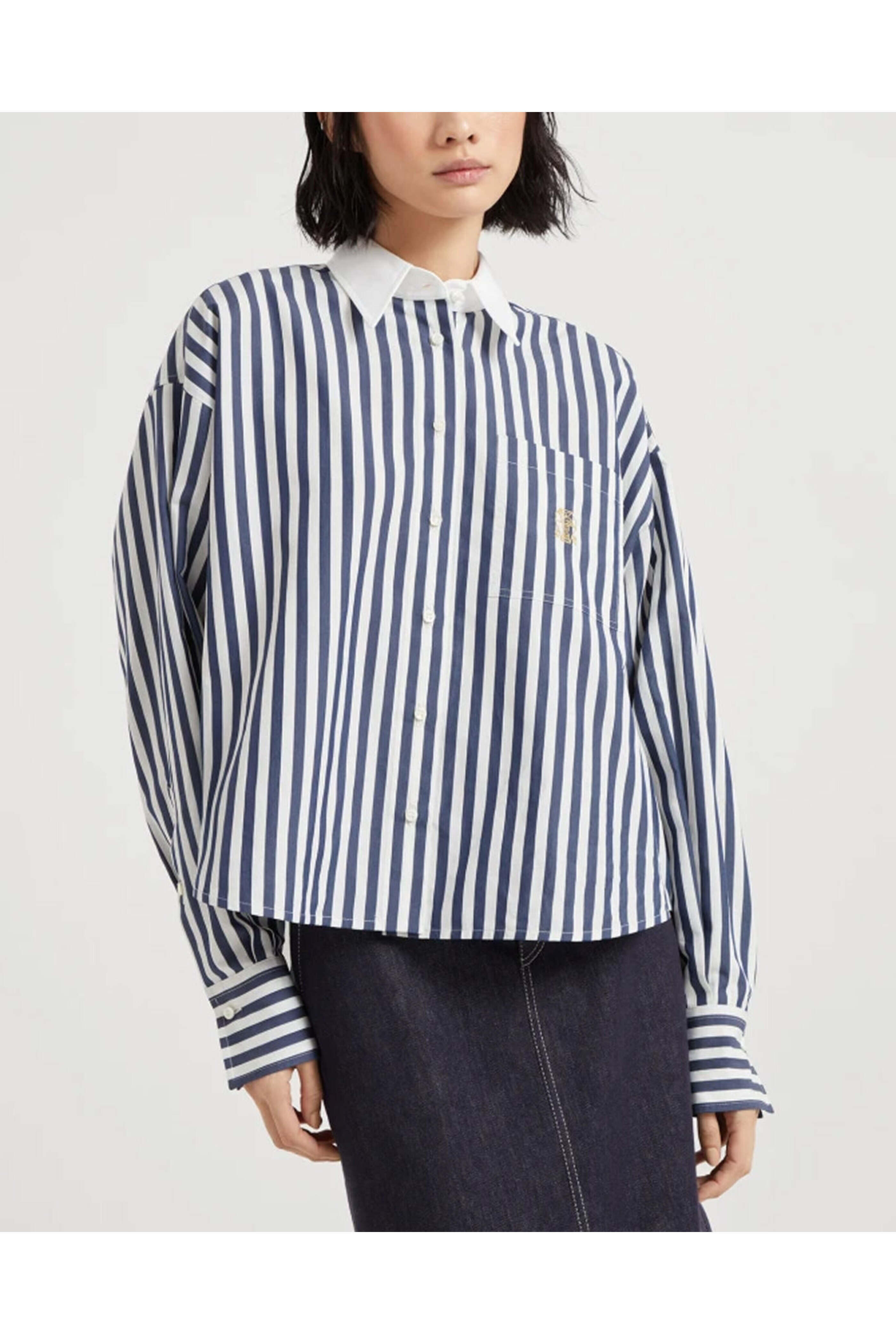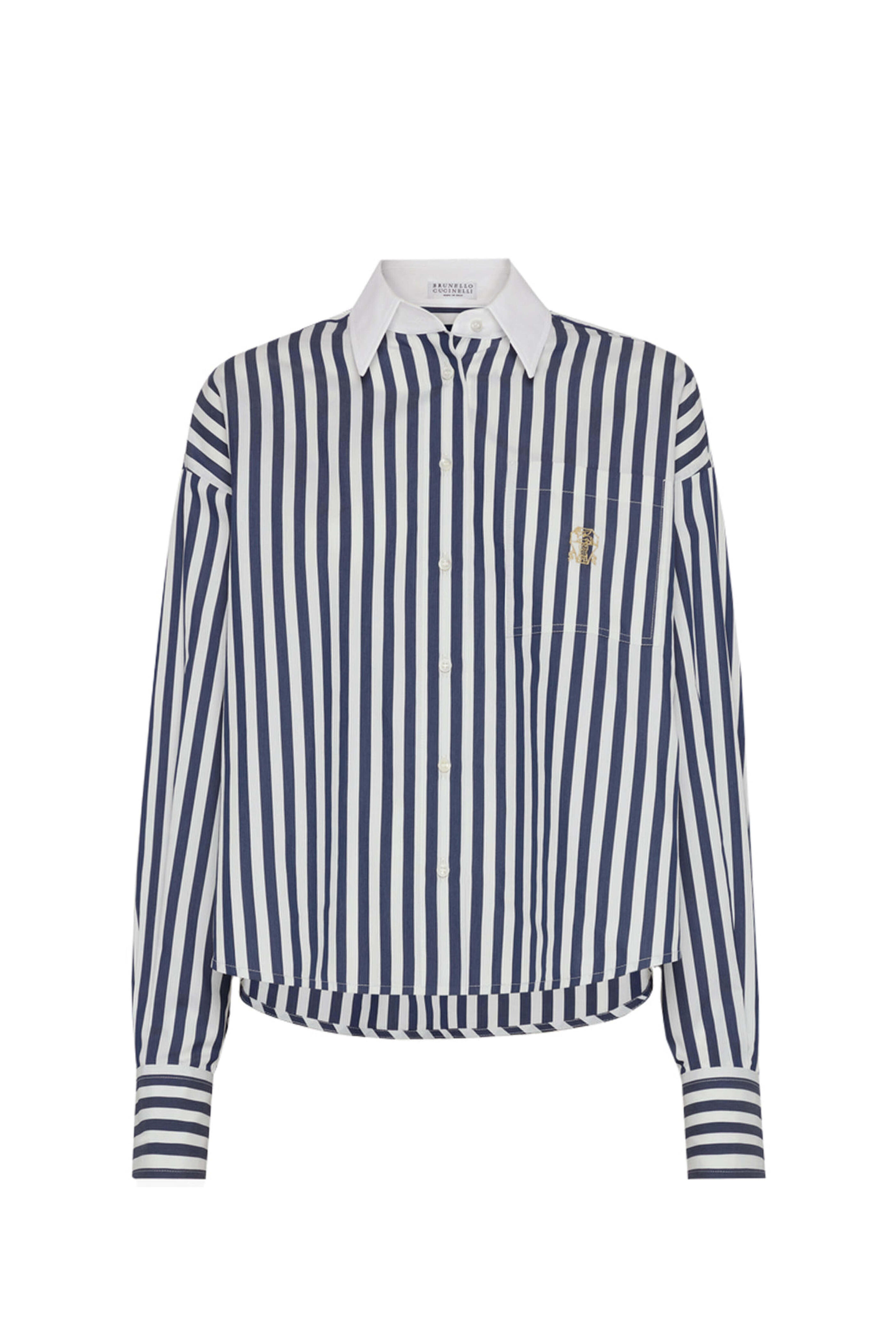 Collar; contrast color. Drop shoulders. Long sleeves; button cuffs. Button down front closure. Single chest patch pocket; embroidered logo detail. Made in Italy. Boxy fit. 81% cotton, 19% silk.