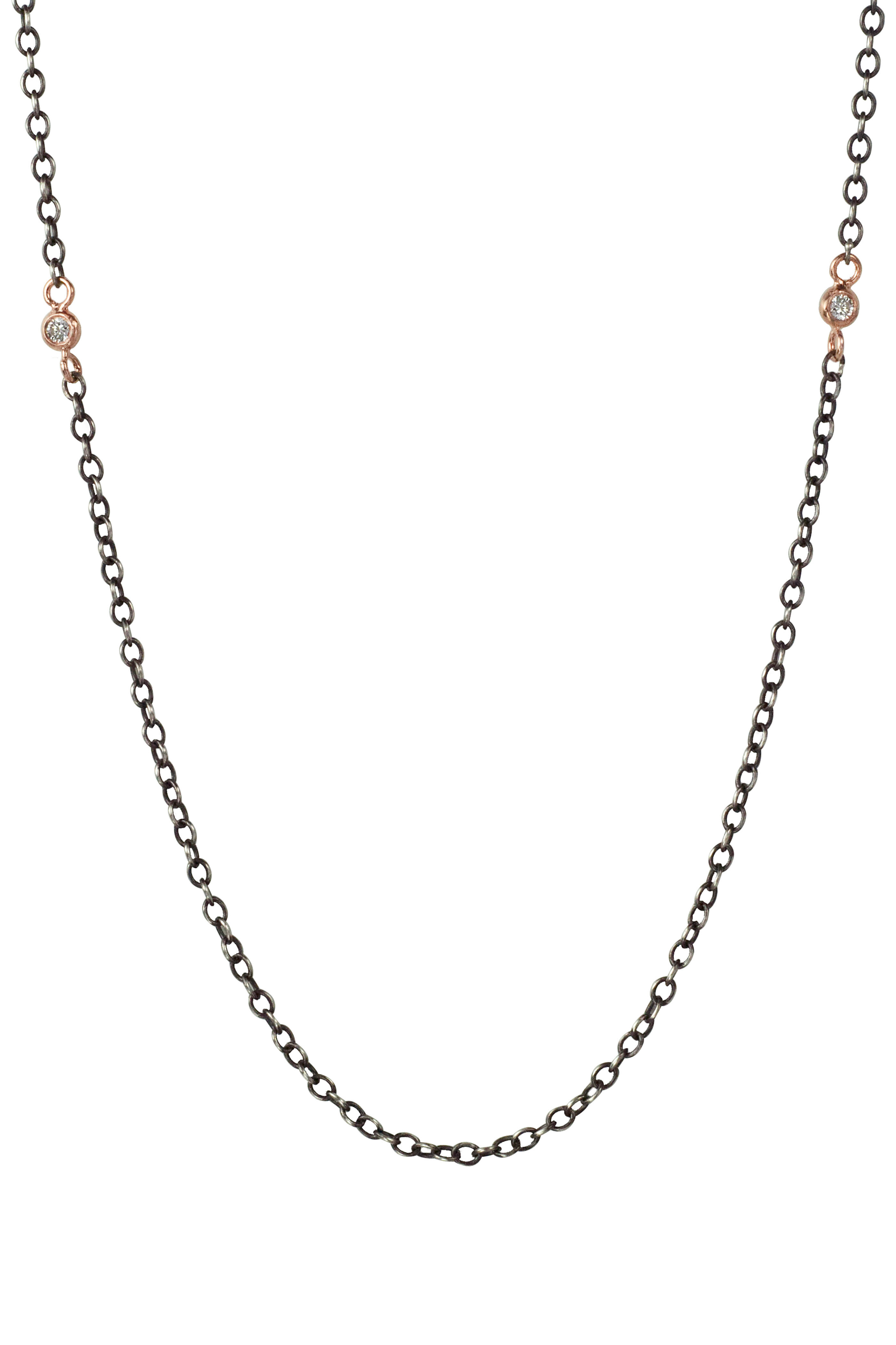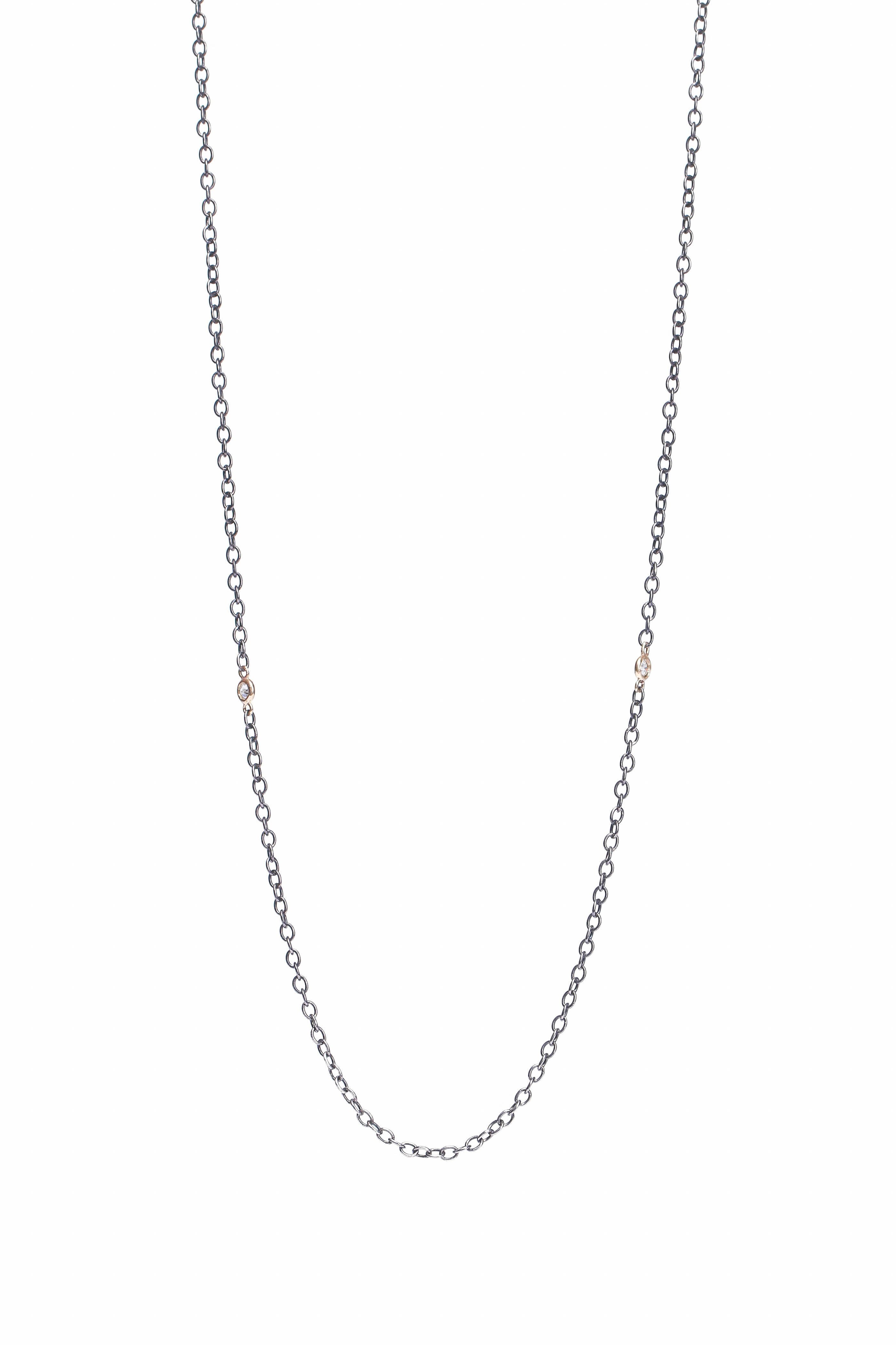 14k gold. Black rhodium. Sterling silver. Diamond 0.10 total carat weight. Single diamond charm detailing. Gold bezel. Chain link. Lobster claw clasps. Handcrafted in L.A.. Length: 24”.