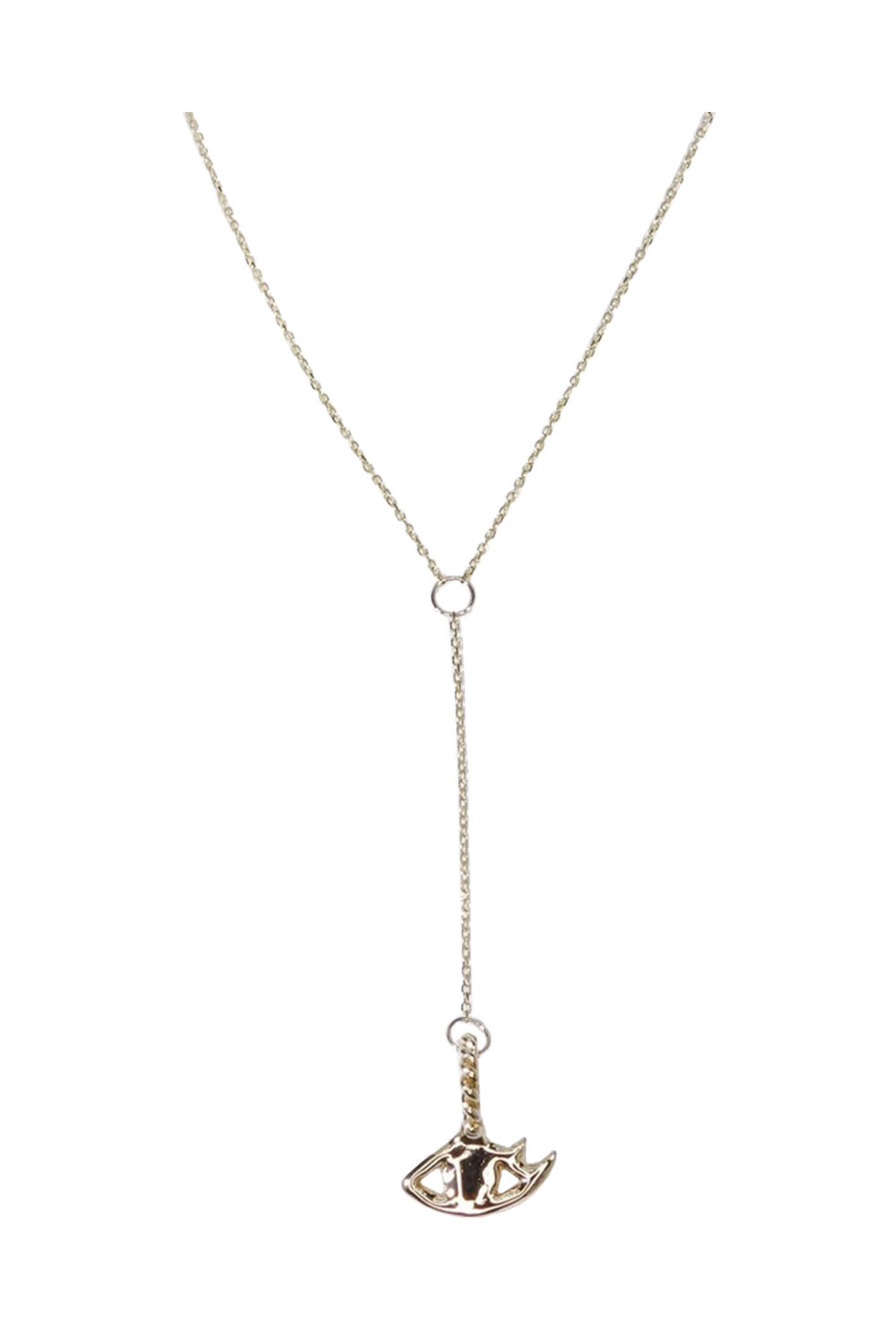 Talisman Fine Jewelry Mini Protective Eye Y Necklace. 14k yellow gold. Diamond cut cable chain. Concept of the protective eye, or evil eye. 2 lariat drop. 18 L. Lobster claw closure. Hand sculpted.