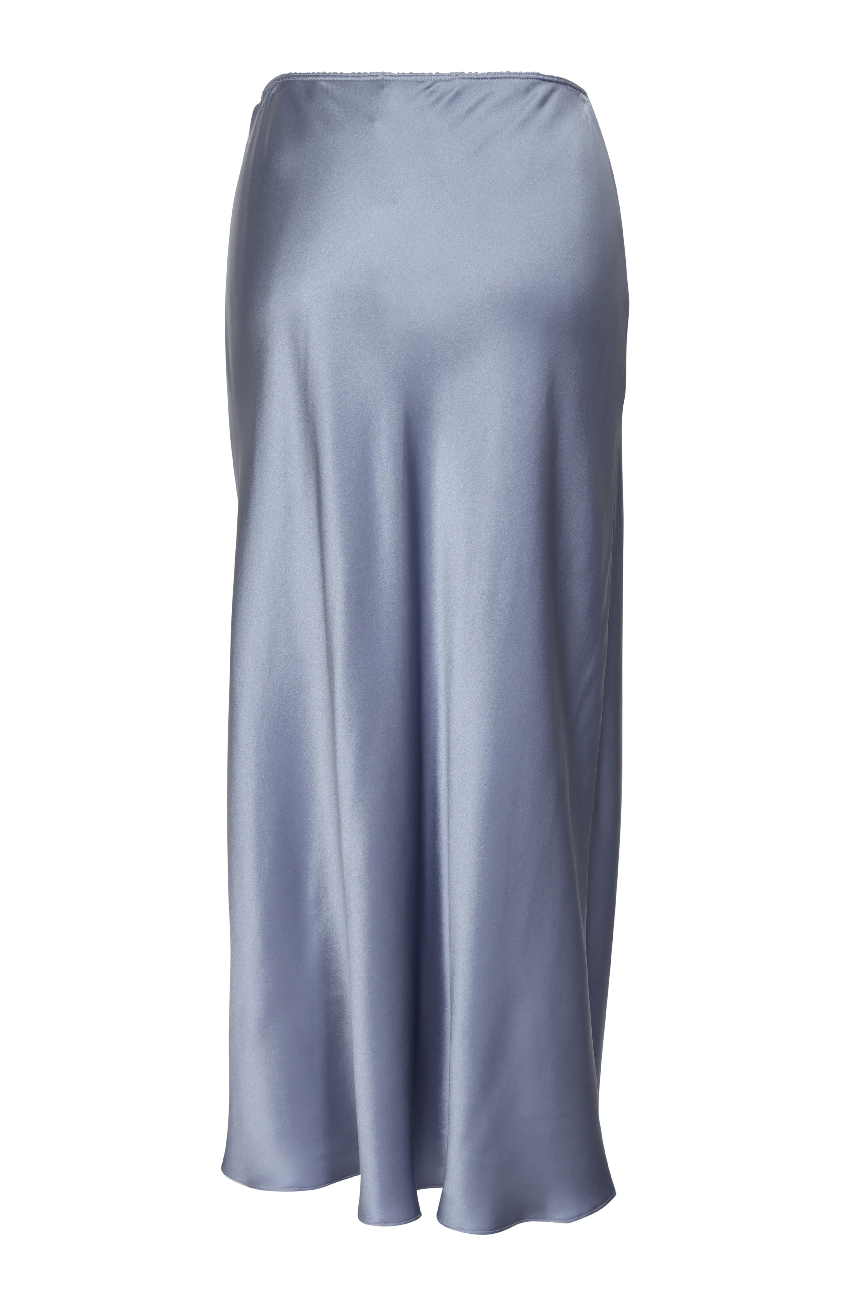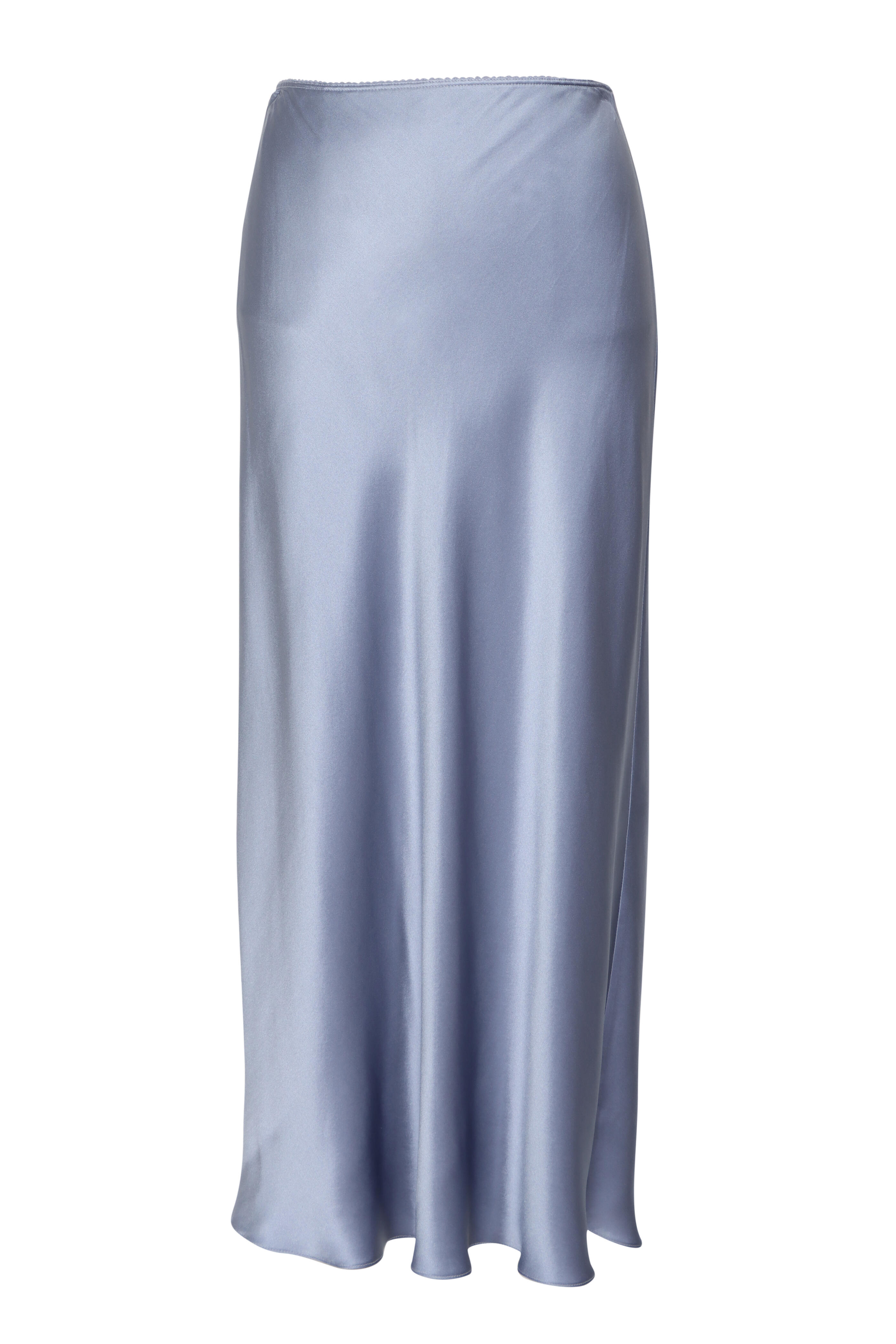 Flat elastic waistband. Bias cut. Imported. Midi length. 100% silk. Dry clean.