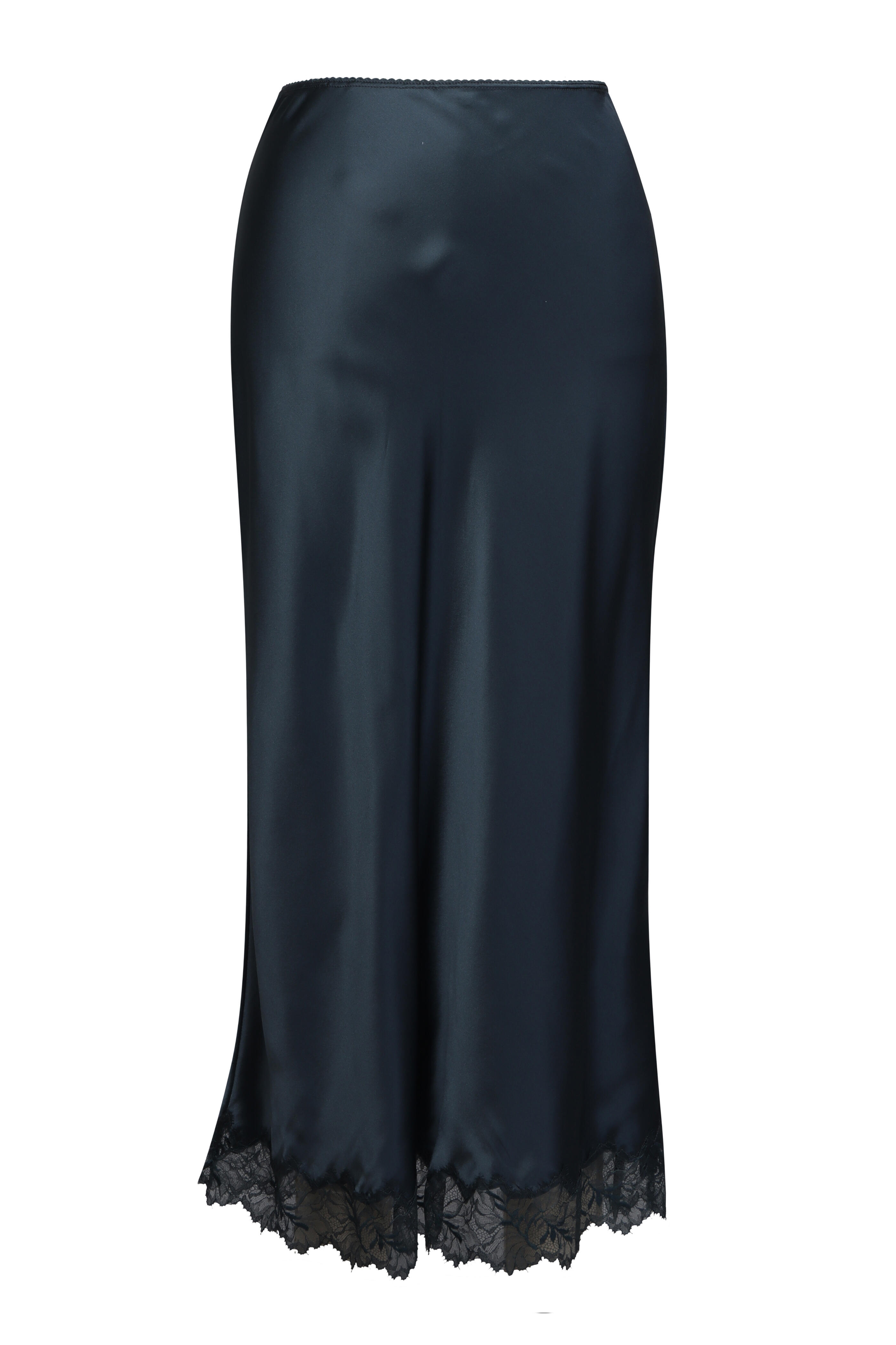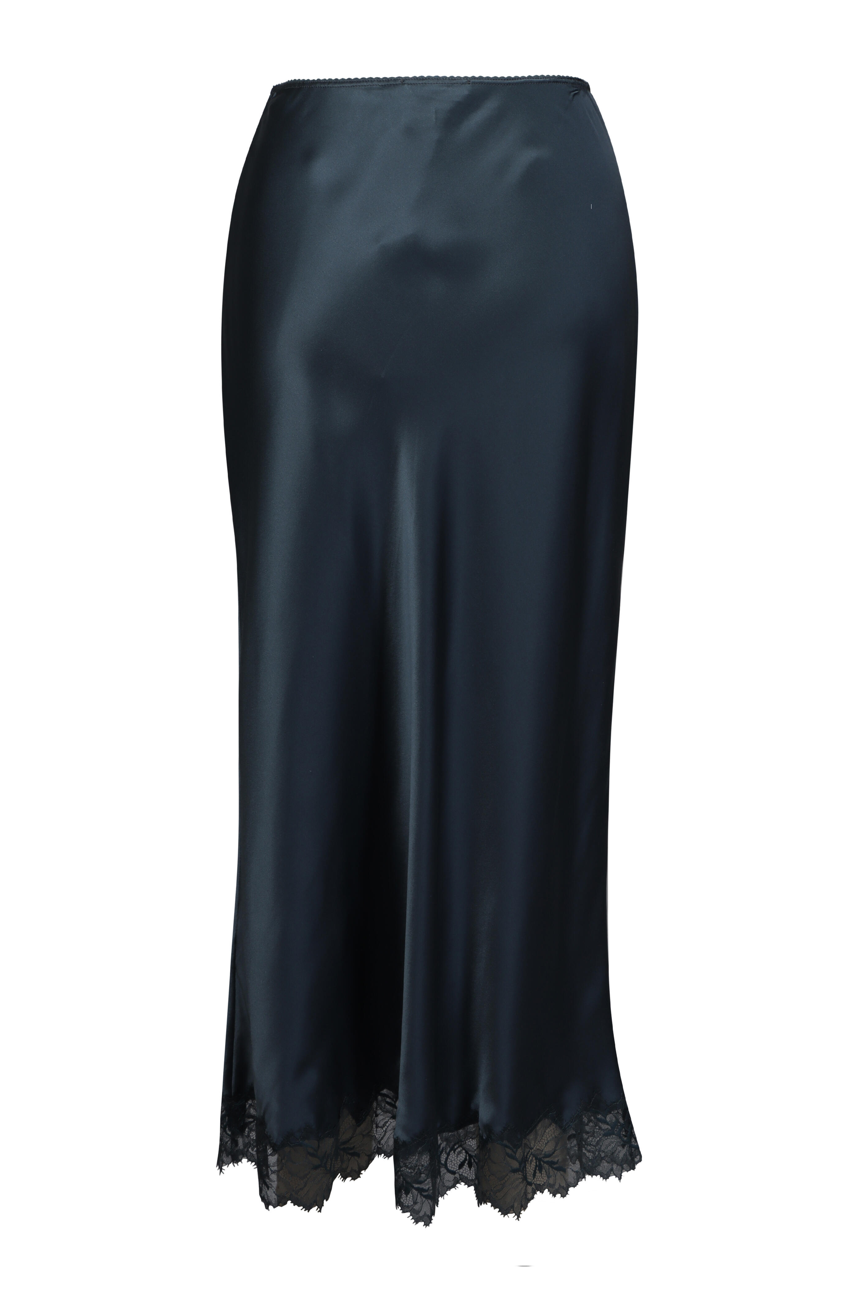 High rise. Flat waistband. Bias silhouette. Lace trim detail. Imported. Waist 27.5” (Size S). High hip 32.5” (Size S). Low hip 39.5” (Size S). 100% silk. Dry clean.