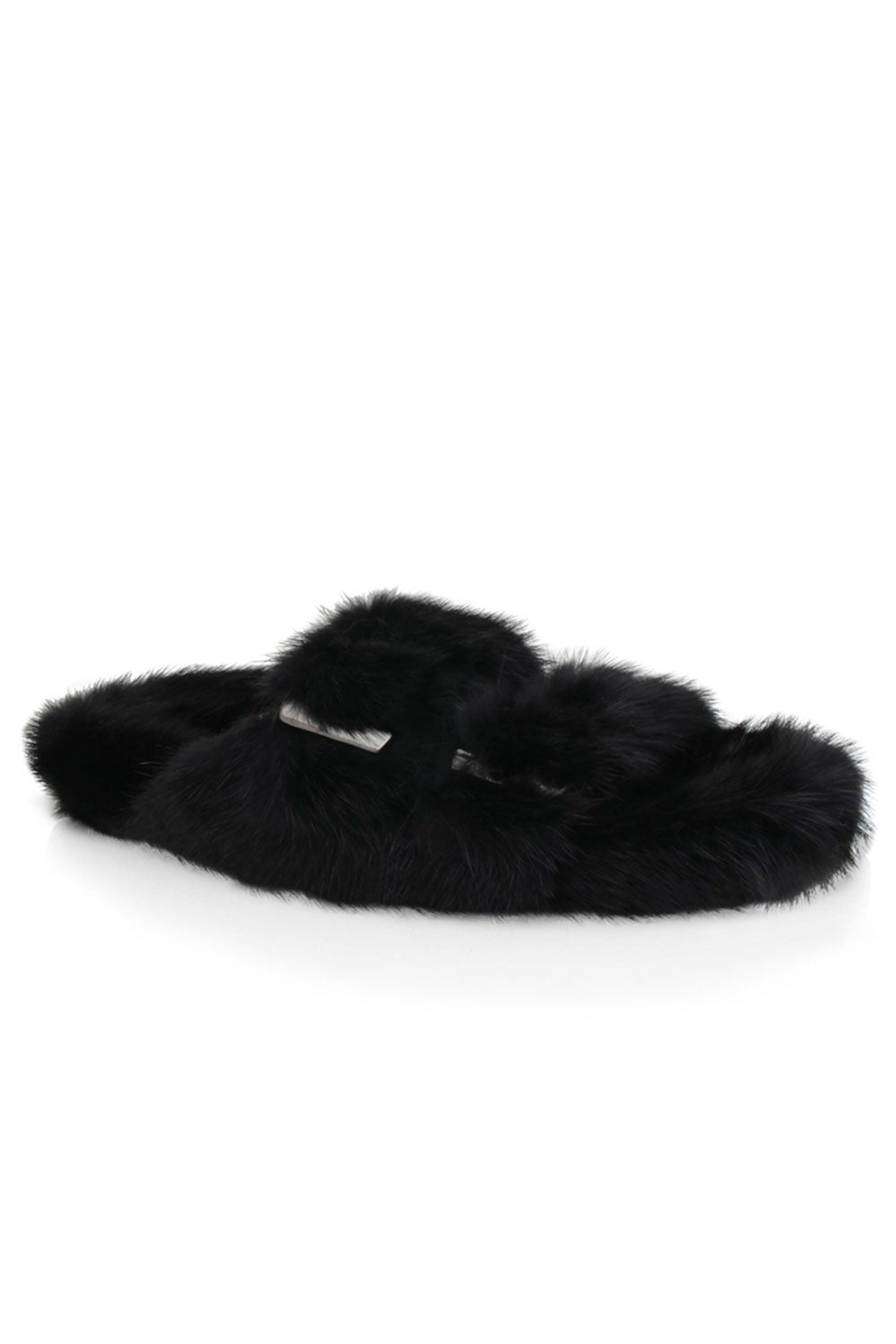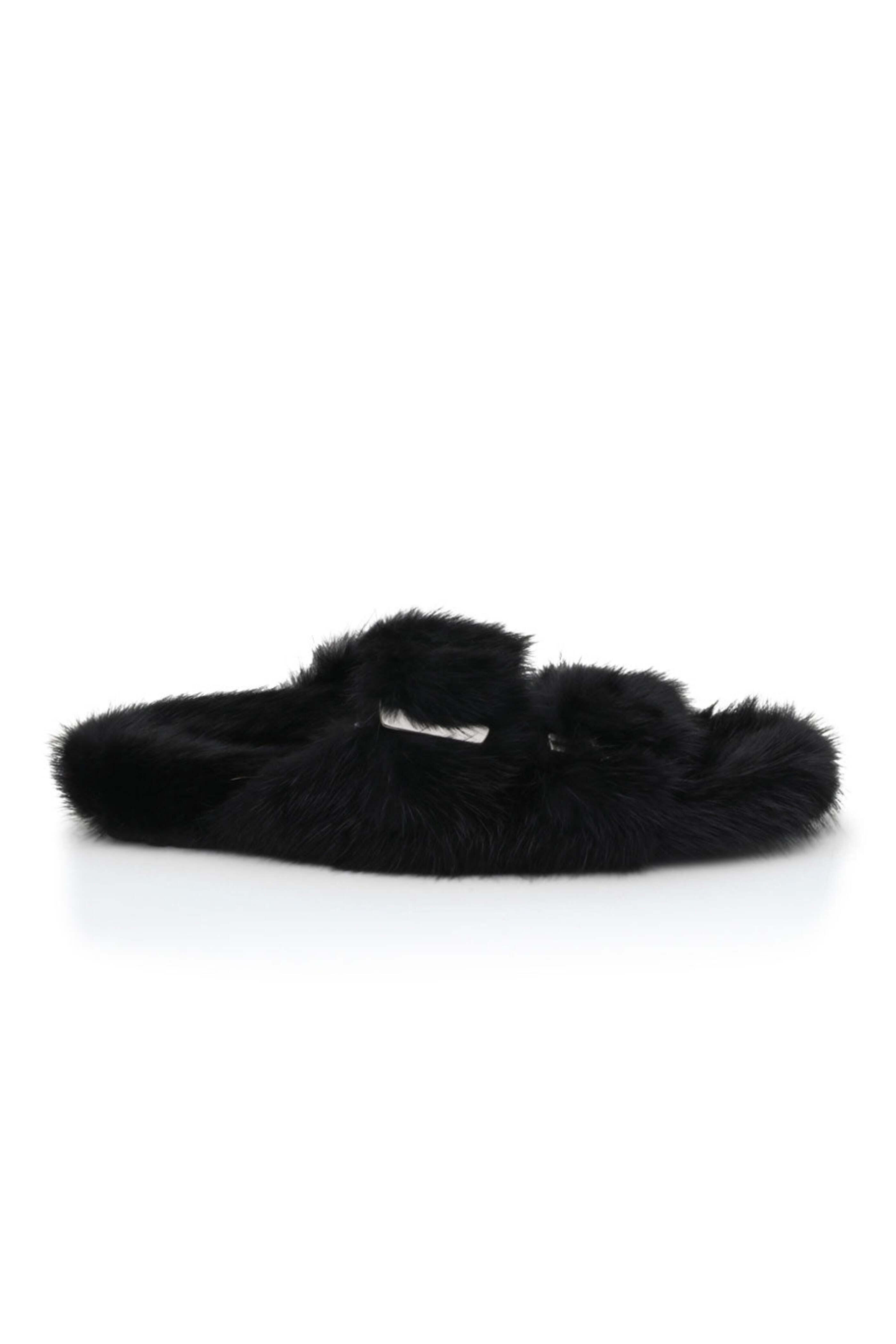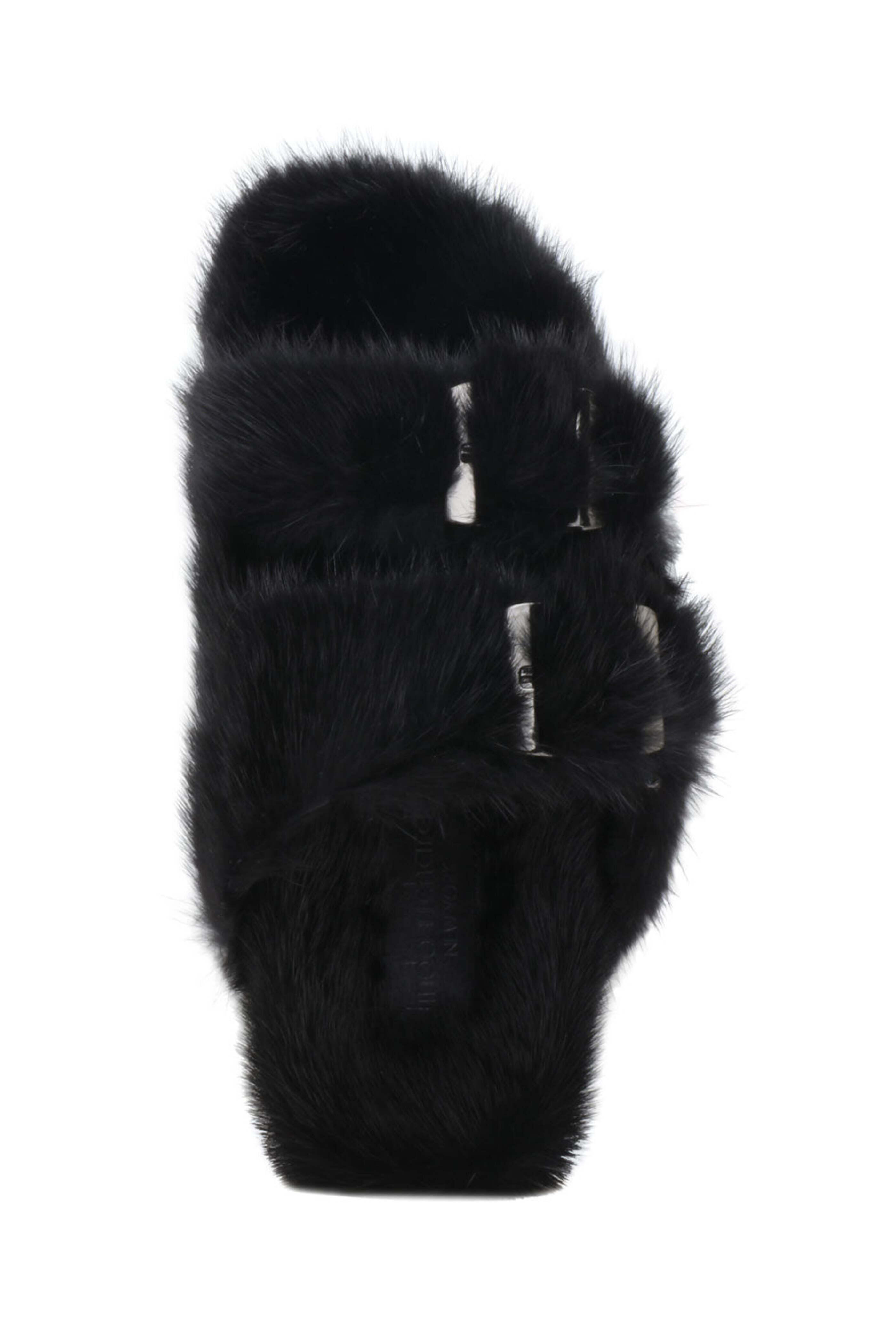 Linda Richards Mink Slides in Black. Open toe. Slip on. Double buckle vamp. Gunmetal hardware. Mink fur upper. Leather lining. Rubber sole.