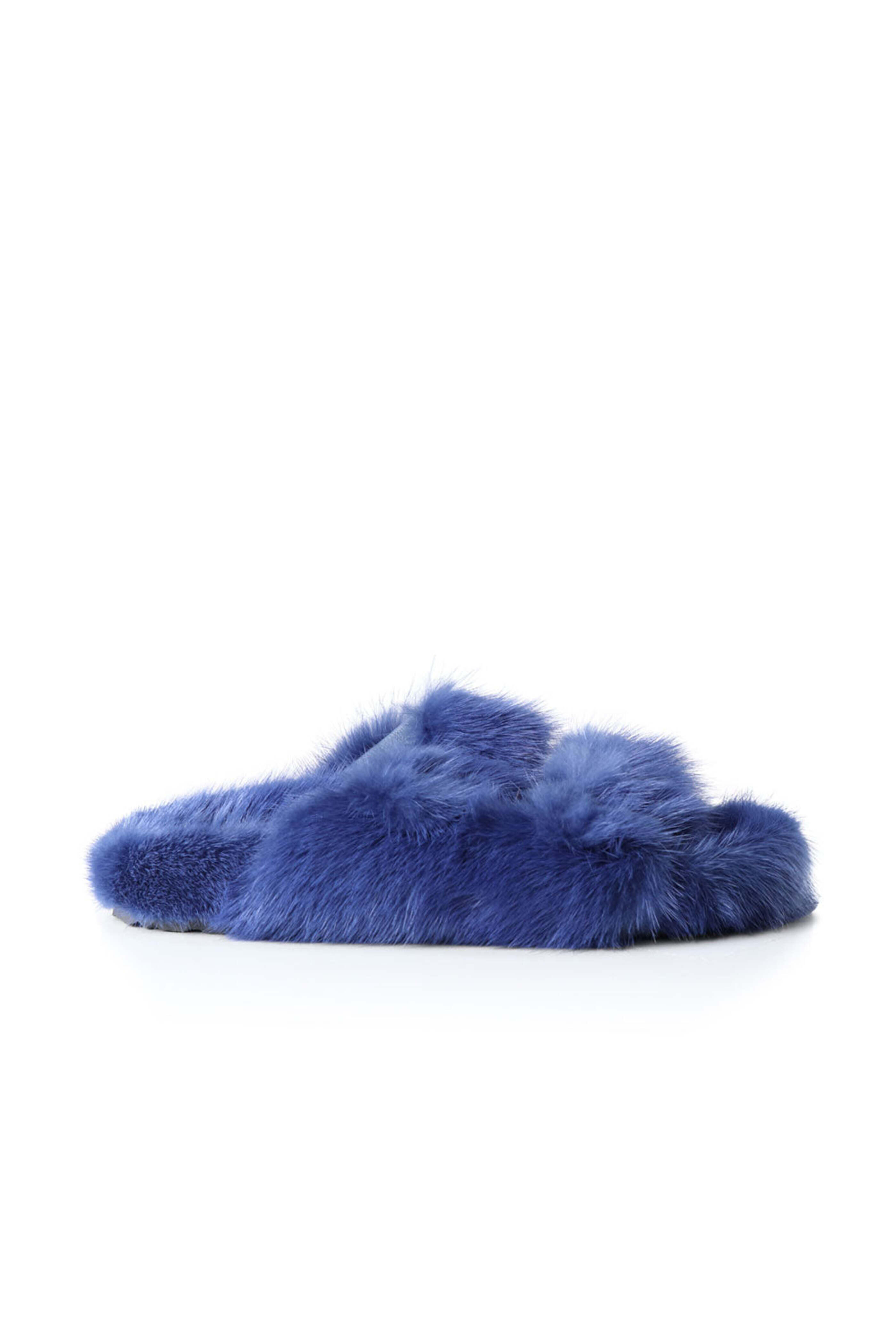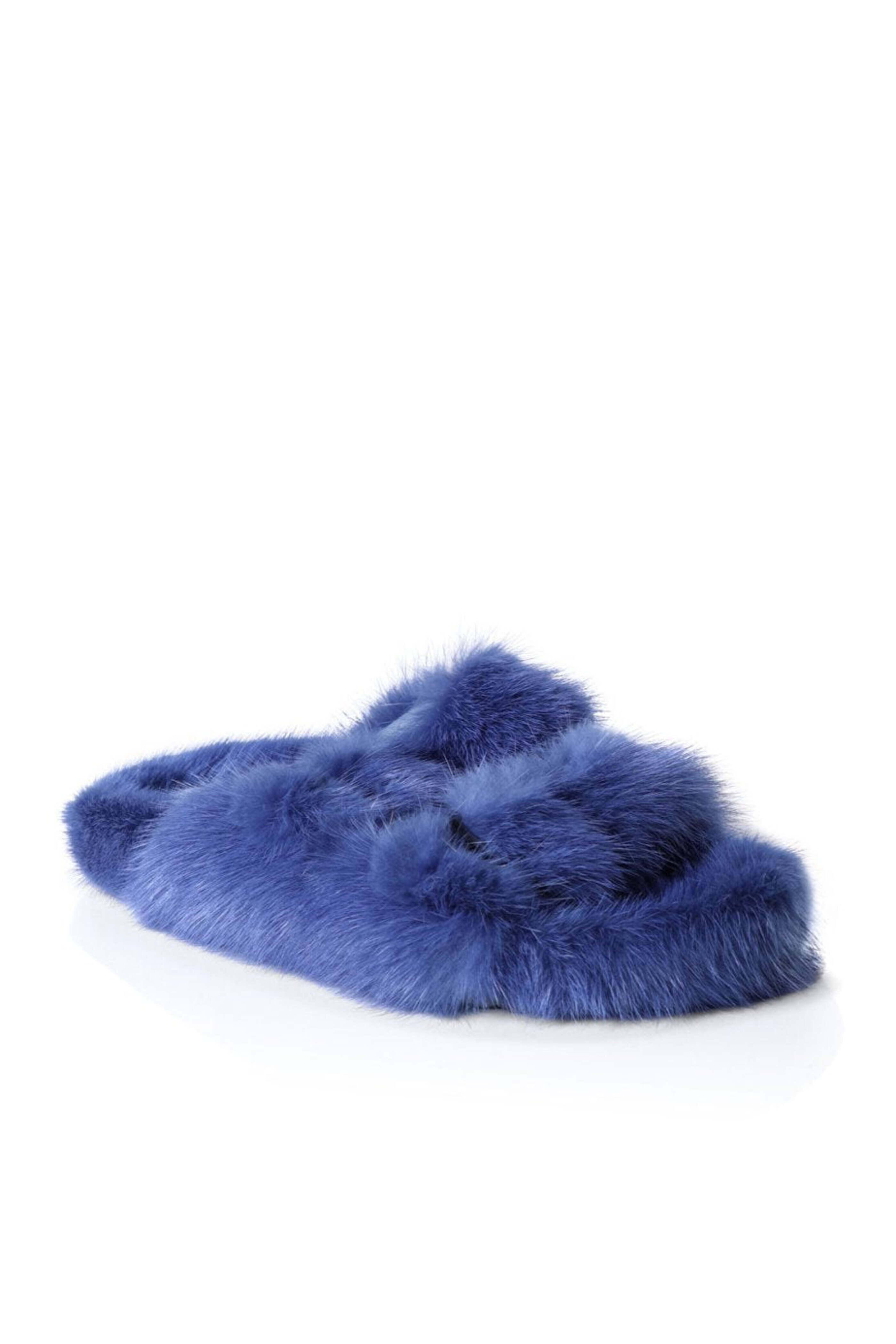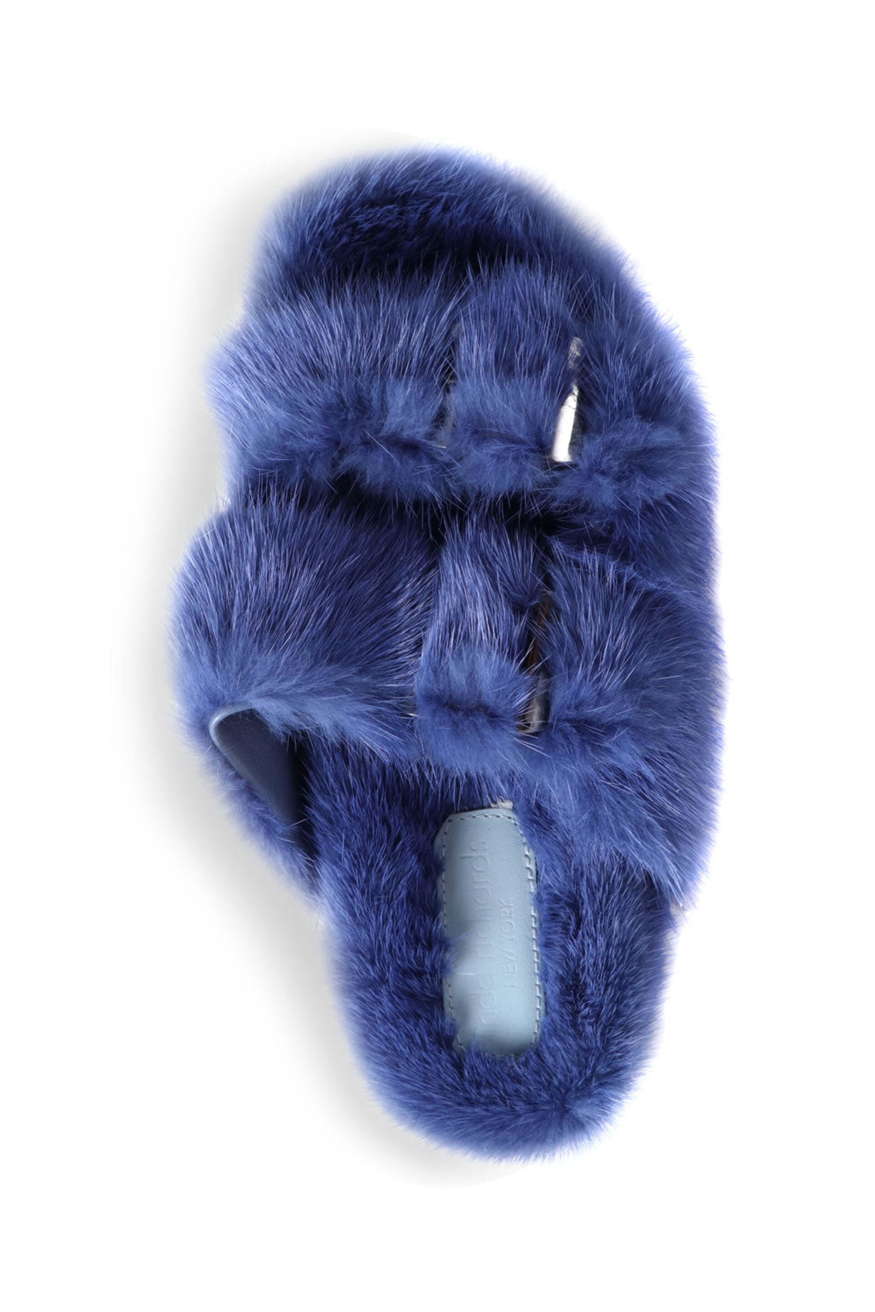 Linda Richards Mink Slides in Denim. Open toe. Slip on. Double buckle vamp. Gunmetal hardware. Mink fur upper. Leather lining. Rubber sole.