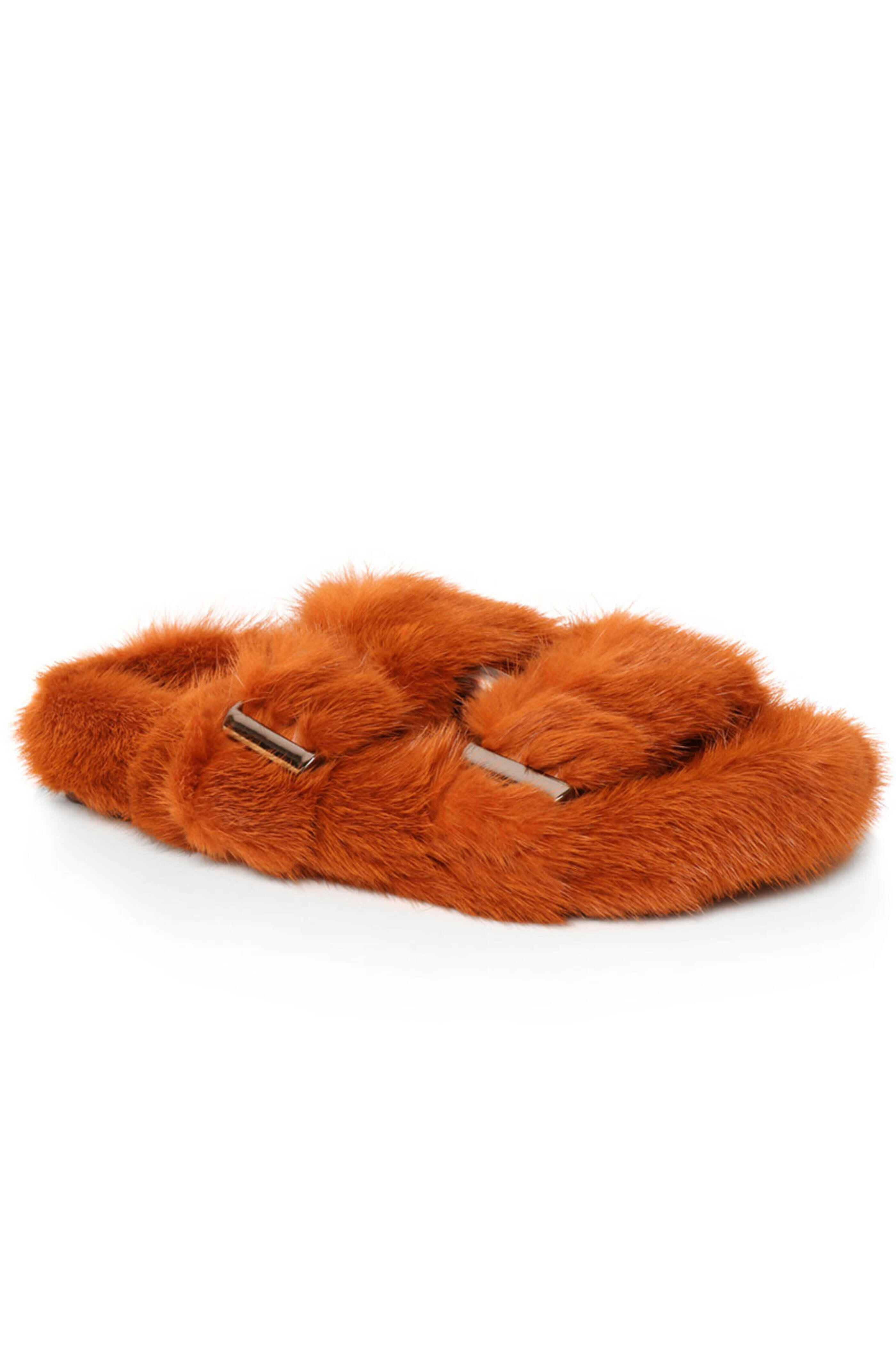 Linda Richards Mink Slides in Spice. Open toe. Slip on. Double buckle vamp. Gunmetal hardware. Mink fur upper. Leather lining. Rubber sole.