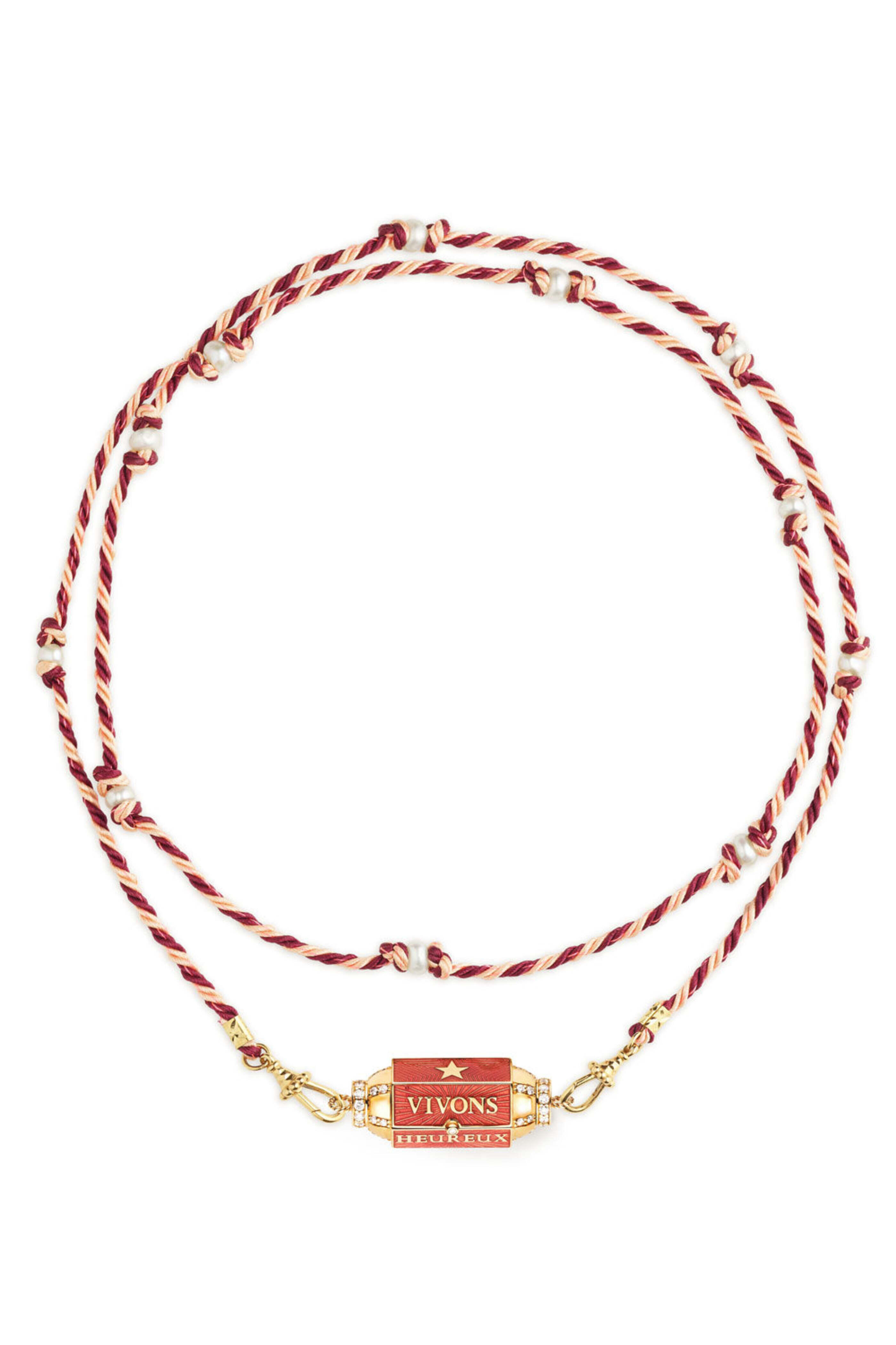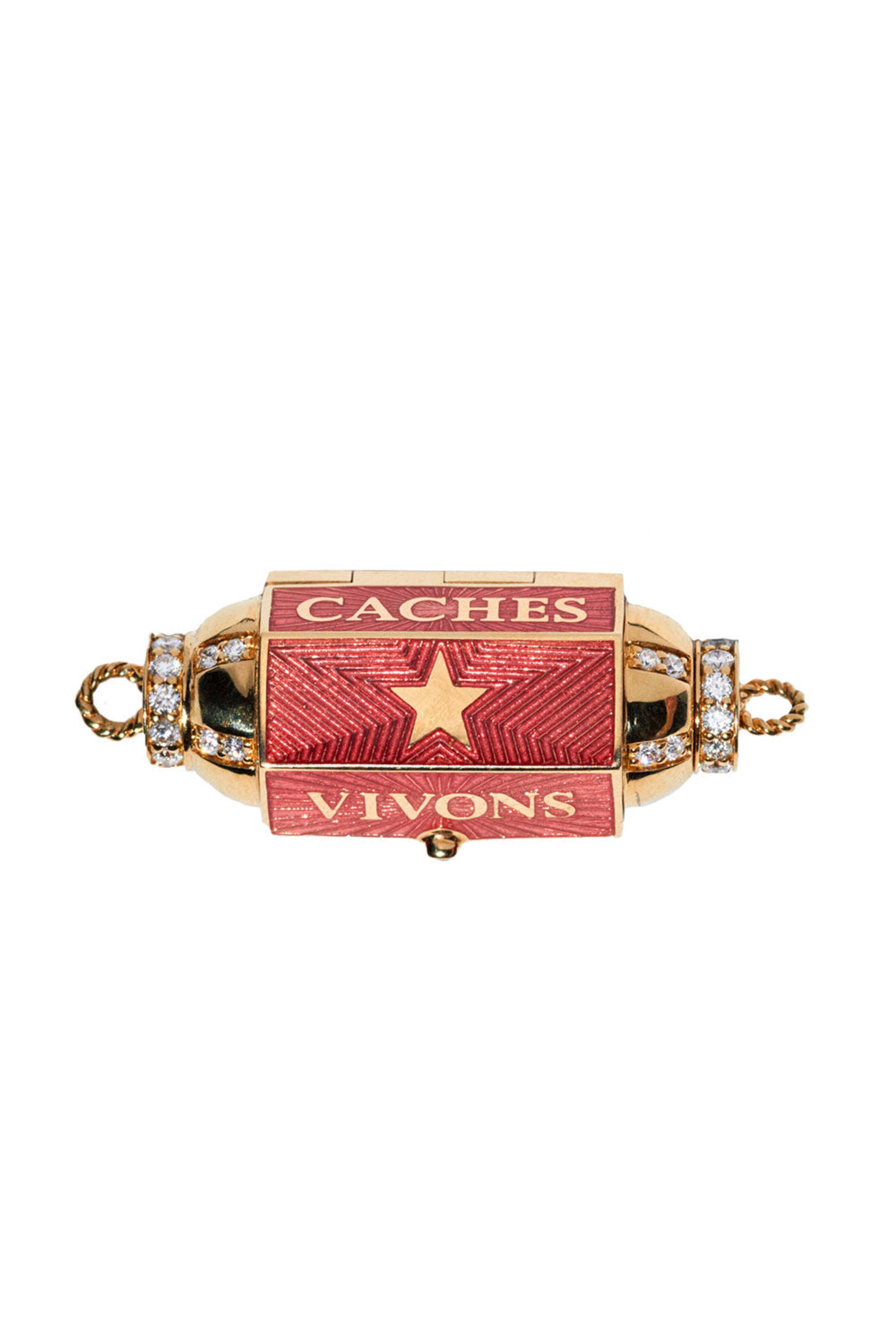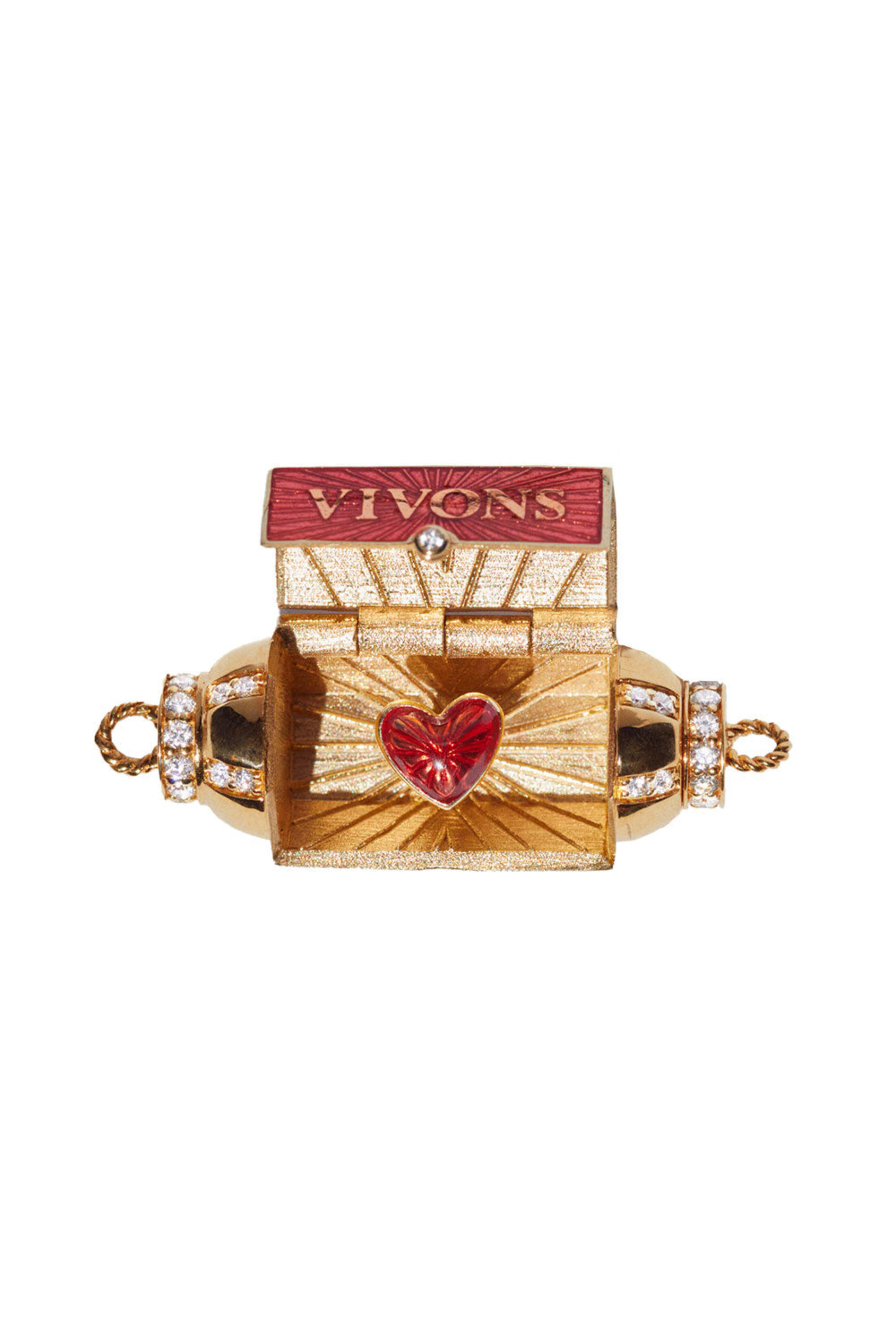 Marie Lichtenberg Vivons Heureux Box Locket Necklace. 18k yellow gold. Diamond 0.76 total carat weight. Pearl. Enamel. 3-D style; push button to open locket. Rope detailing. Star design. Heart design. Casches and vivons message on exterior. Engraved detailing. Rope chain.