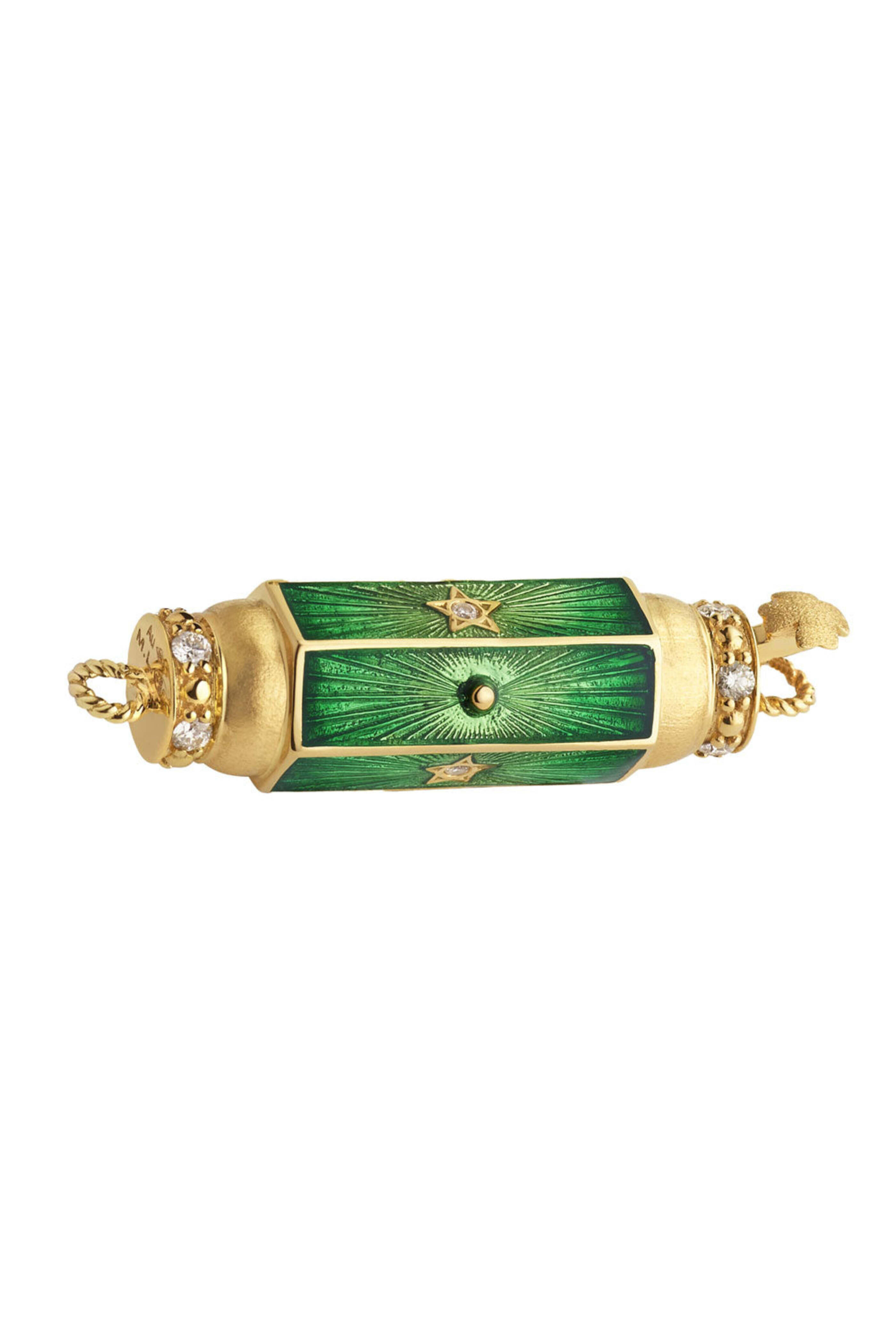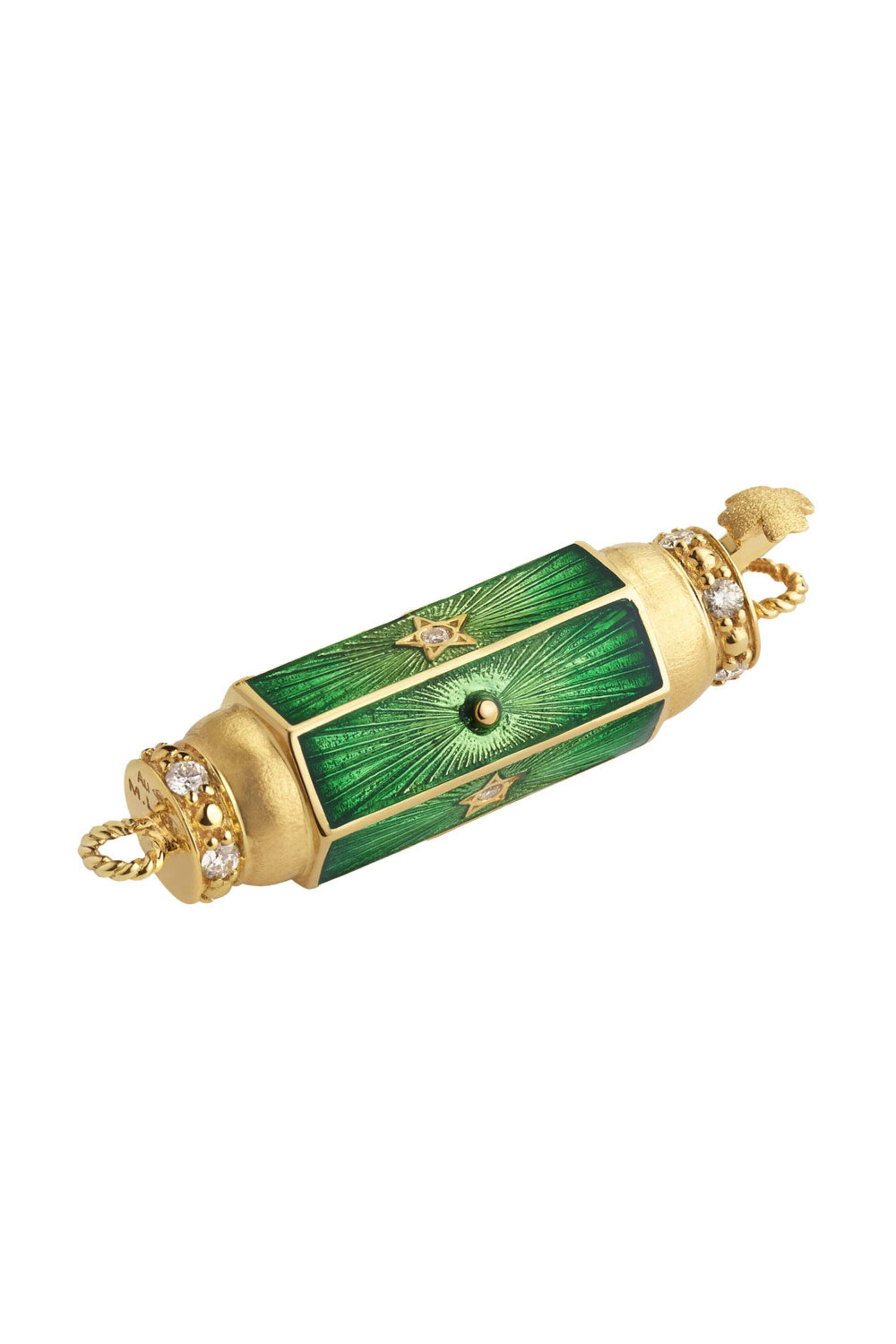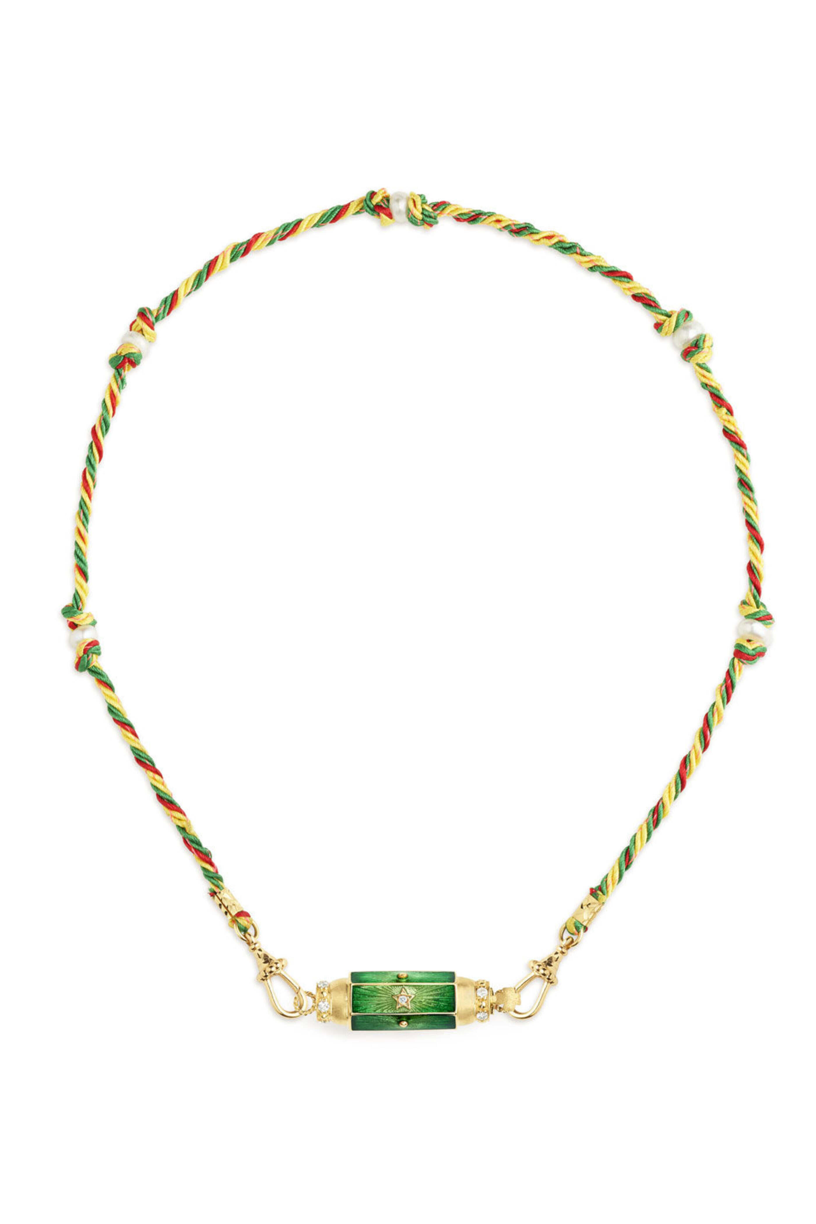 Marie Lichtenberg Green Baby Locket Necklace. 14k yellow gold. Diamond 0.26 total carat weight. Pearl. Enamel. Star design. Four leaf clover charm. Engraved detailing. Rope chain.