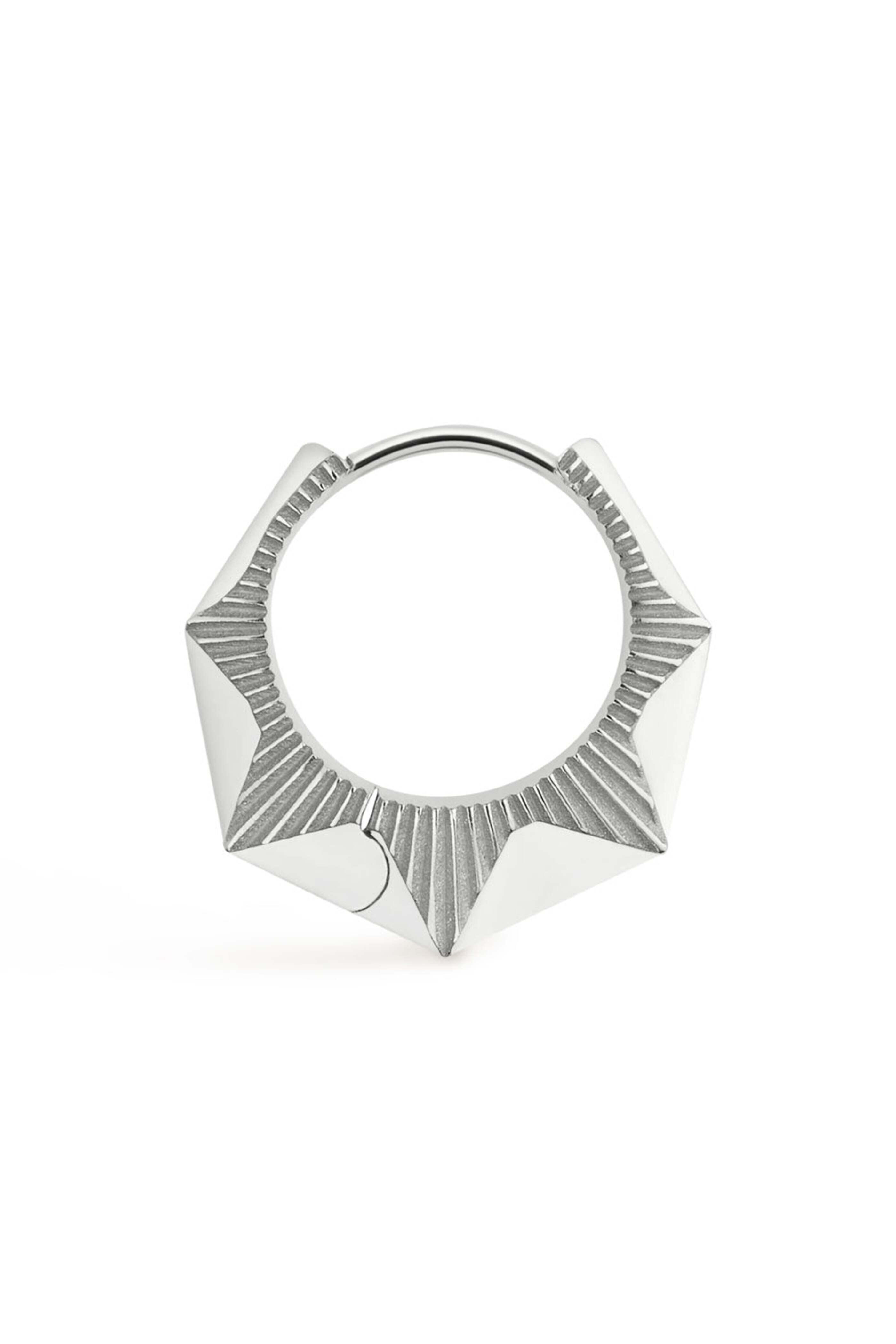 Marie Lichtenberg Small NYC Boucle Hoop Earring. 18k white gold. Engraved detailing. Hoop style. 0.39 D. Hinge huggie closure. Sold as a single earring.