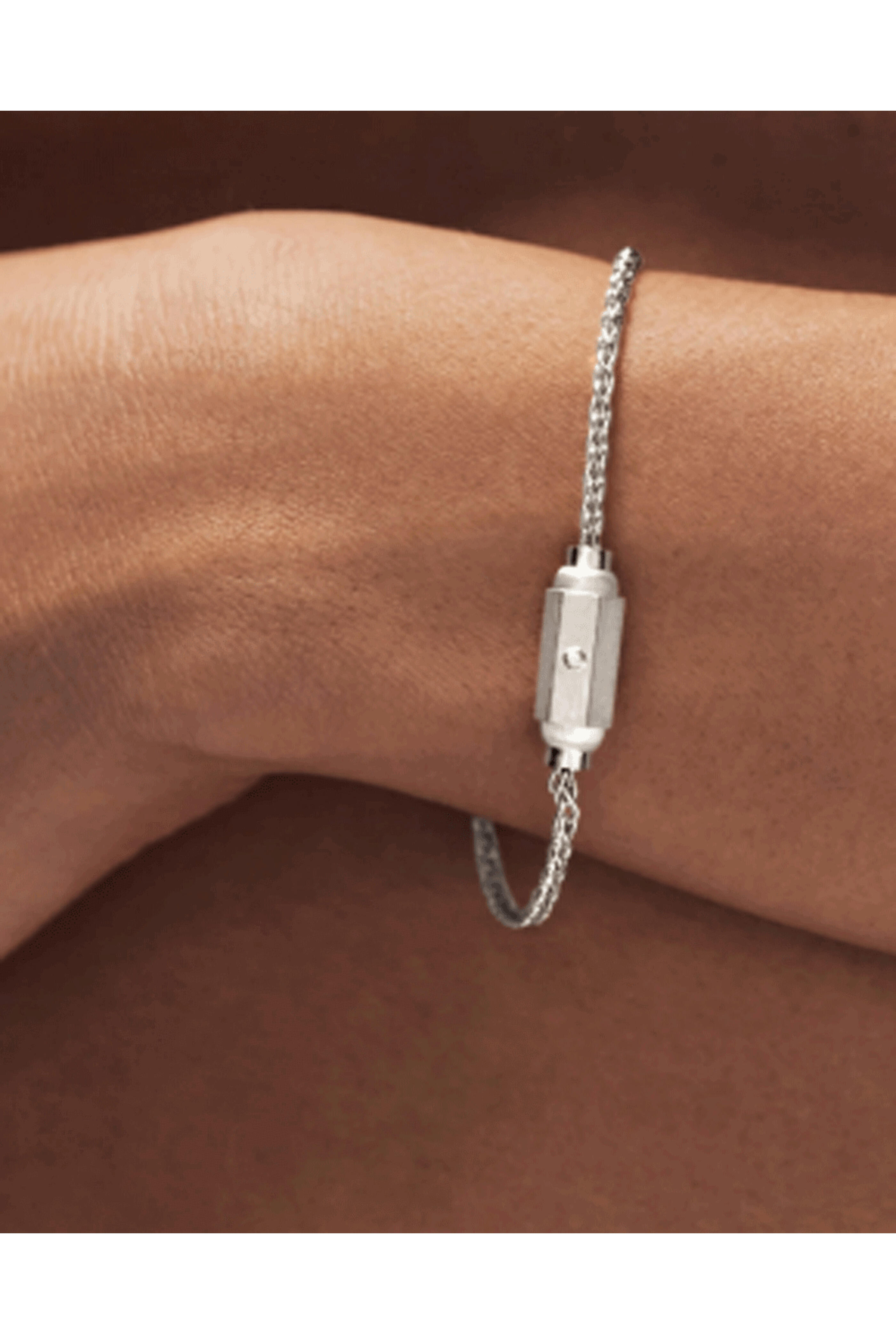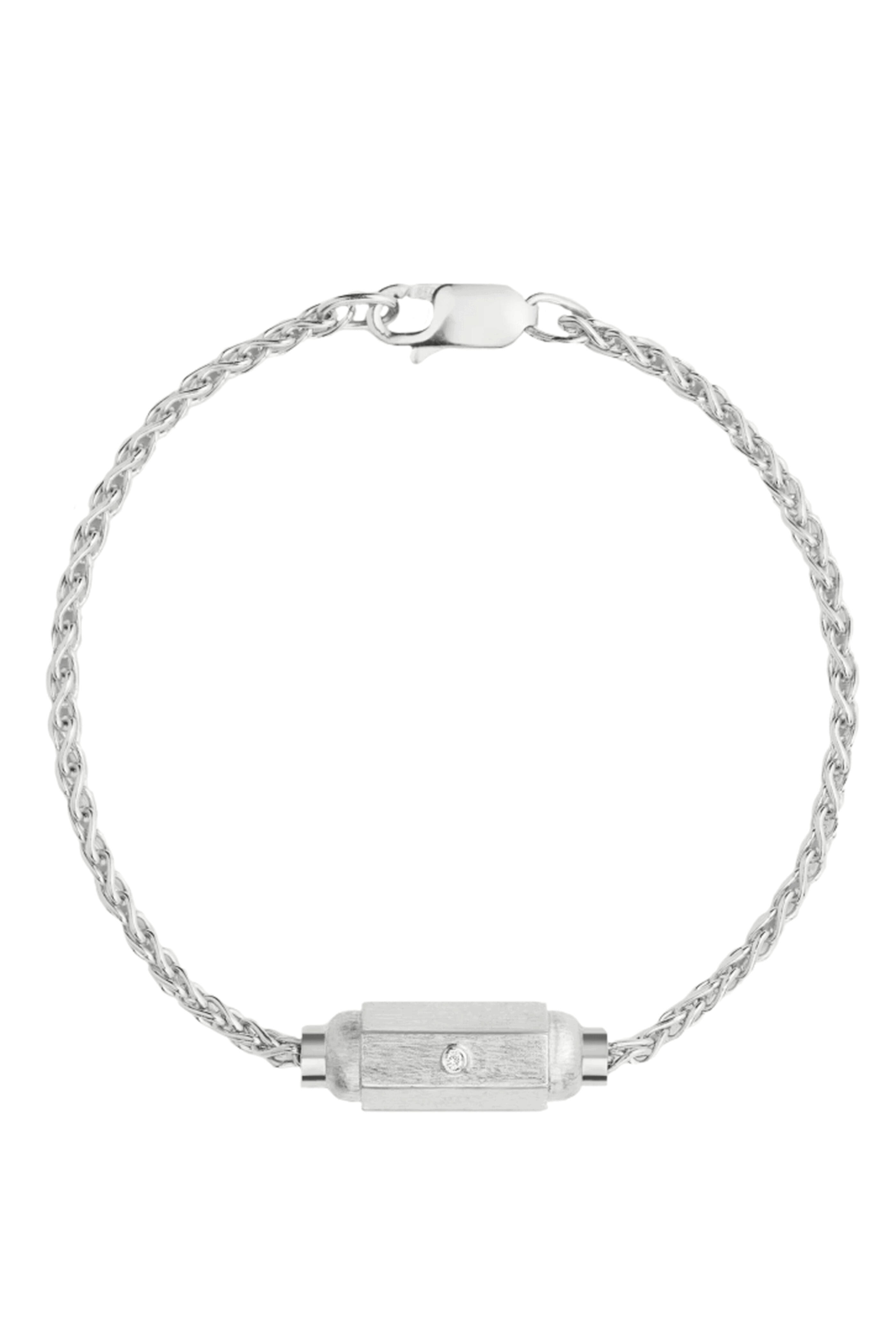 Marie Lichtenberg White Gold Micro Coco Bracelet. 18k white gold. Diamond. Micro locket. Spiga chain. Gold brushed finish. Lobster claw clasps.