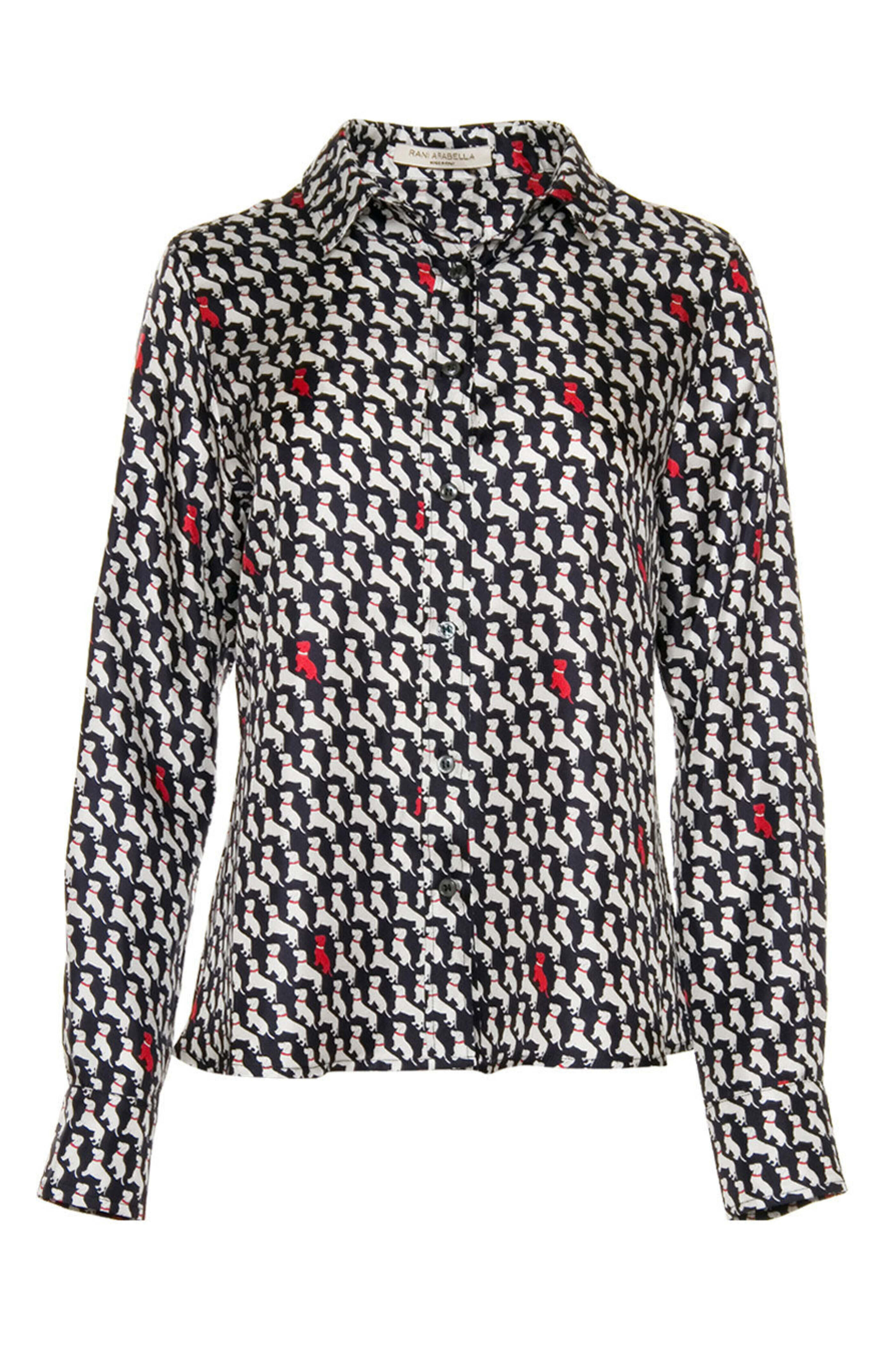 - Rani Arabella Navy and White Dog Printed Silk Shirt Point collar Front button closure Long sleeves; button cuffs Rounded hem 100% silk Made in Italy