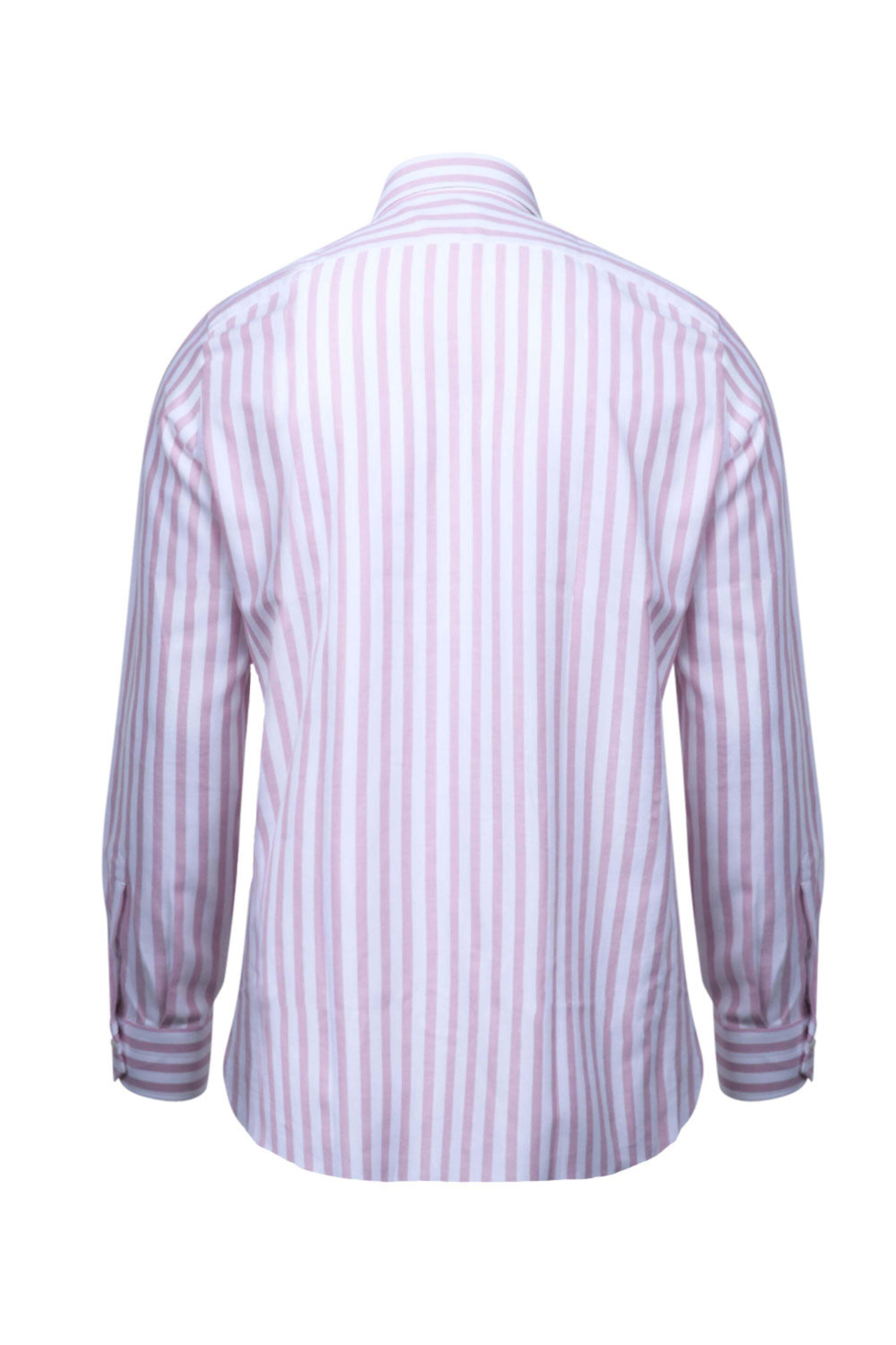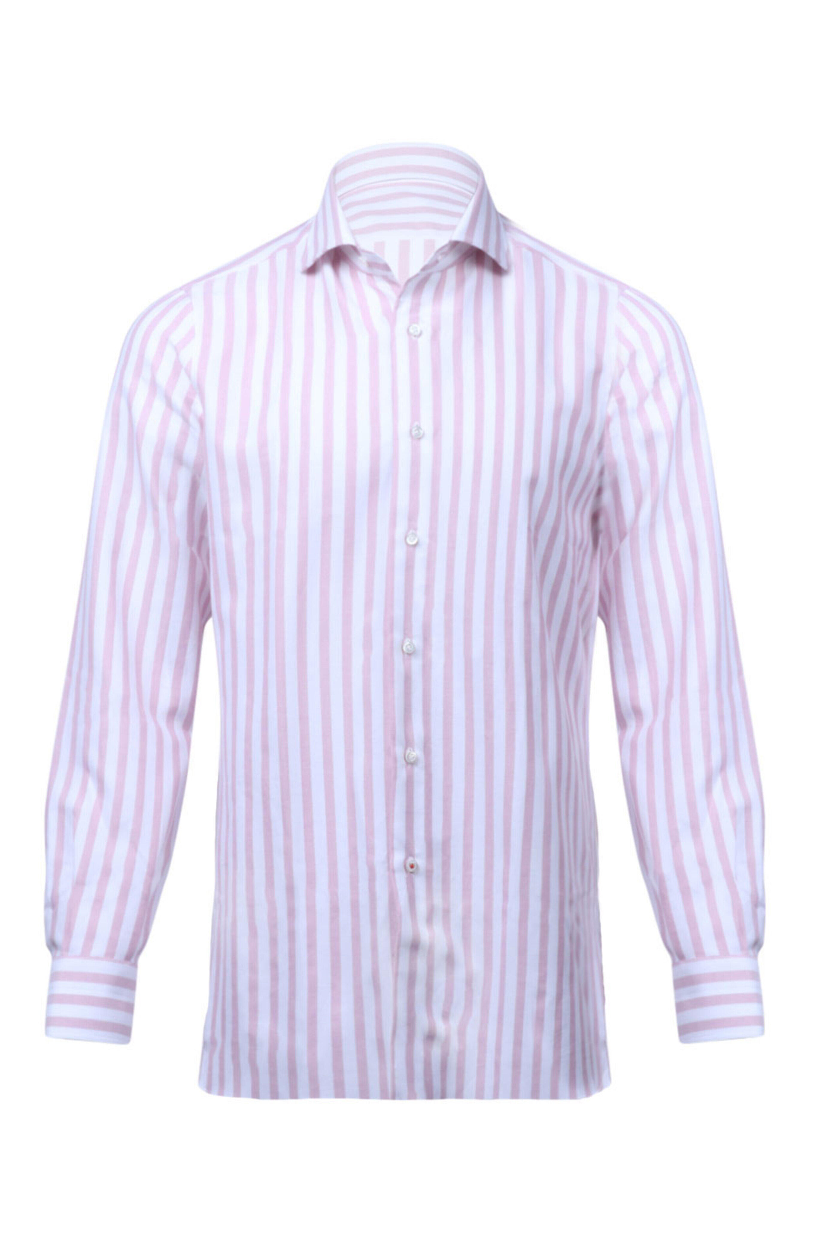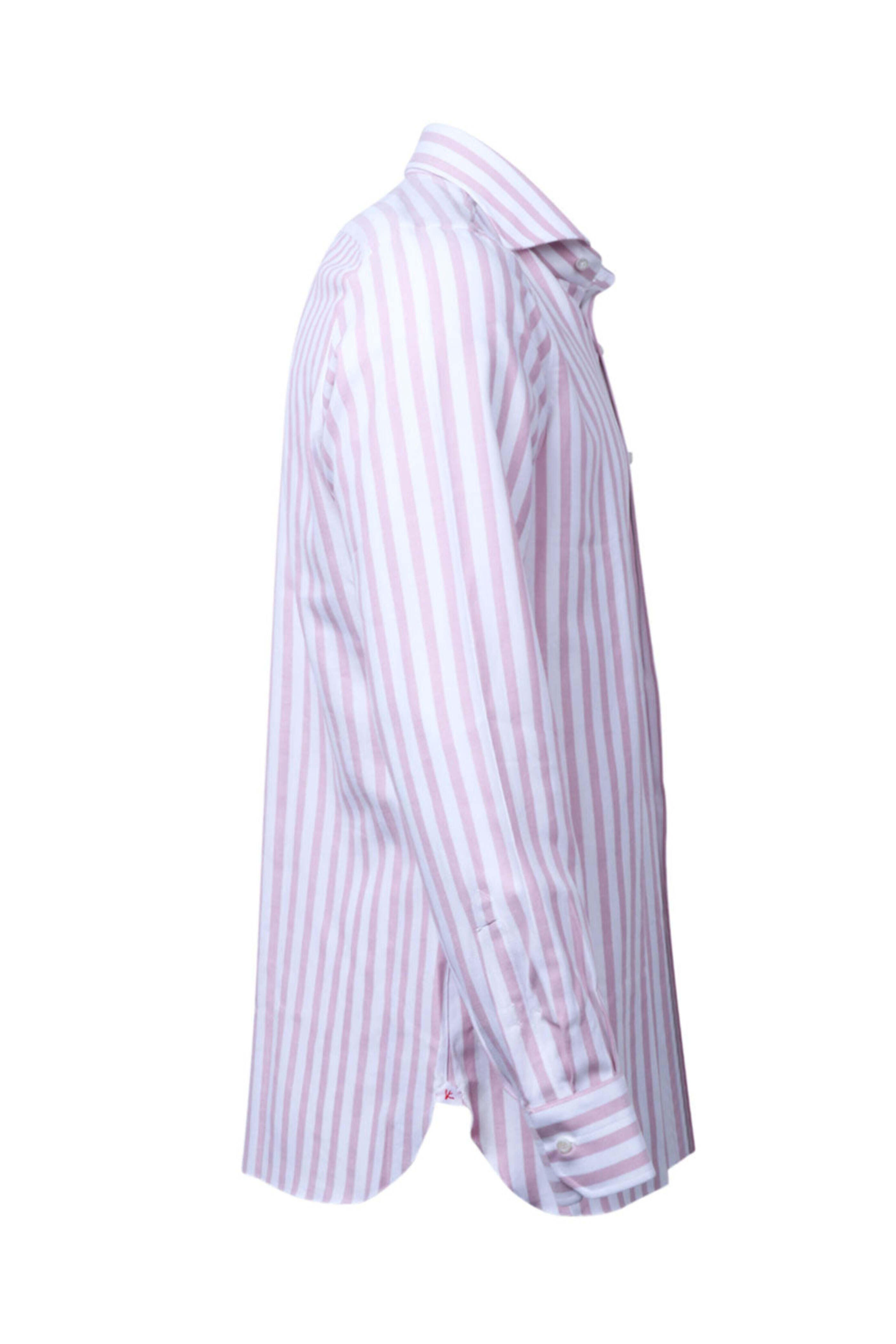 Isaia Pink and White Striped Dress Shirt. Spread collar. Button down closure. Long sleeves. Mitered barrel cuffs. Made in Italy. 100% cotton .