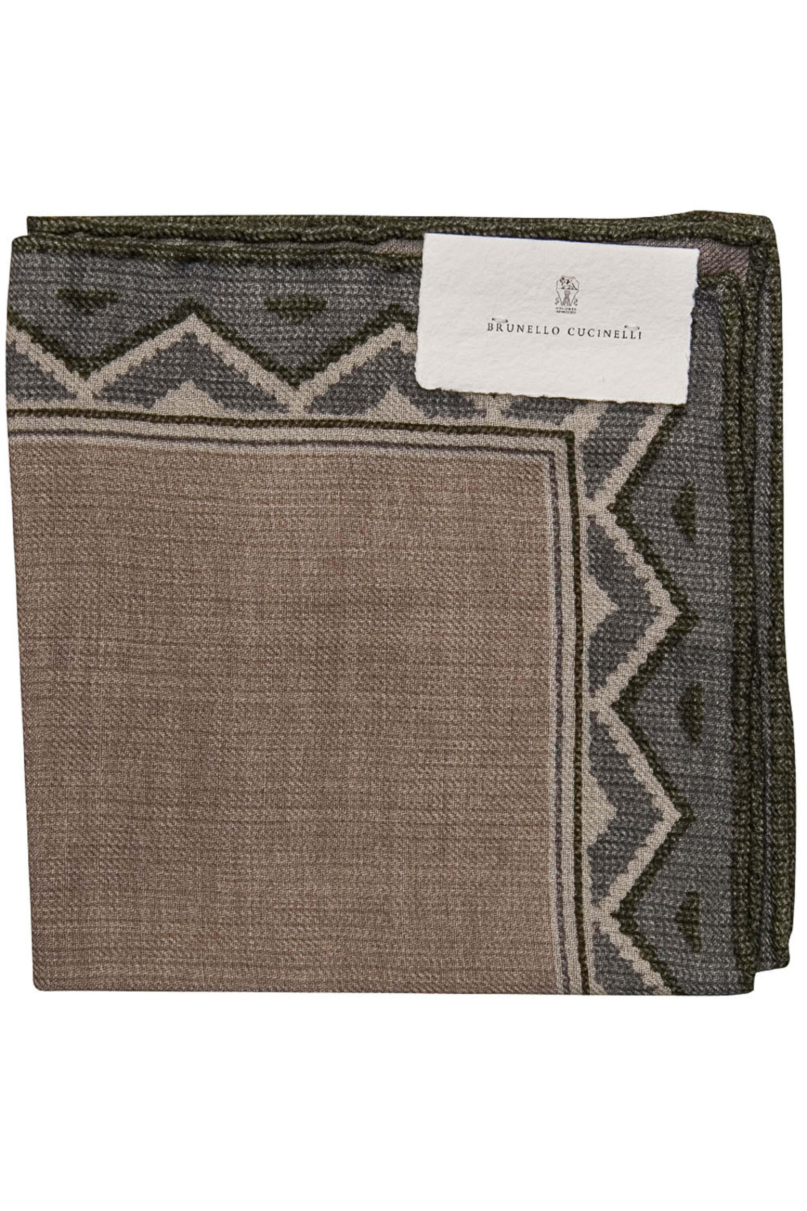 Brunello Cucinelli Taupe, Forest, and Slate Geometric Pocket Square. Pick stitch detailing. 13.75 X 13.75. Made in Italy. 100% wool.