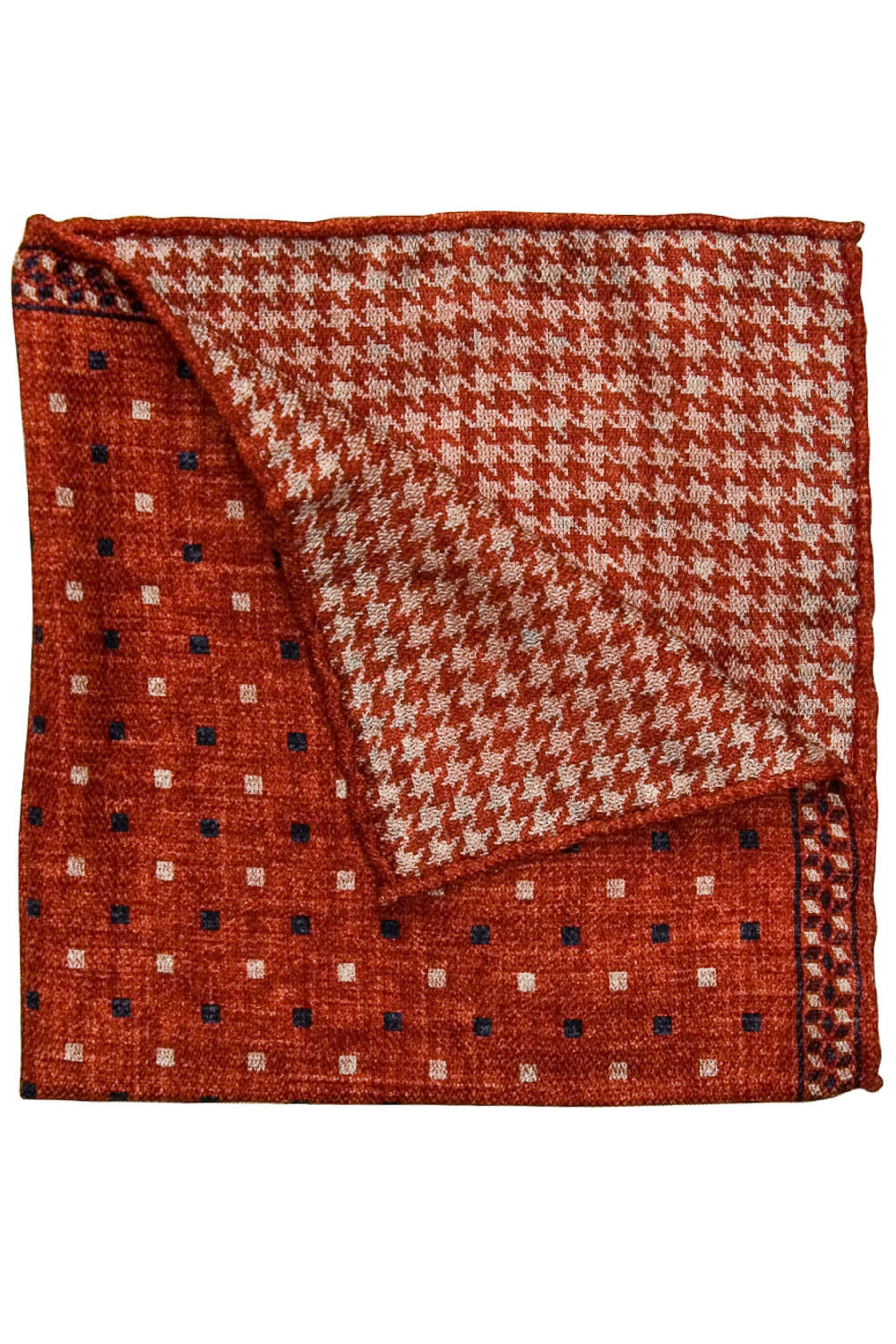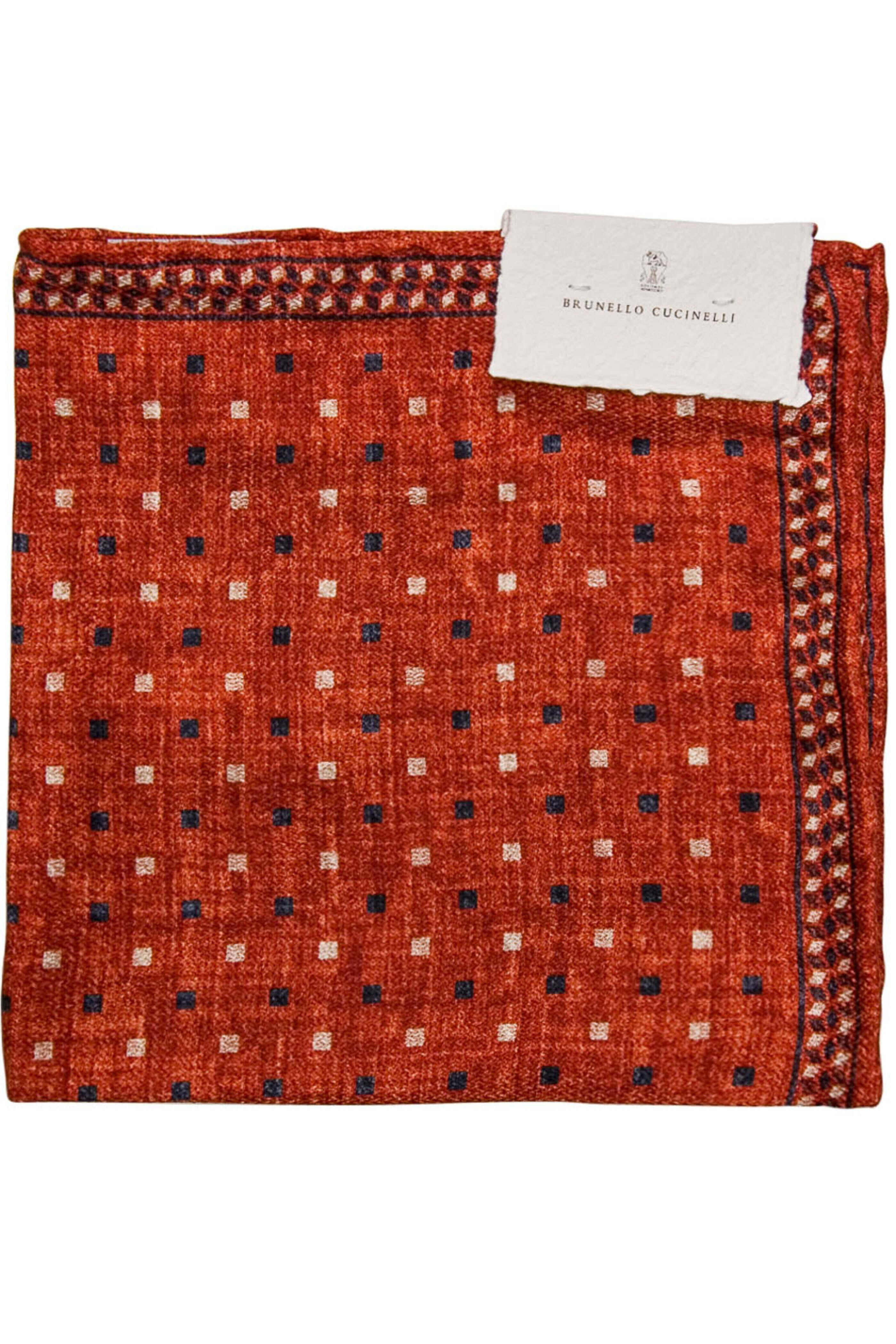 - Brunello Cucinelli Burnt Orange Geometric Reversible Pocket Square Reversible pocket square Pick stitch detailing 13.75 X 13.75 100% silk Made in Italy