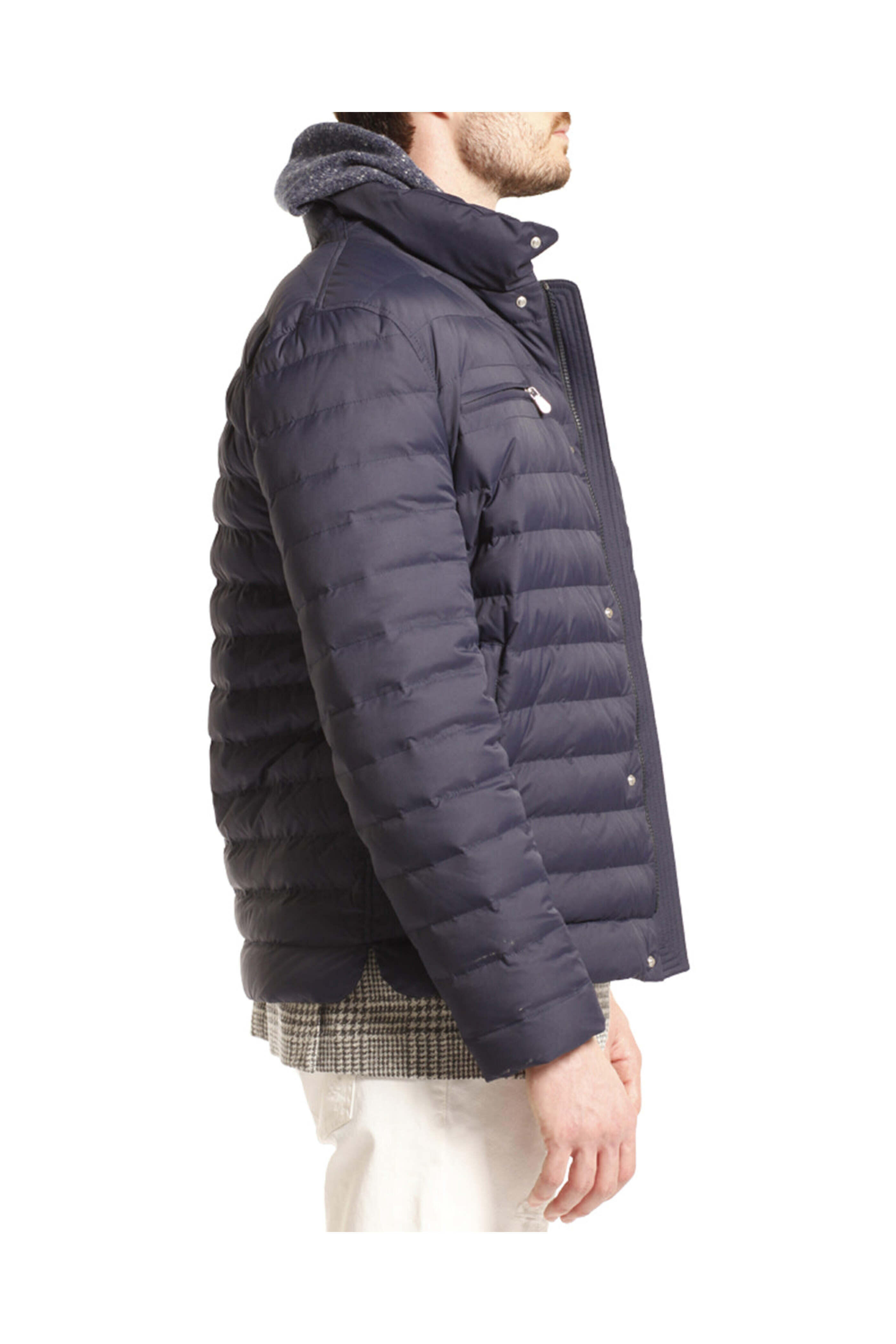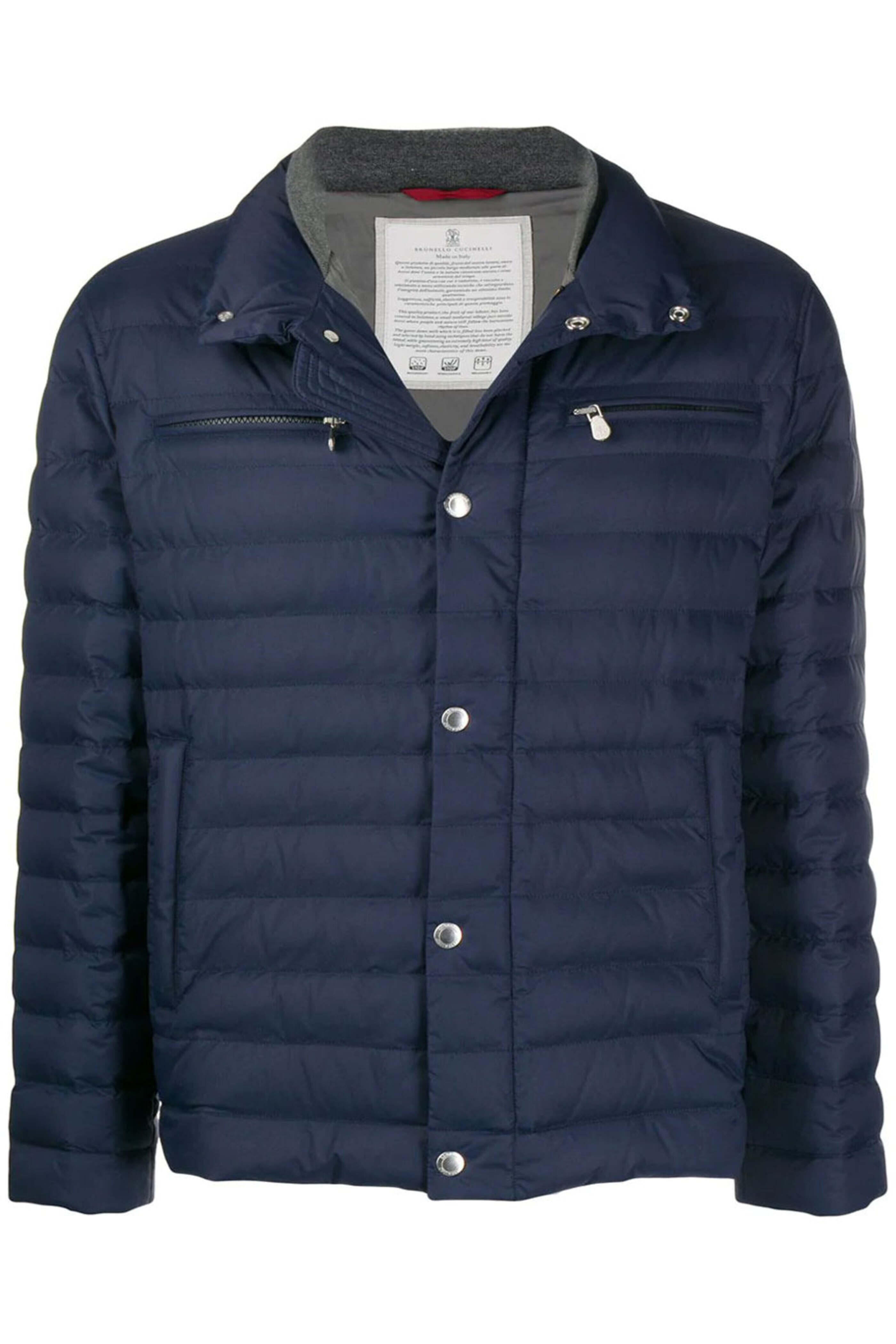 - Brunello Cucinelli Dark Blue Nylon Quilted Jacket Stand collar with rib knit interior collar Two-way zip front closure with snap button overlay Zippered chest pockets Zippered waist pockets Two interior pockets with snap button closure and pen holder Grey nylon lining 100% Nylon Made in Italy