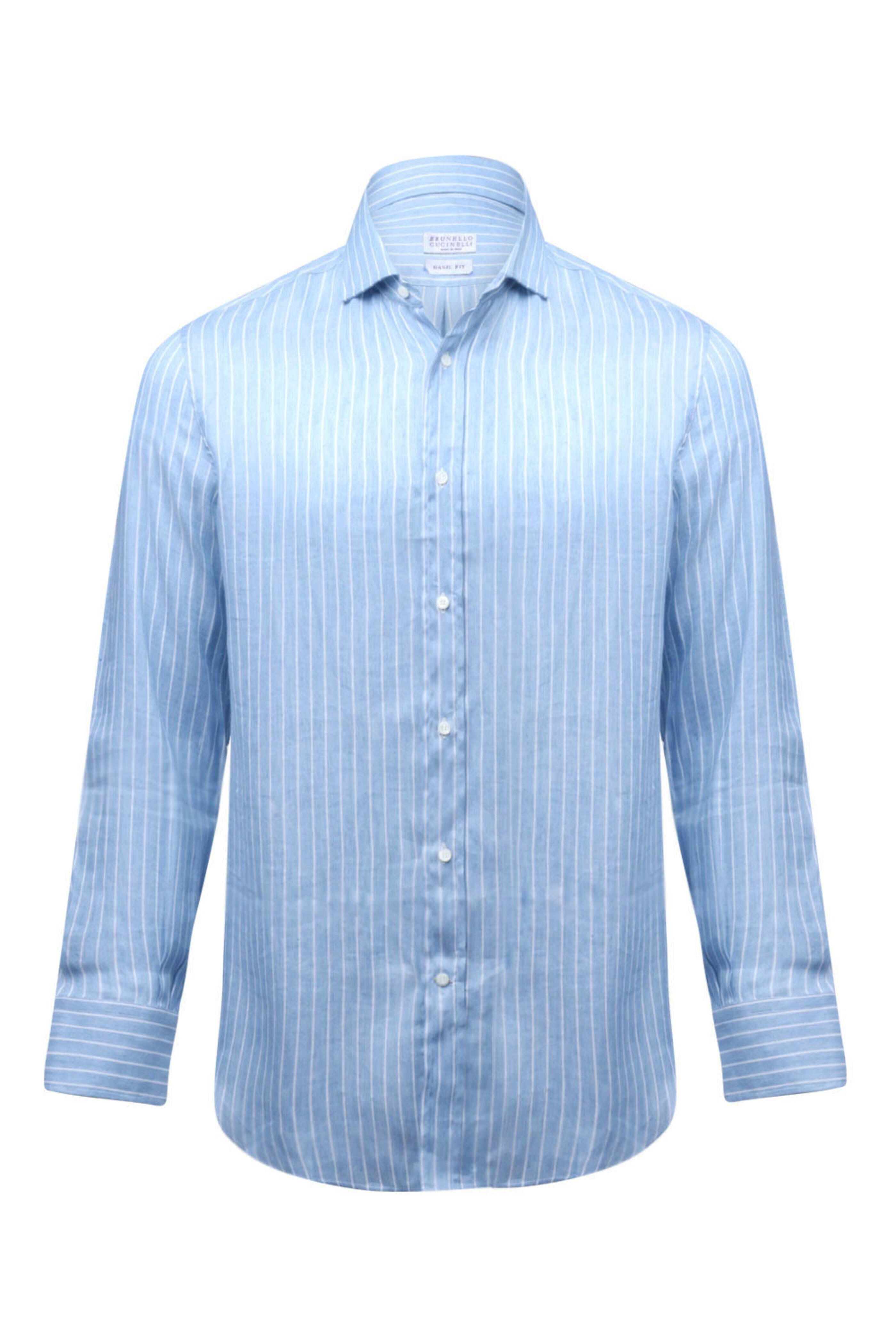 Brunello Cucinelli Blue and White Striped Linen Blend Sportshirt. Spread collar. Button down front. Long sleeves. Double button straight cuffs. Curved hem. Basic fit. Made in Italy. 66% linen 34% lyocell.