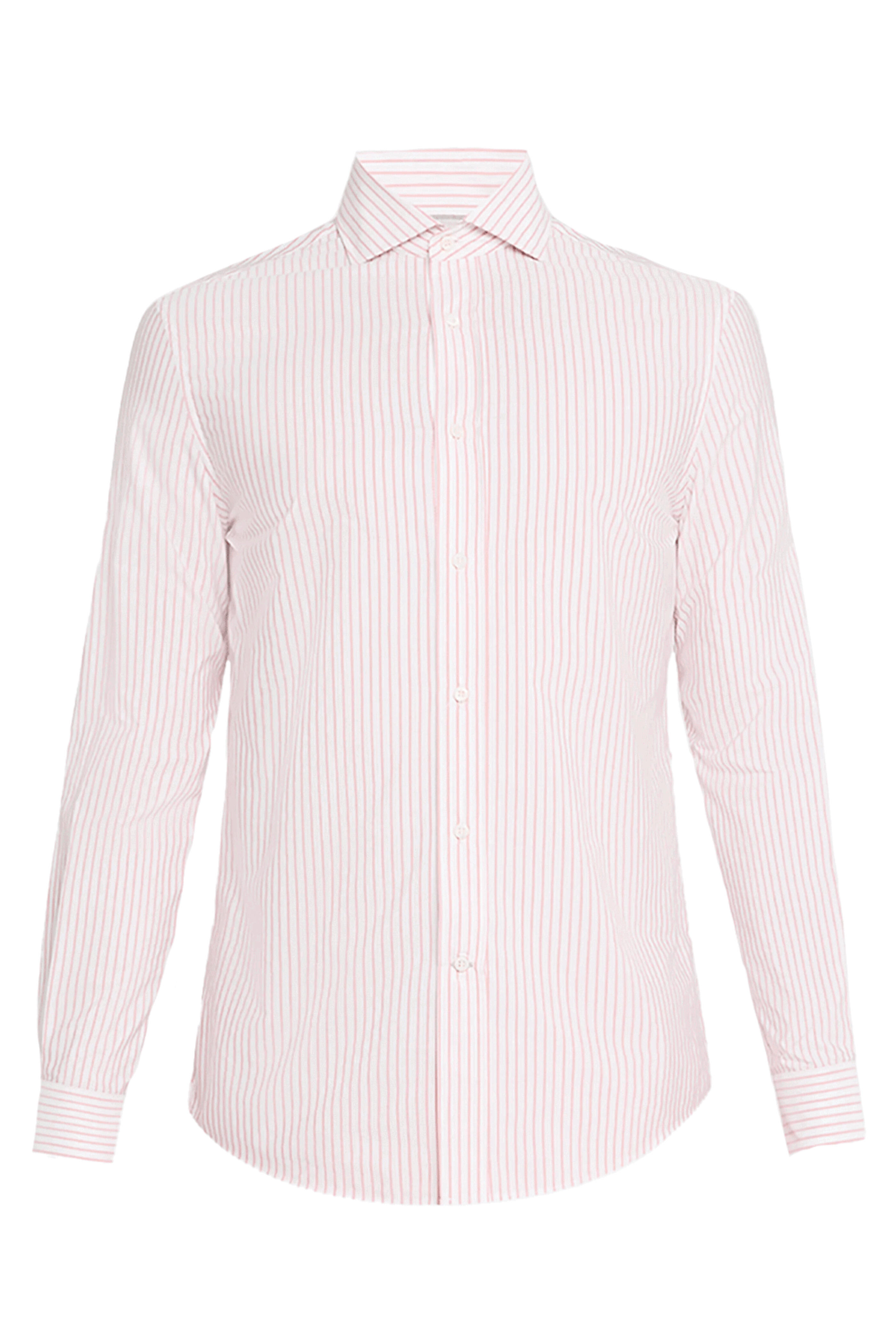 Spread collar. Button down front closure. Long sleeves. Mother-of-pearl buttons. Round barrel cuffs. Curved hem. Made in Italy . 100% cotton.