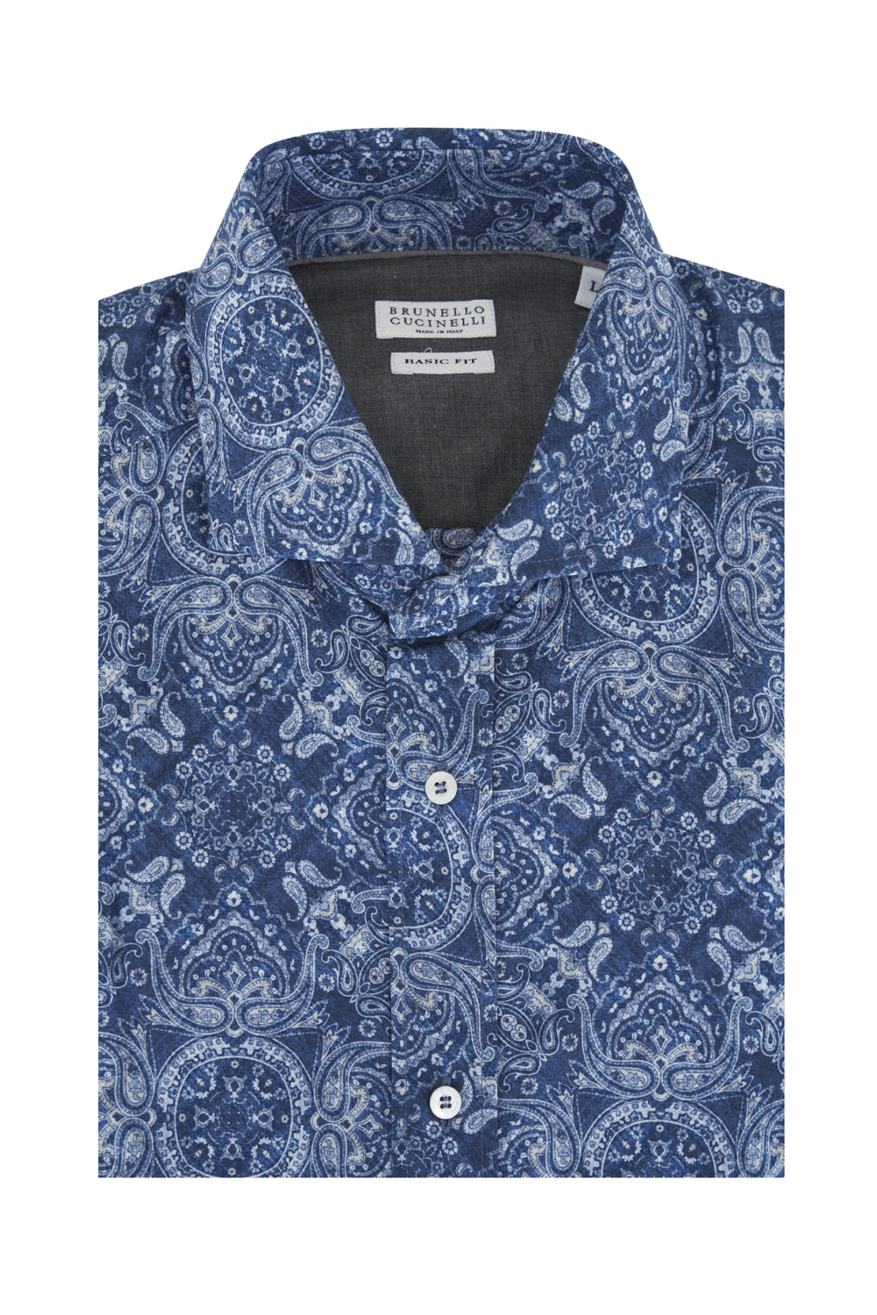 Brunello Cucinelli Blue Paisley Sportshirt. Spread collar. Button down front closure. Long sleeves. Double button cuffs. Basic fit. Made in Italy . 100% cotton.