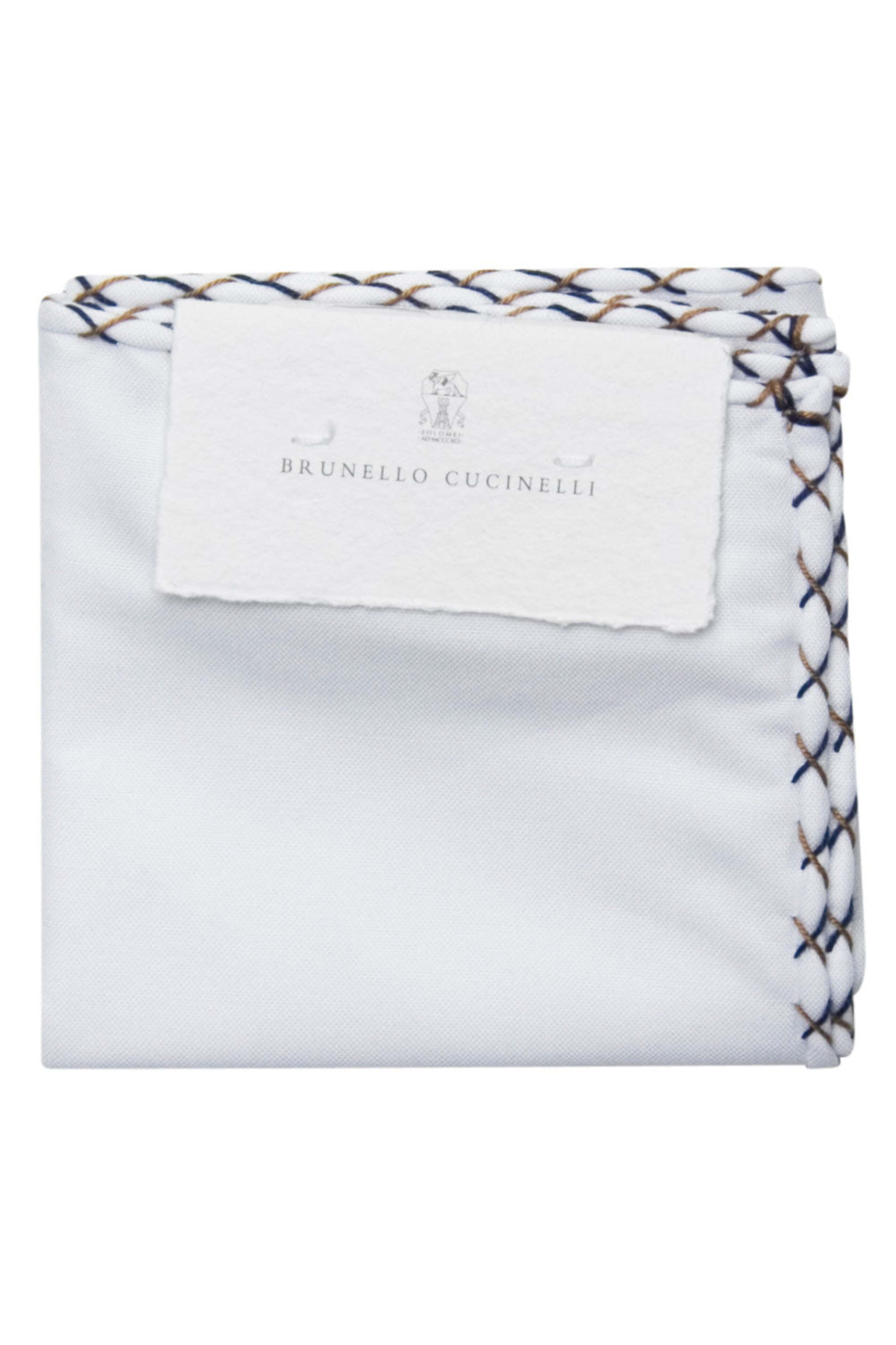 Brunello Cuccinelli Navy and Brown Border Pocket Square. Hand-rolled edges. 13.75 x 13.75. Made in Italy. 100% cotton.