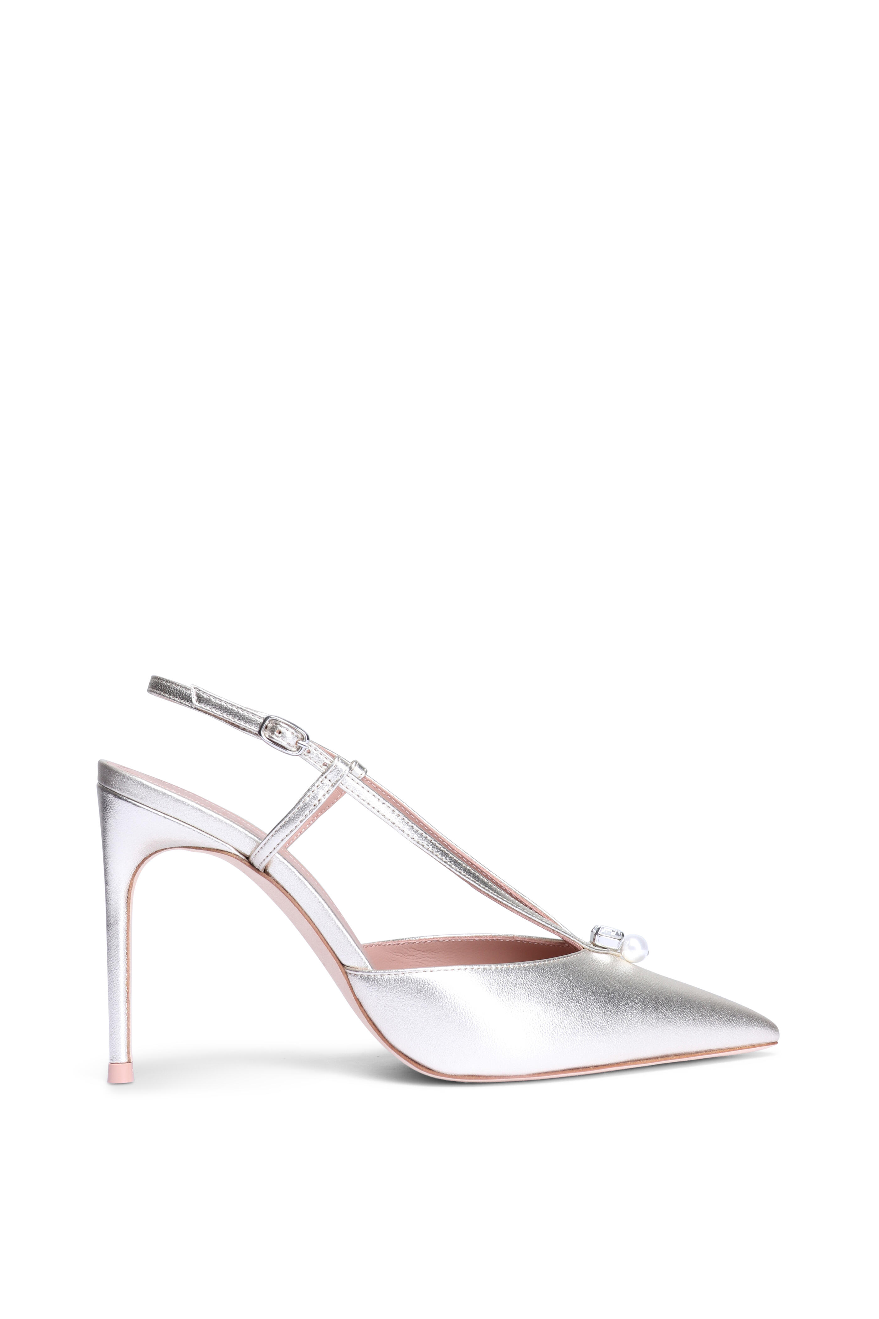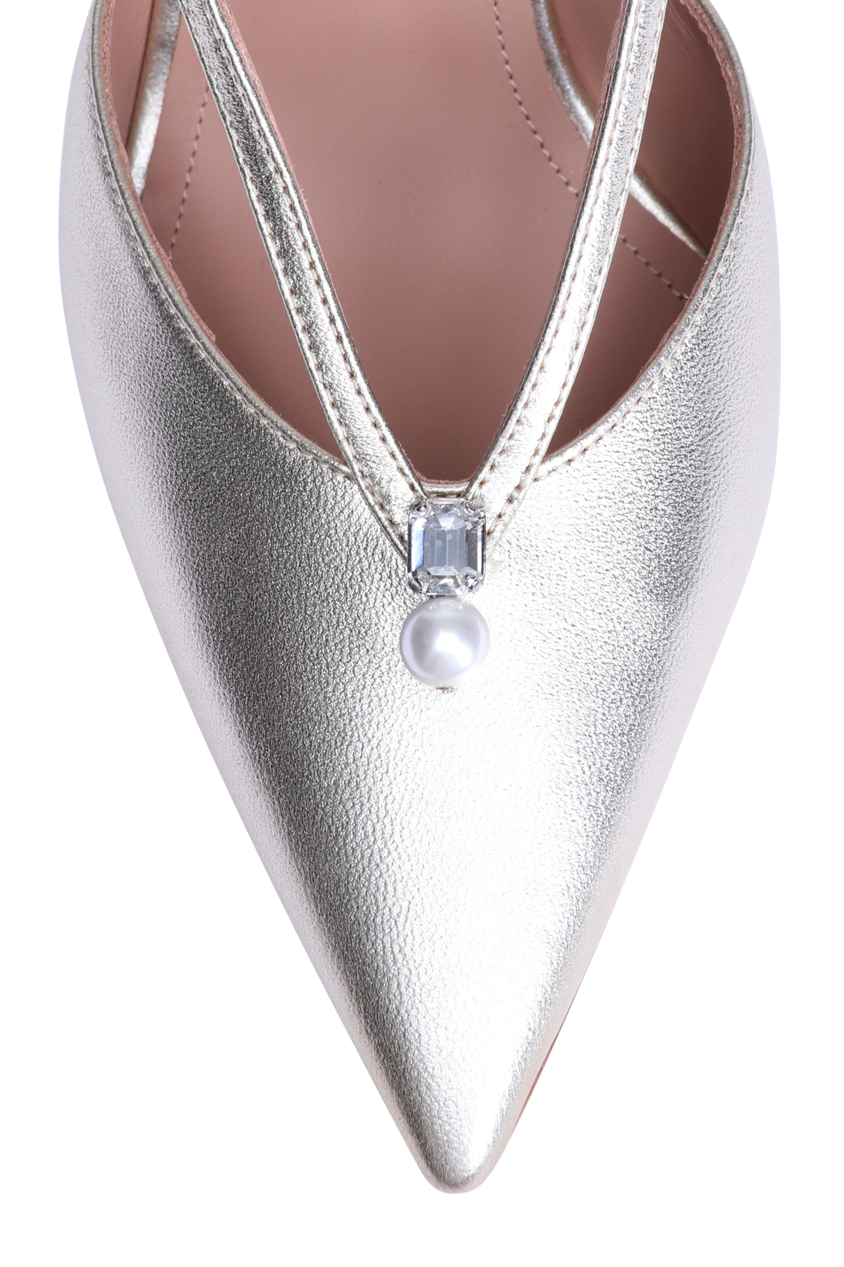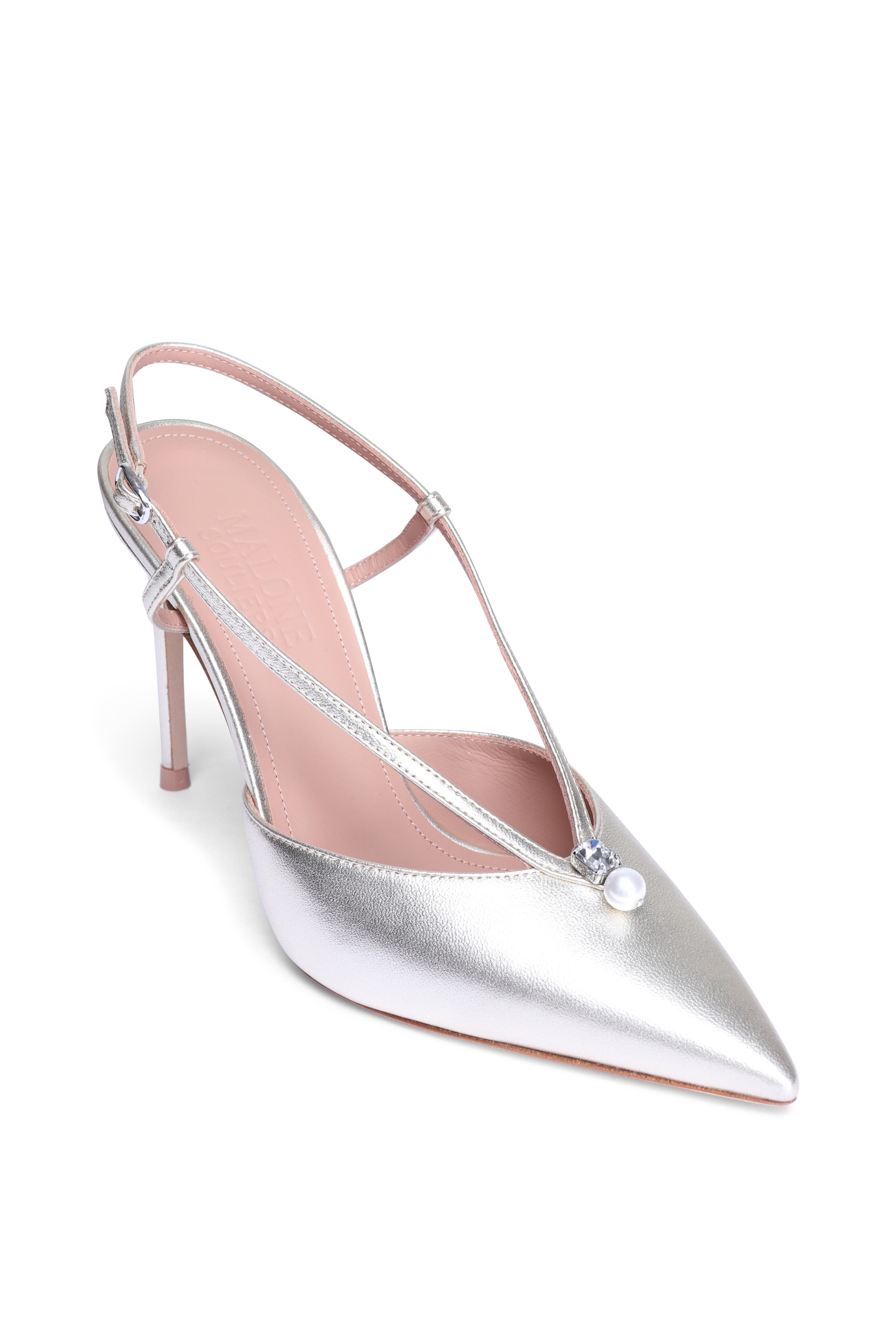 Metallic nappa leather upper. Leather lining and sole. Pointed toe. Slingback buckle strap. Slip-on style. Embellished faux pearl and emerald-cut crystal. Stiletto heel. Made in Italy. Heel measurement: 90mm.