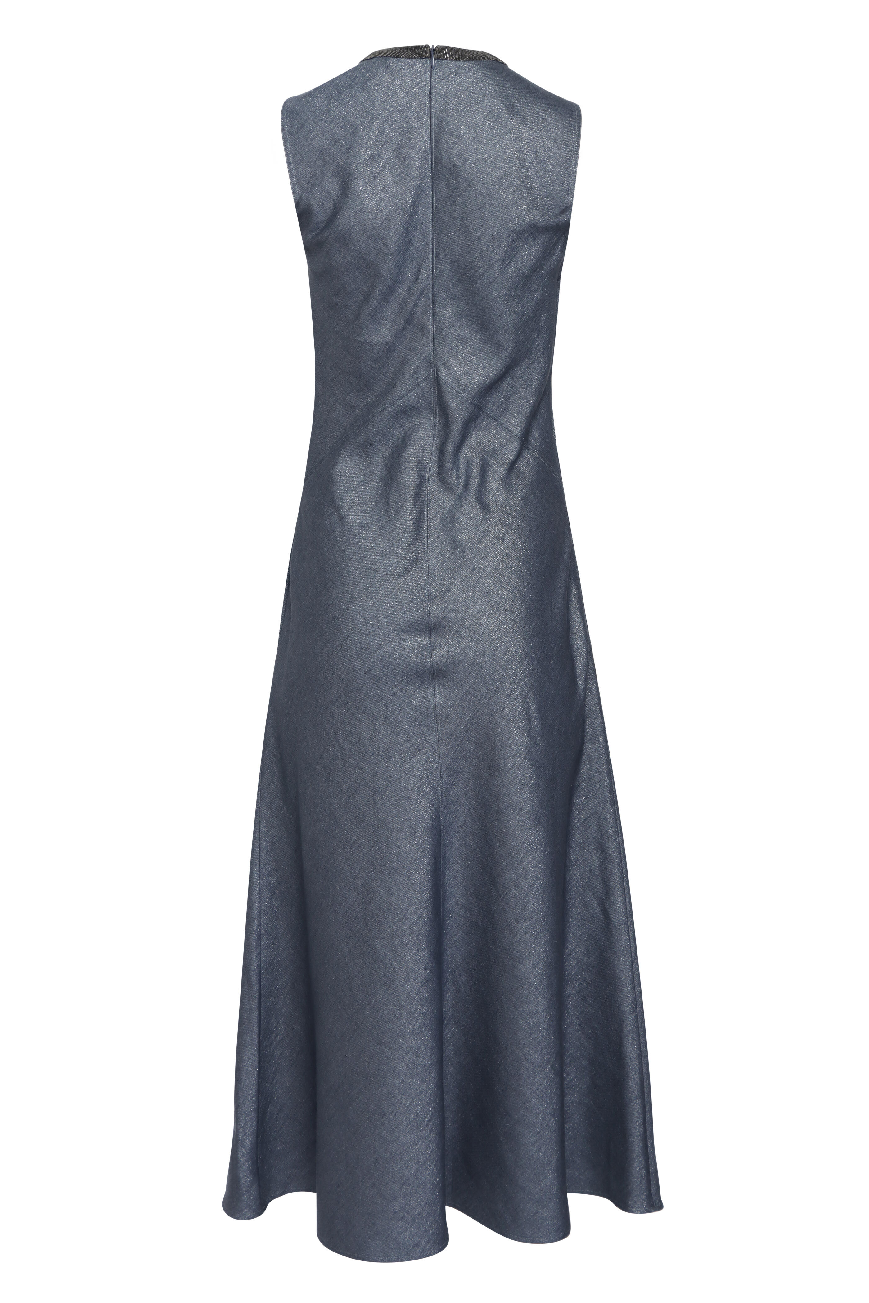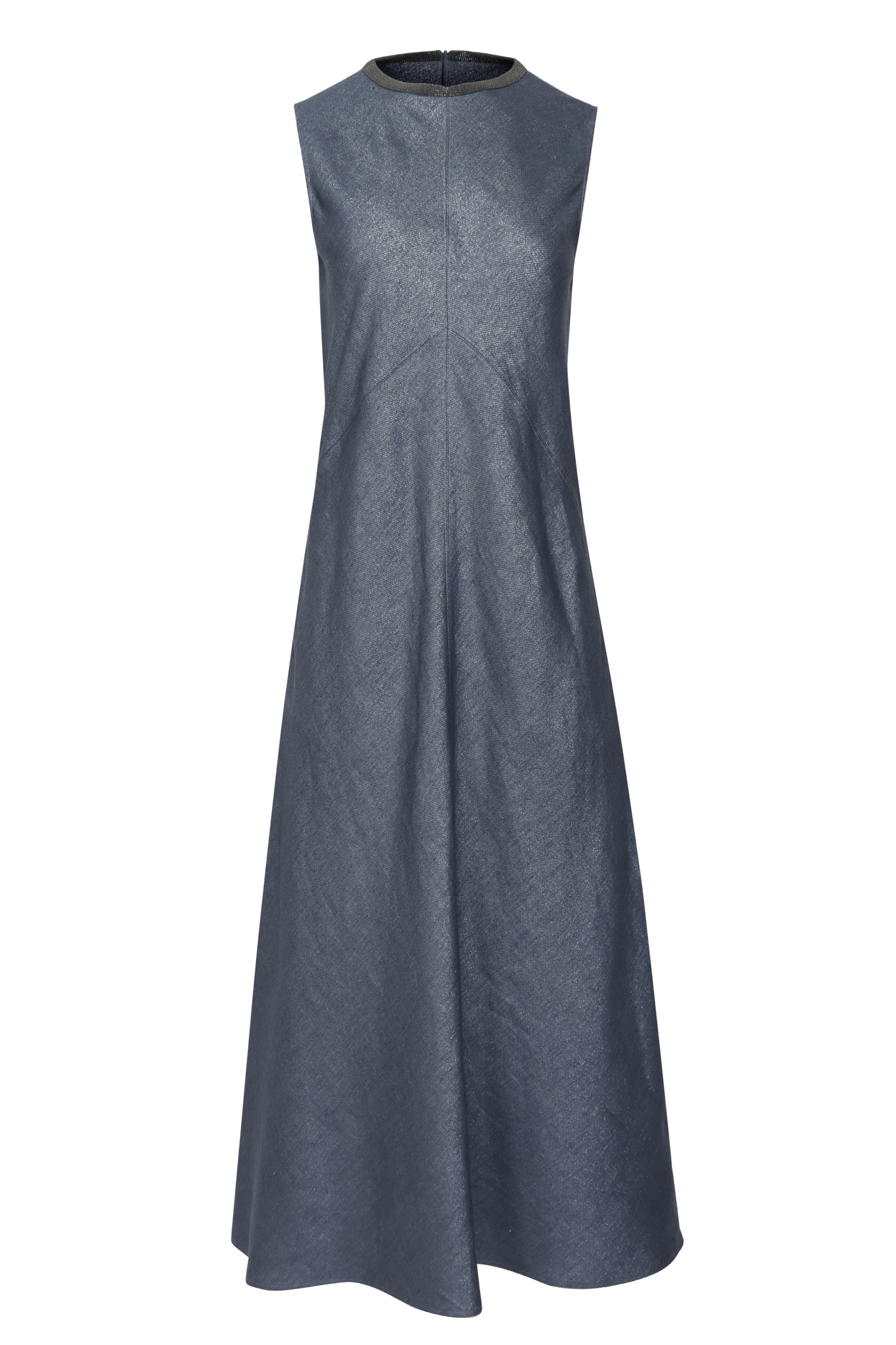 Round neck; monili detail. Sleeveless. Concealed back zip closure. Aline silhouette. Made in Italy. Midi length. Dry clean.