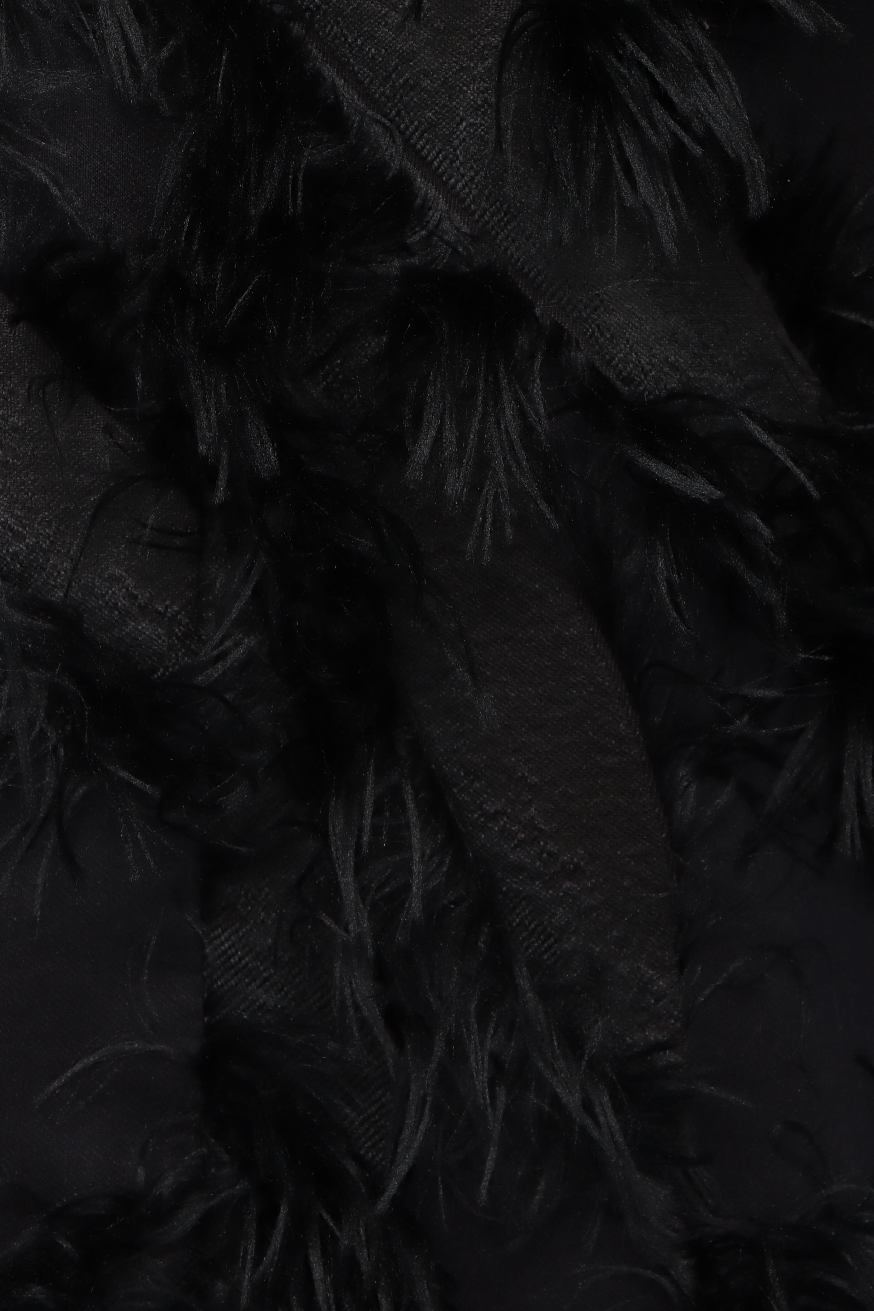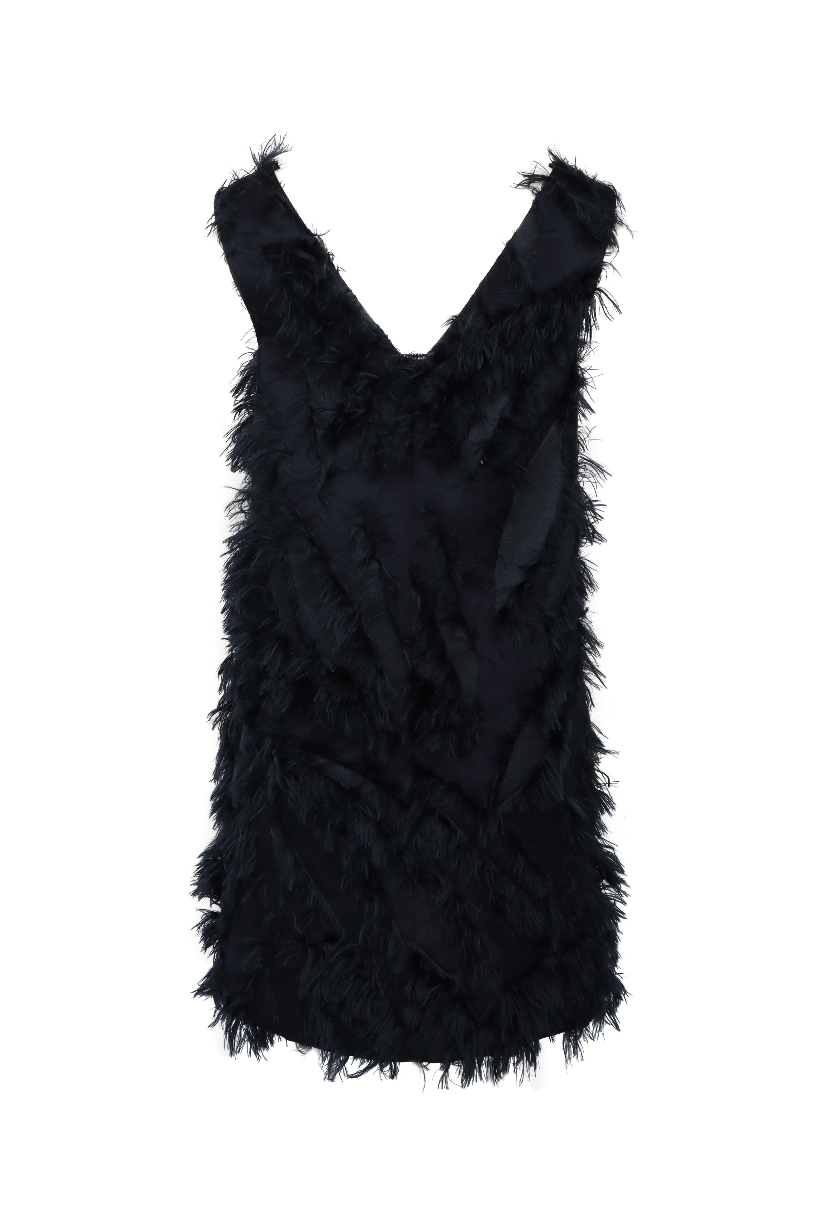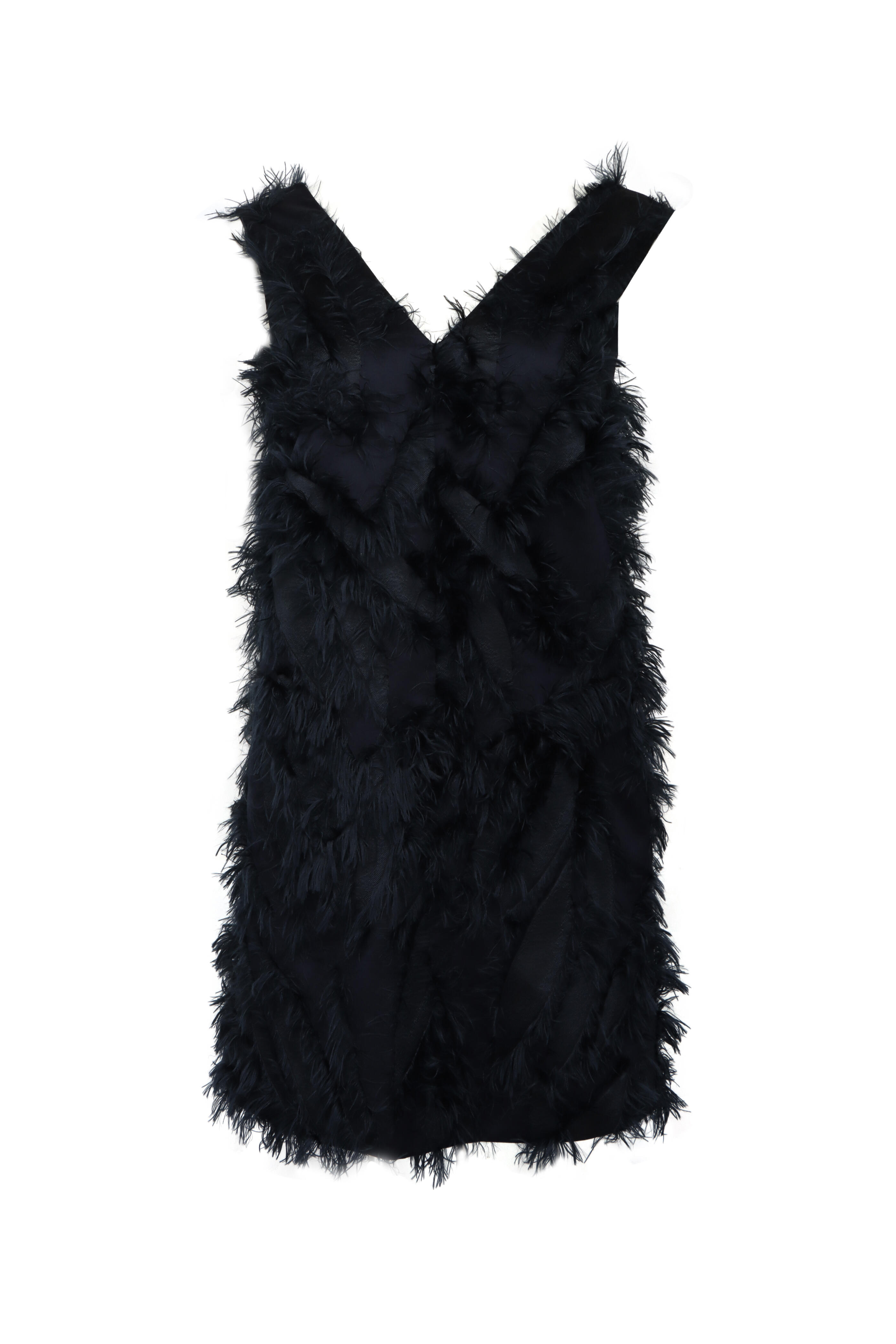 V neck. V back. Sleeveless. Shift silhouette. Fringe detail throughout. Made in Italy. Mini length. 67% polyester, 22% cotton, 11% silk outer, 74% acetate, 26% silk lining. Dry clean.